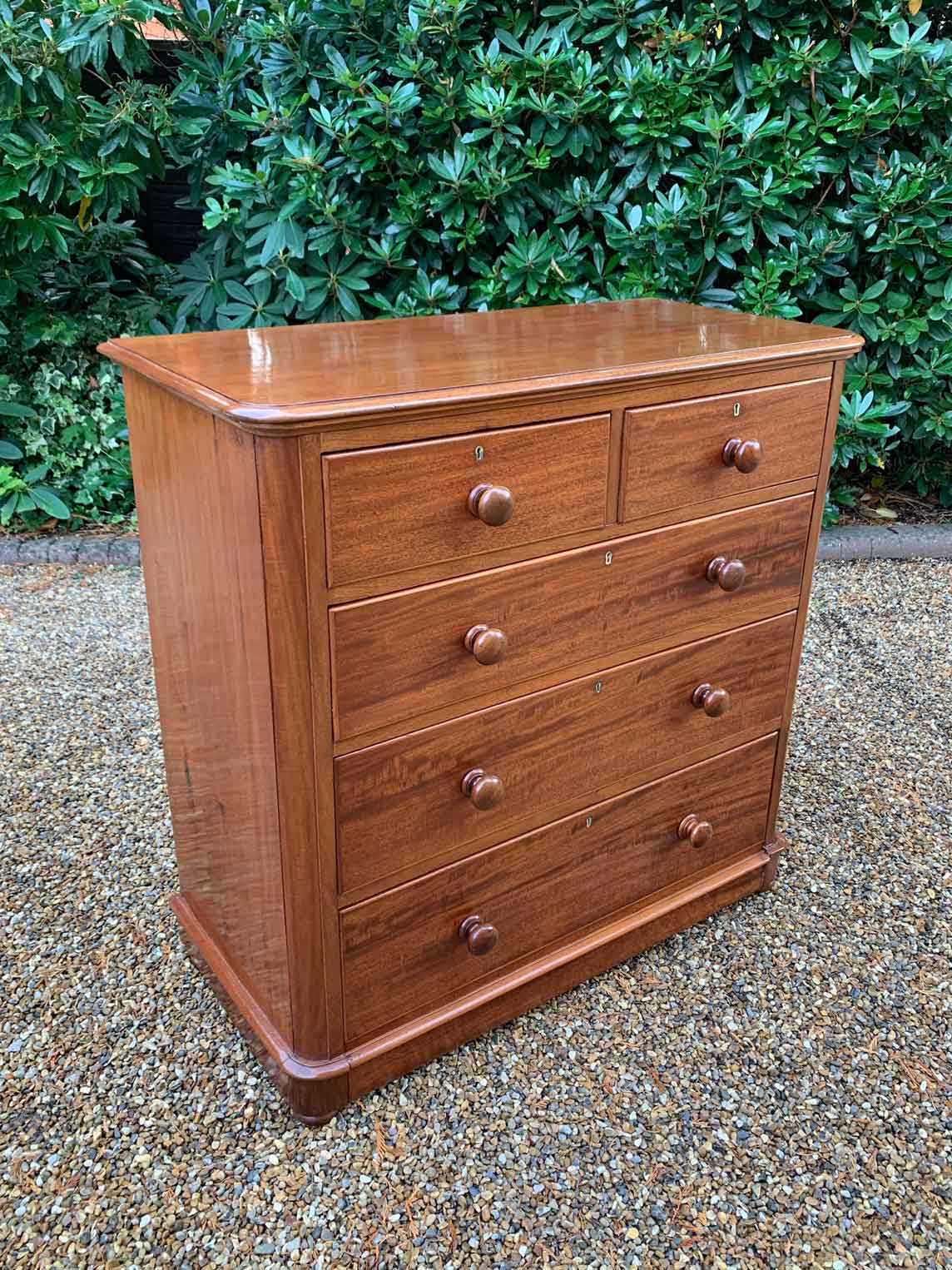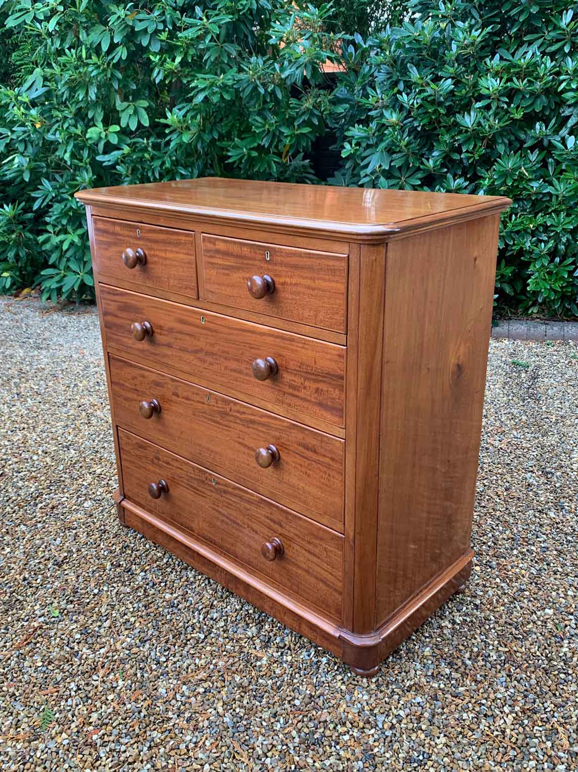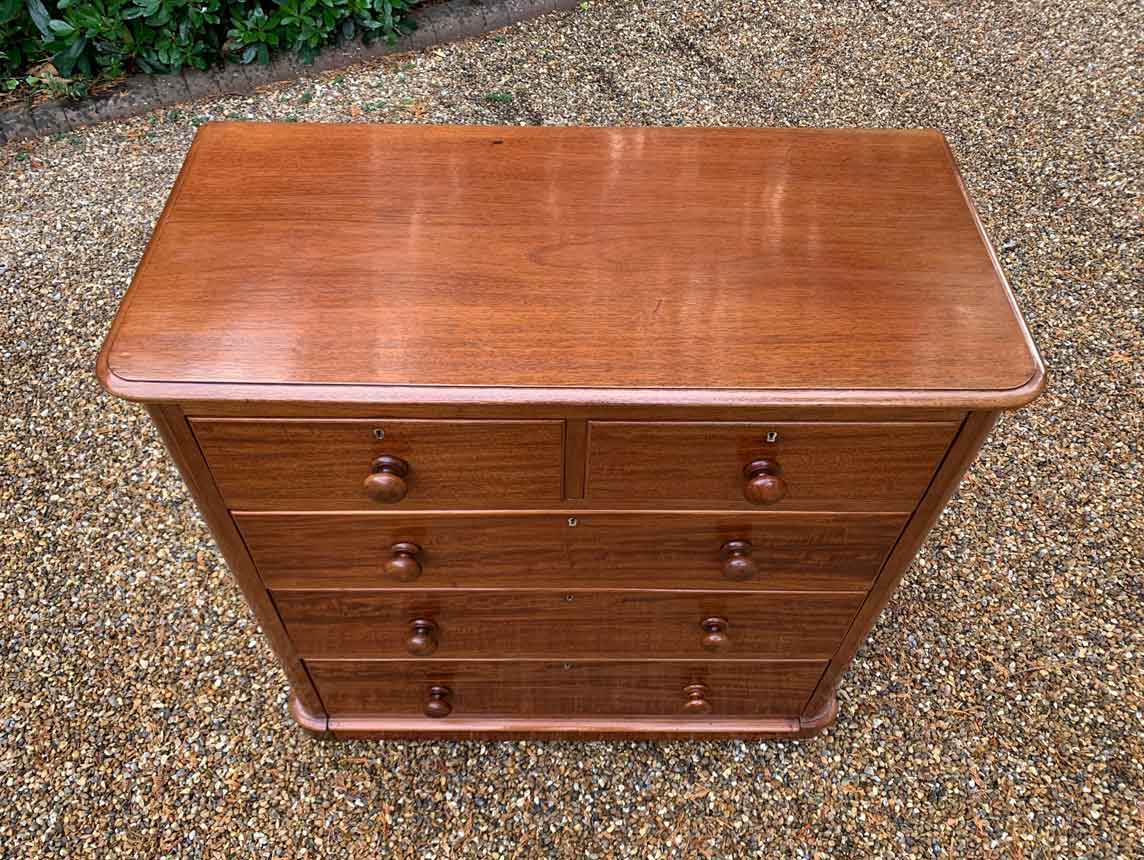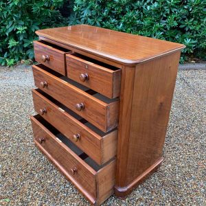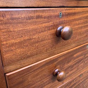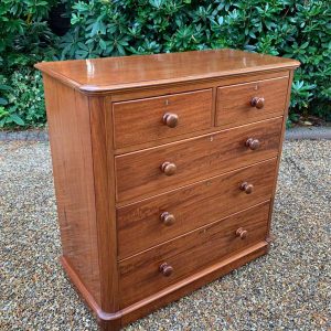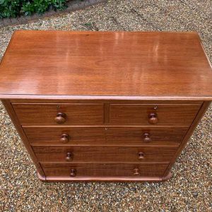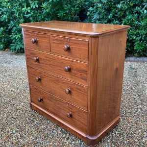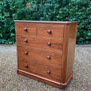 19th Century Victorian Mahogany Chest Of Drawers with two short, three long solid mahogany drawers with bun handles, raised on a platform base.