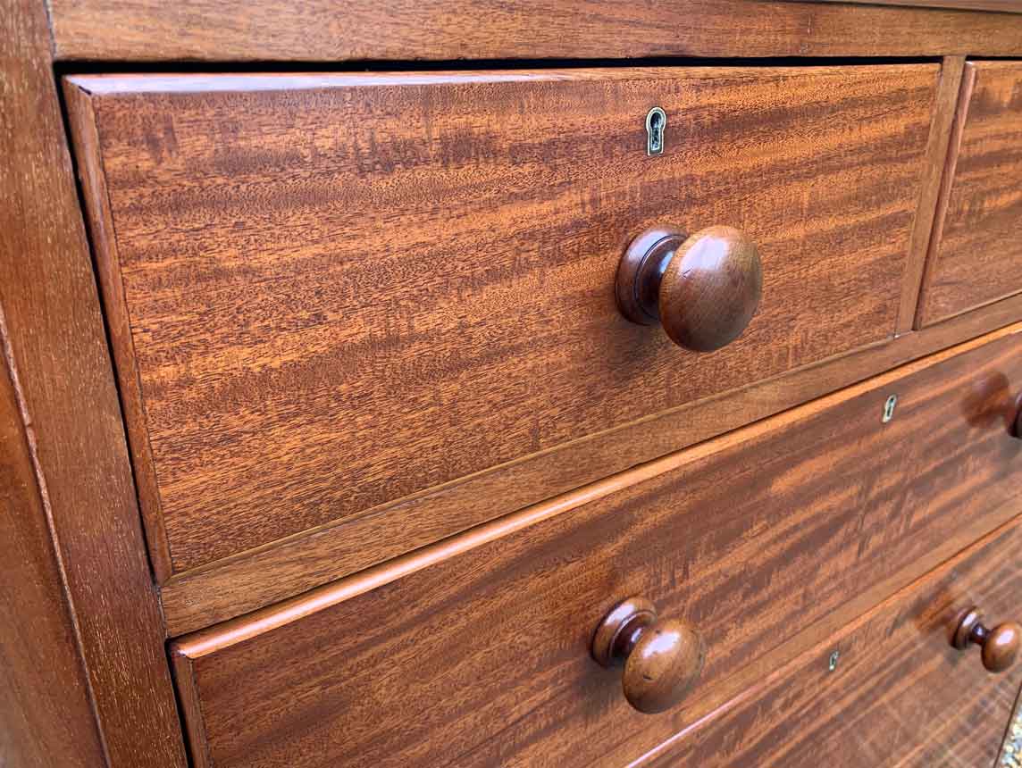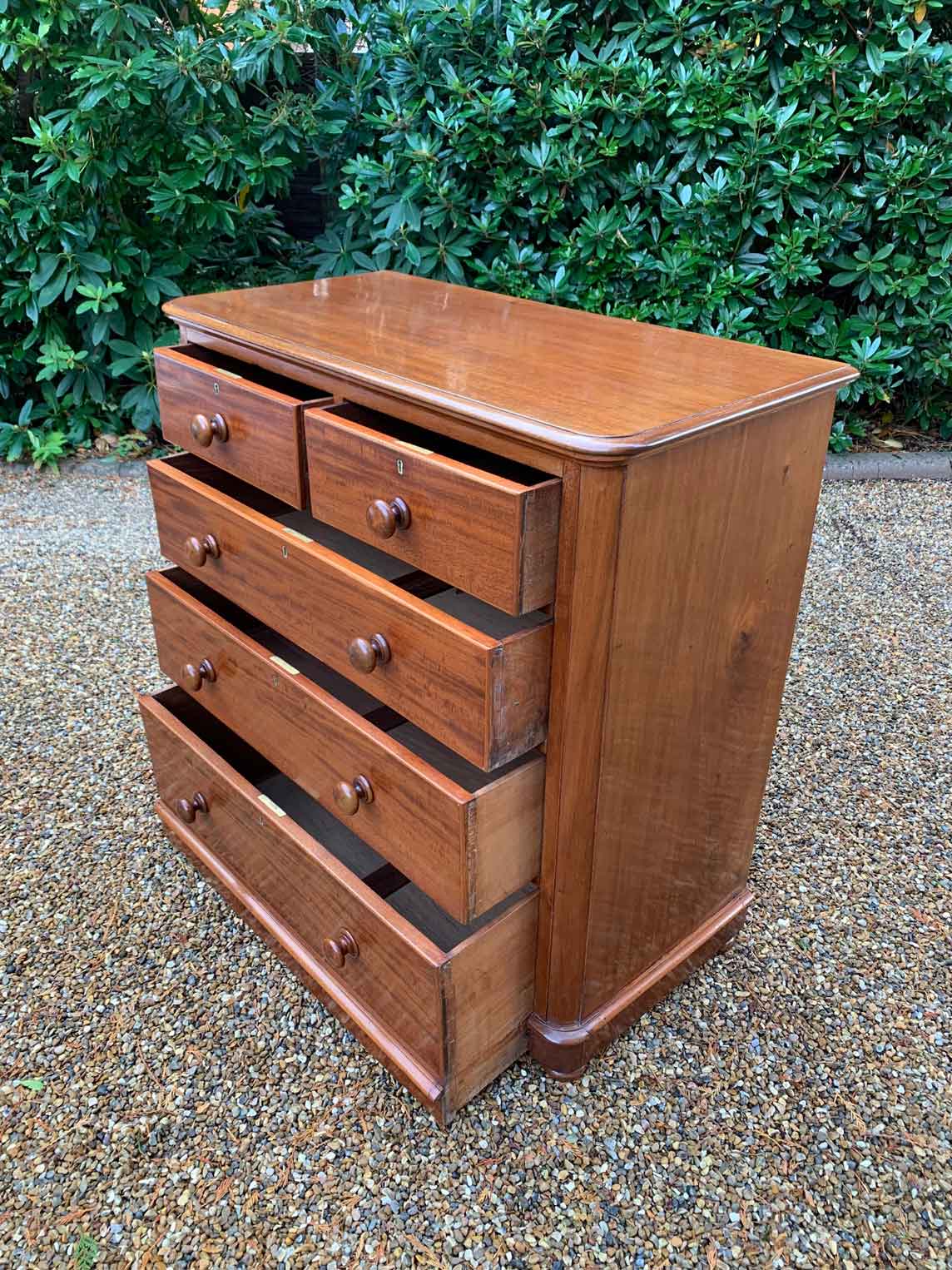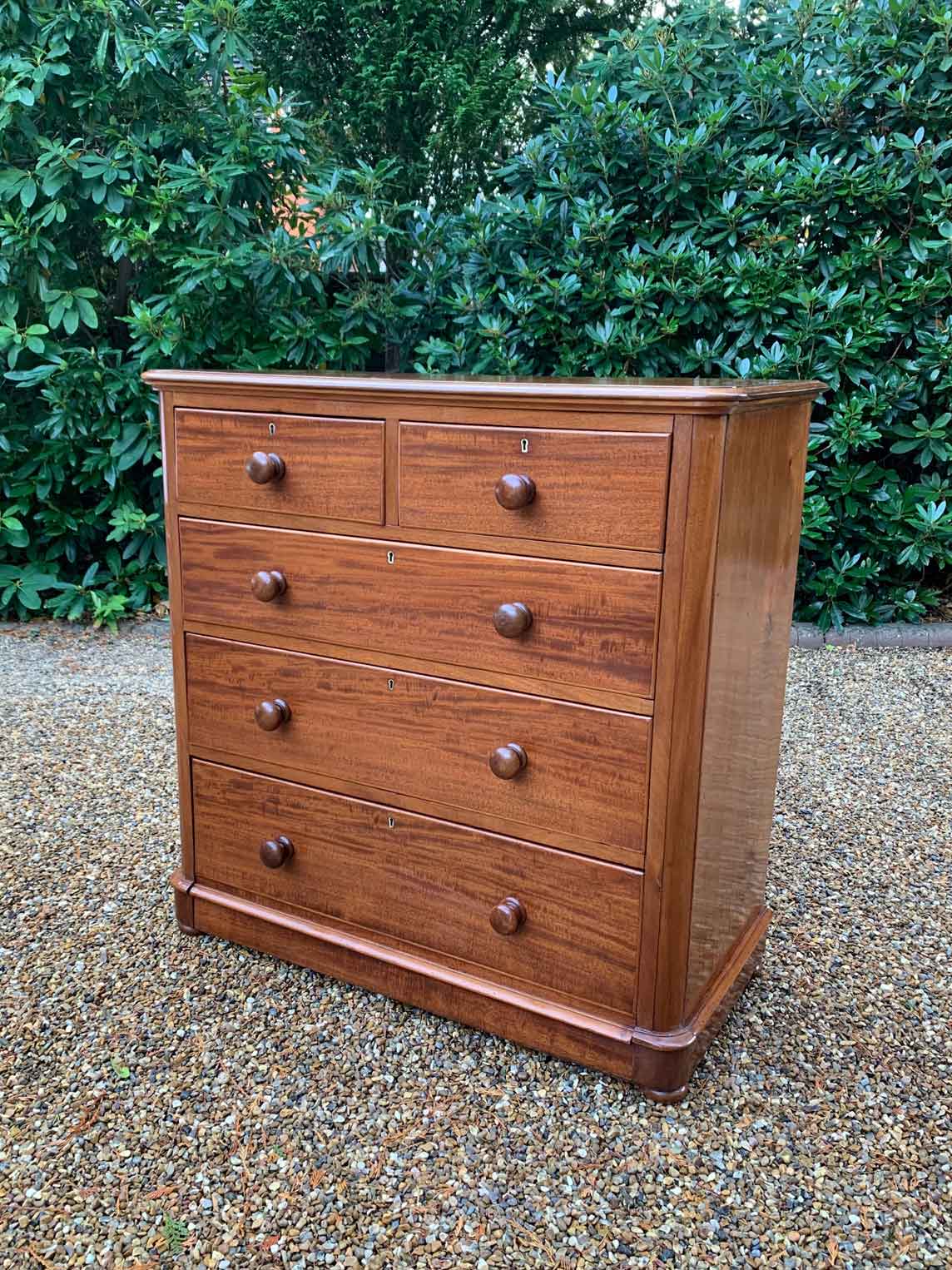 19th Century Victorian Mahogany Chest Of Drawers with two short, three long solid mahogany drawers with bun handles, raised on a platform base.