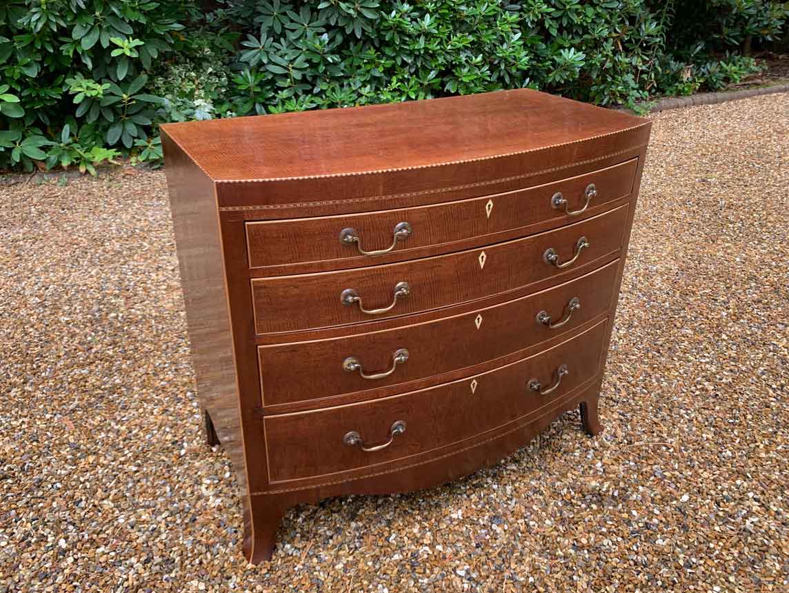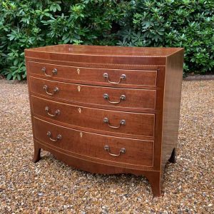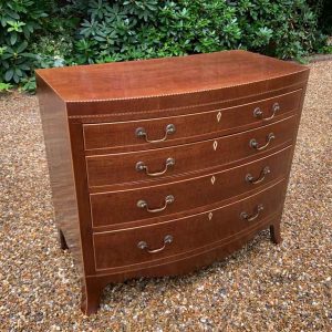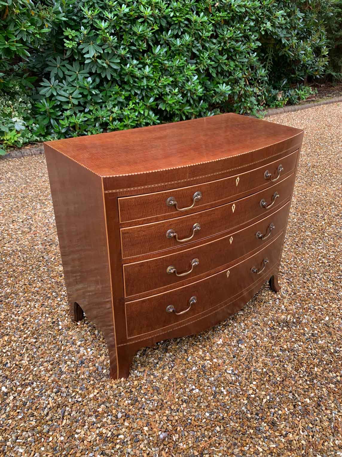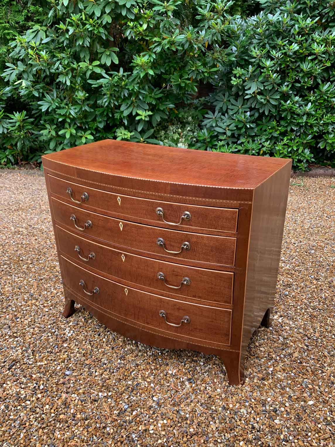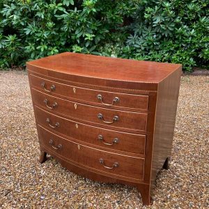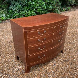 A very high quality 19th Century Georgian Mahogany Bow Fronted Chest Of Drawers with fiddleback veneer throughout with inlay. Four long oak lined graduating drawers with brass swan neck handles and splayed feet.