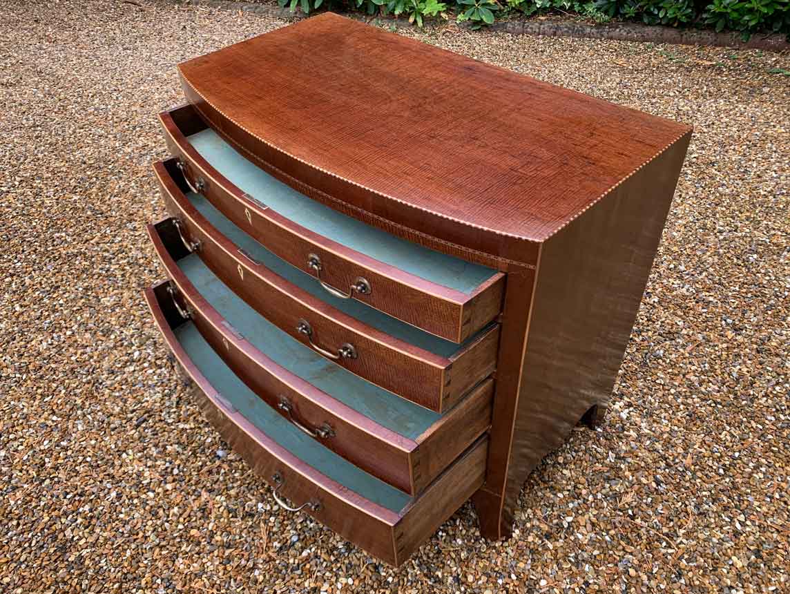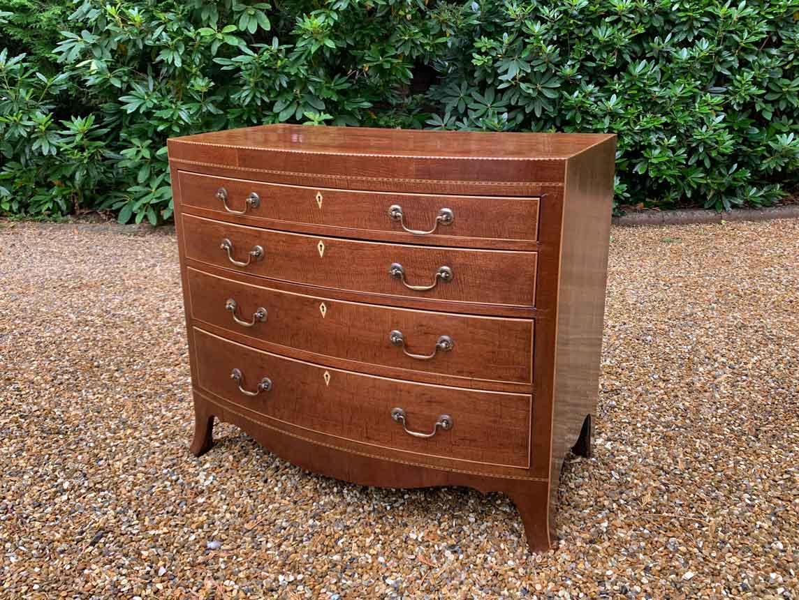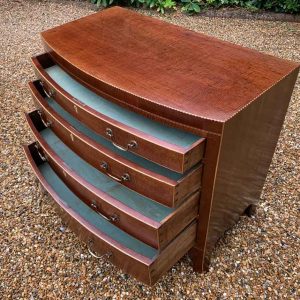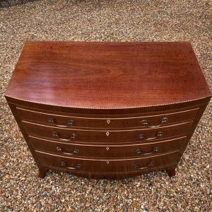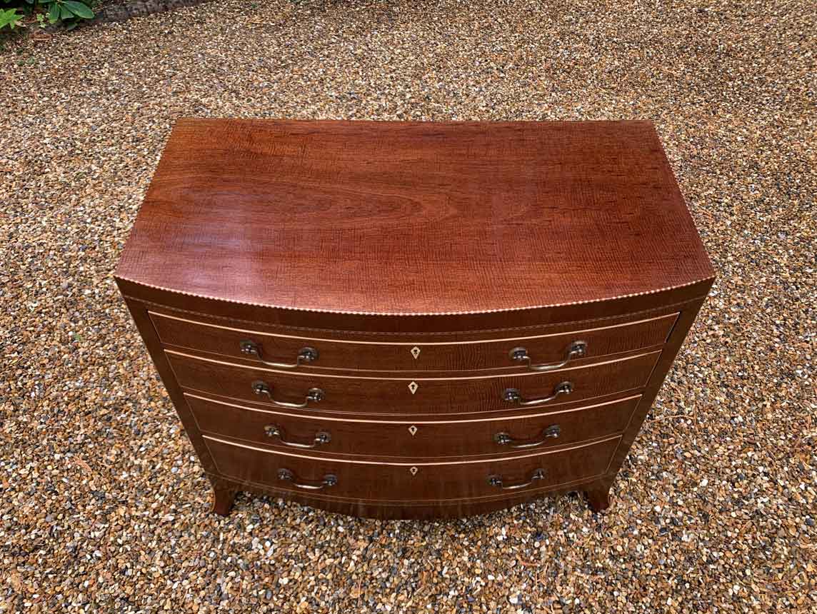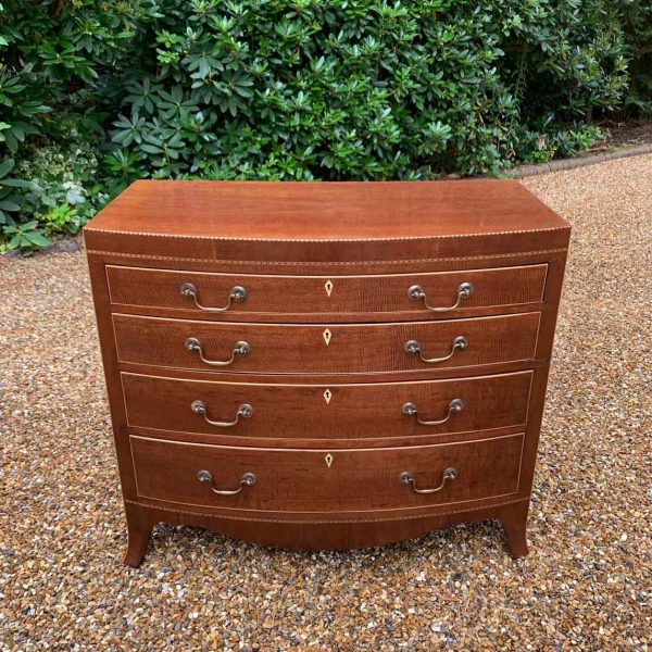A very high quality 19th Century Georgian Mahogany Bow Fronted Chest Of Drawers with fiddleback veneer throughout with inlay. Four long oak lined graduating drawers with brass swan neck handles and splayed feet.