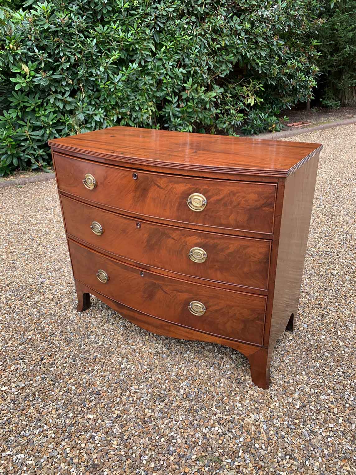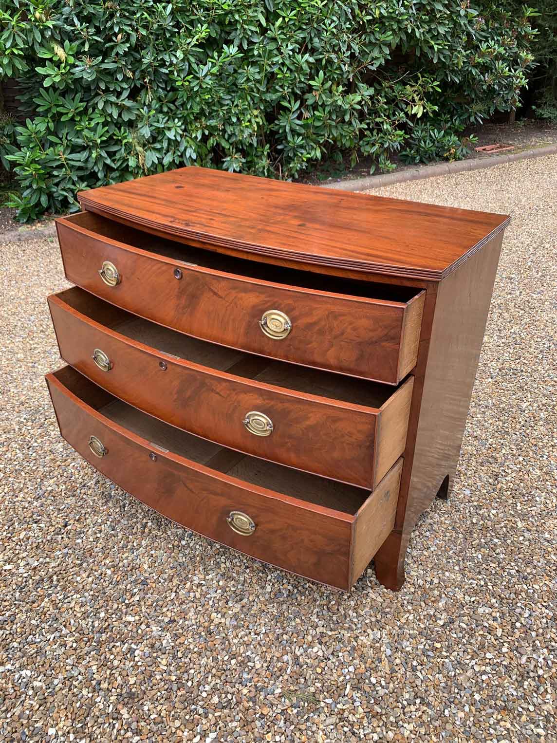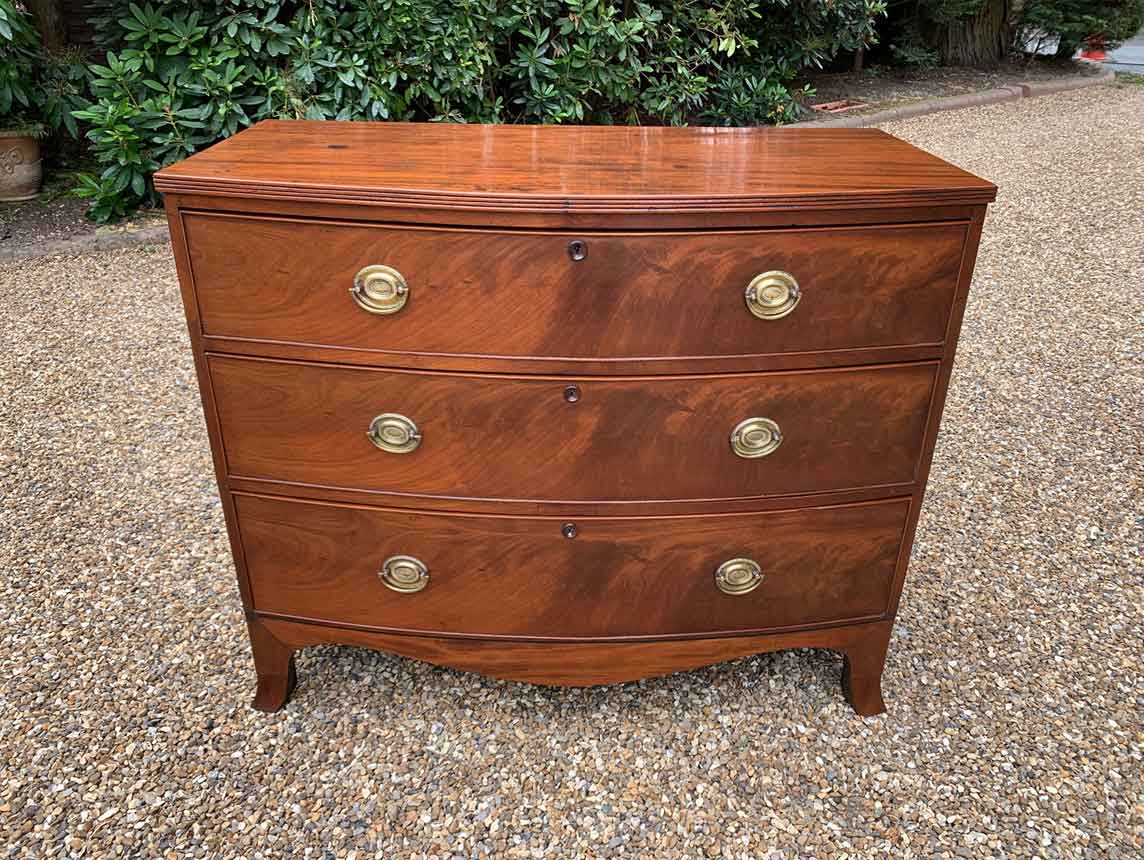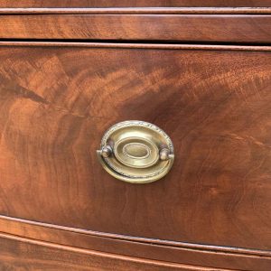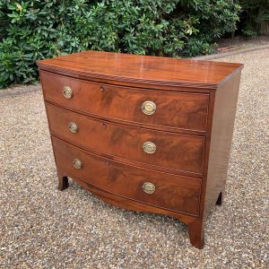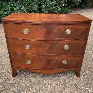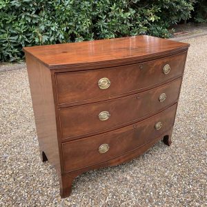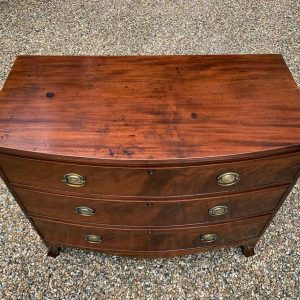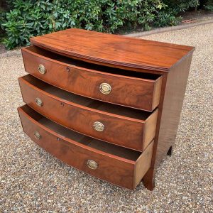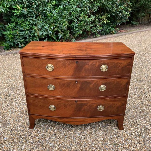 19th Century Georgian / Regency Mahogany Bowfront Chest Of Drawers, with three long graduated oak lined drawers with oval brass handles, on splayed feet.