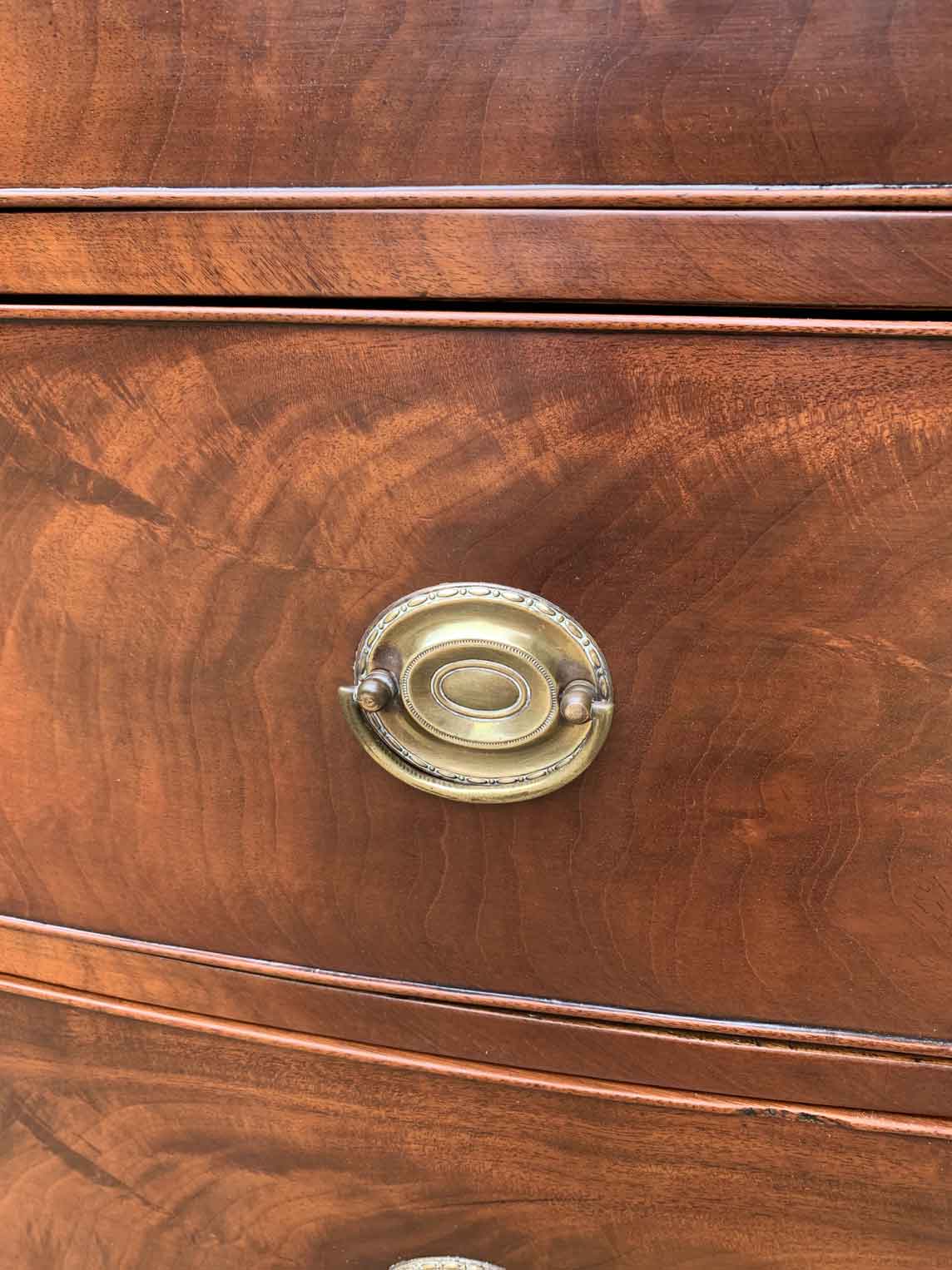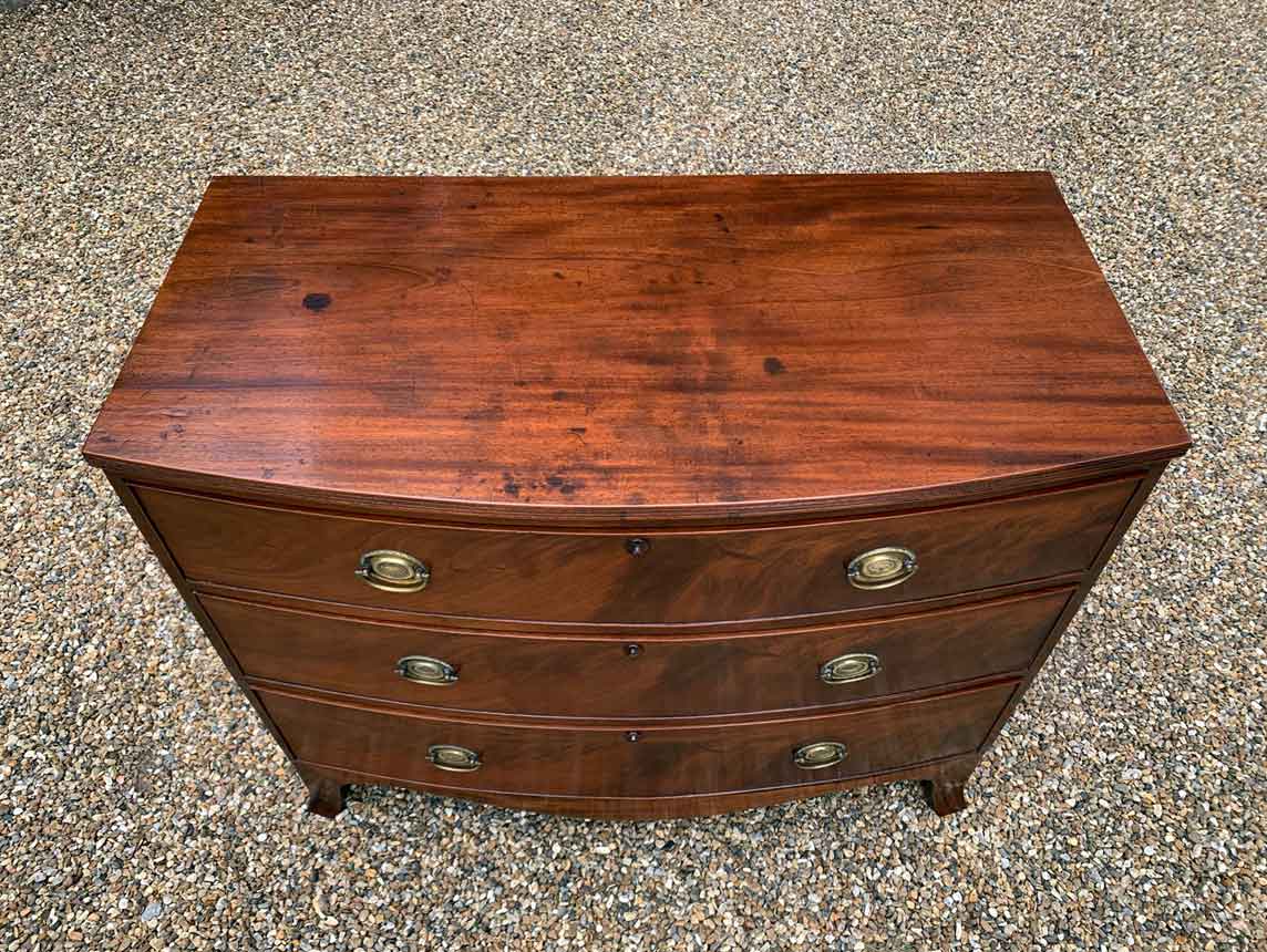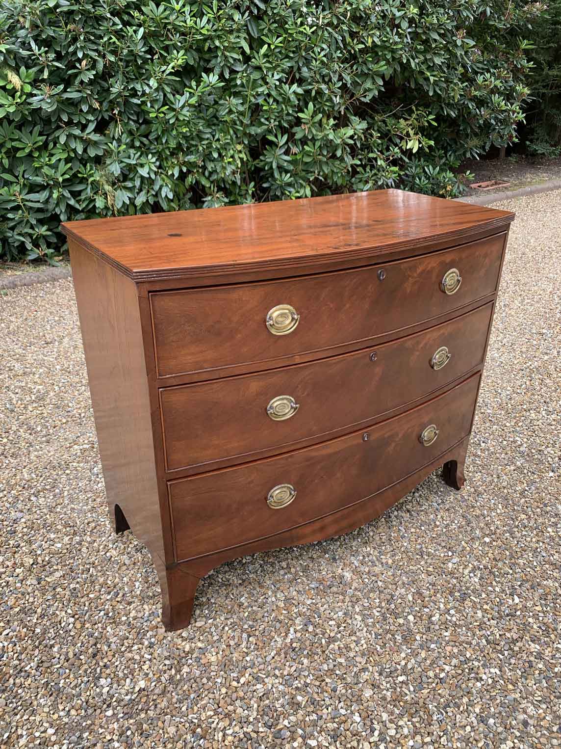 19th Century Georgian / Regency Mahogany Bowfront Chest Of Drawers, with three long graduated oak lined drawers with oval brass handles, on splayed feet.