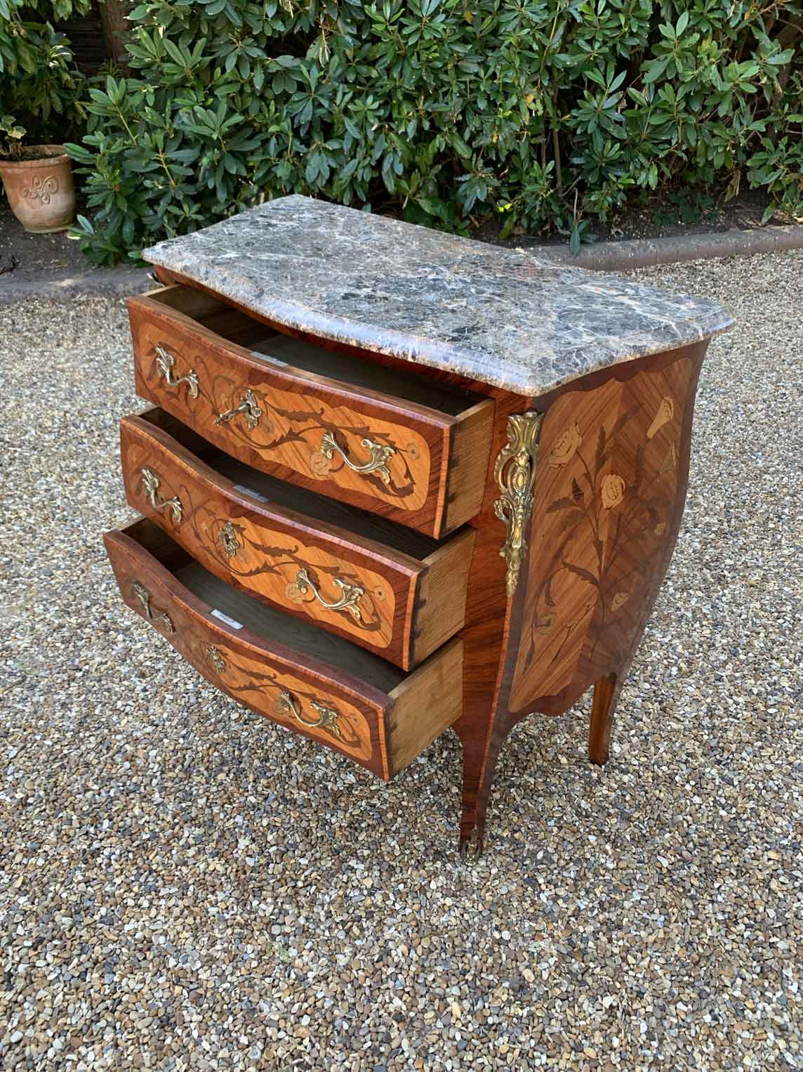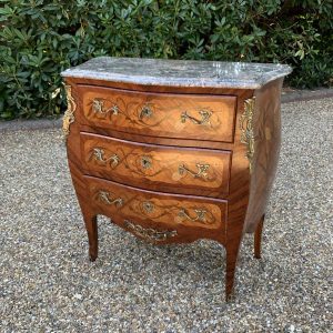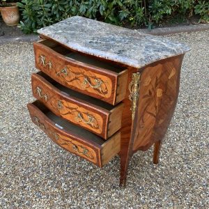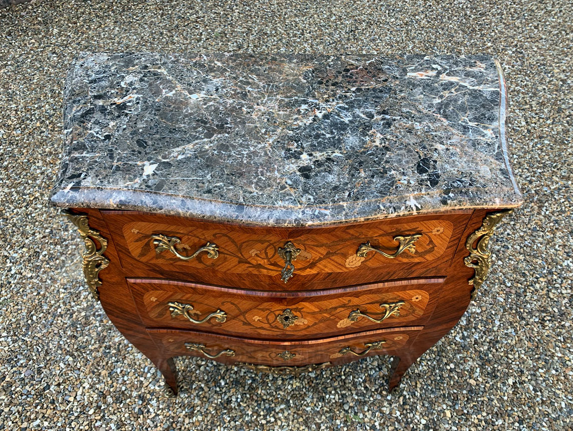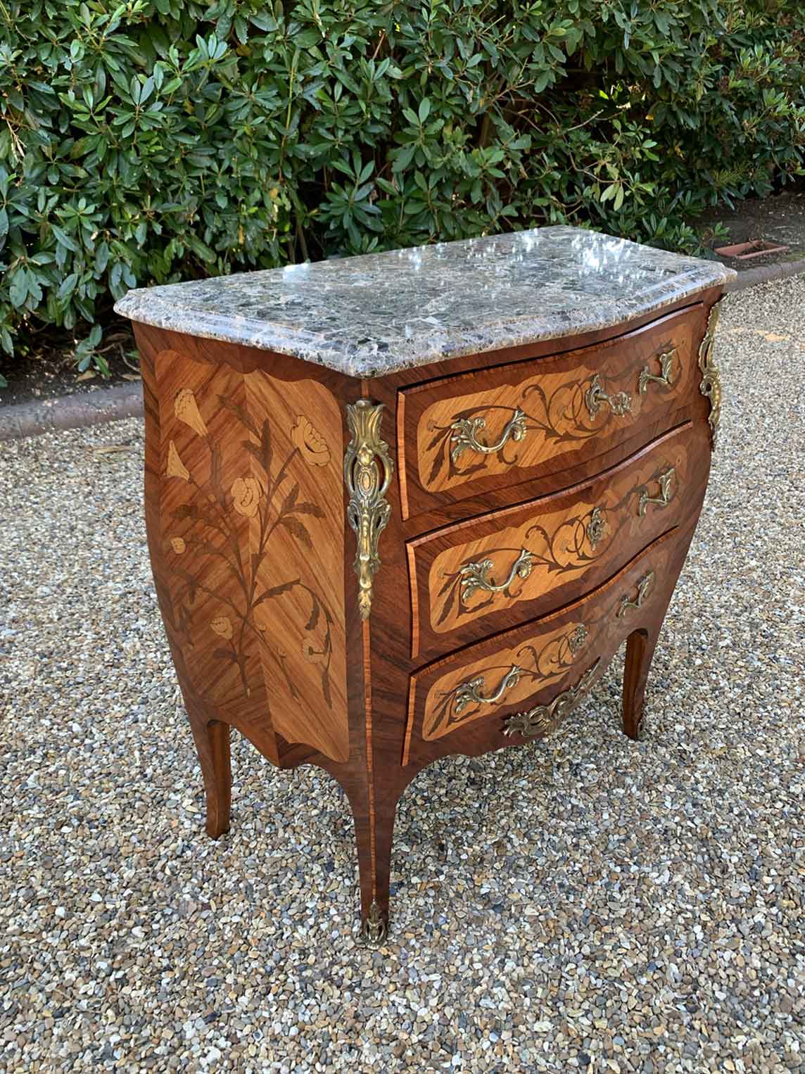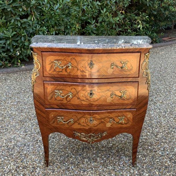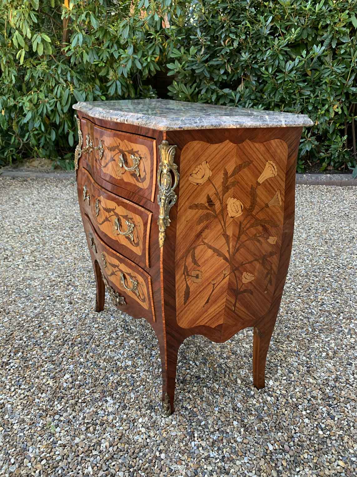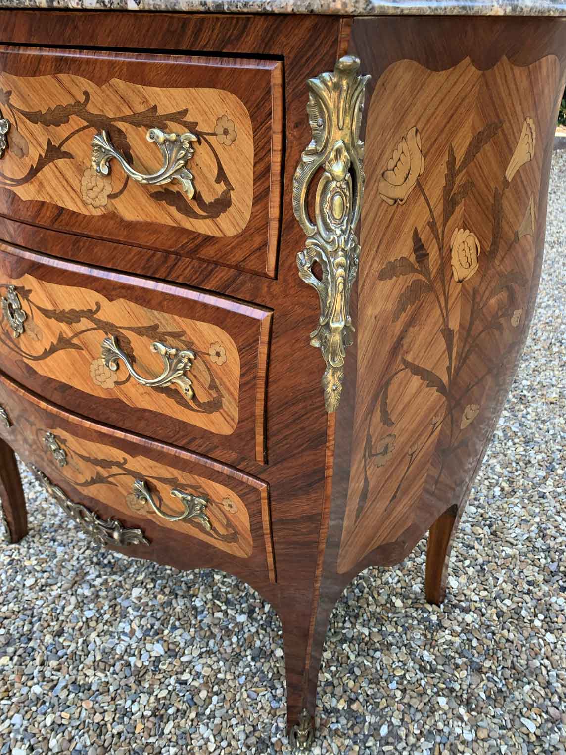 Very high quality Antique French Serpentine Bombe Commode / Chest Of Drawers in Louis XV Style with original Marble top. With Kingwood and floral marquetry with solid walnut drawers and rococo ormolu handles and on the cabriole legs to the sabot feet, With original working key.