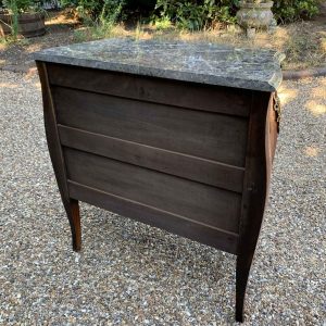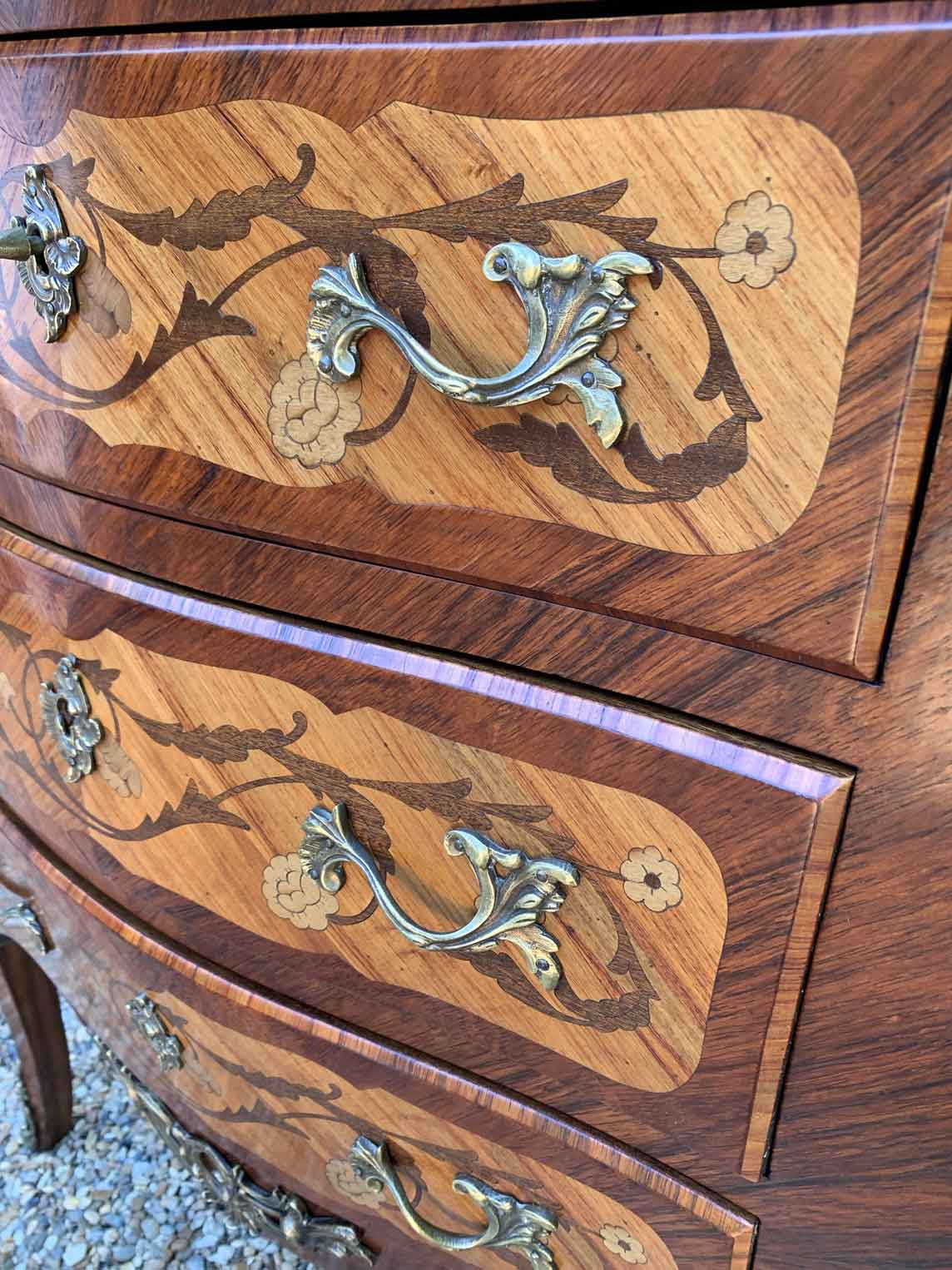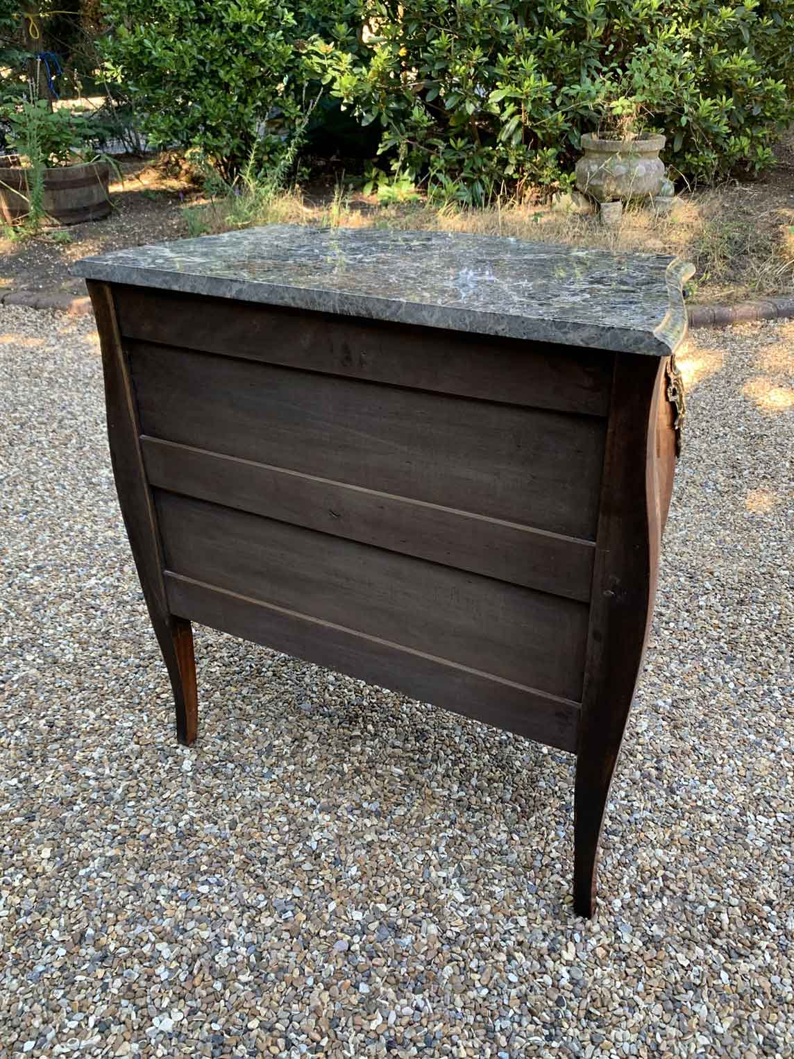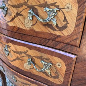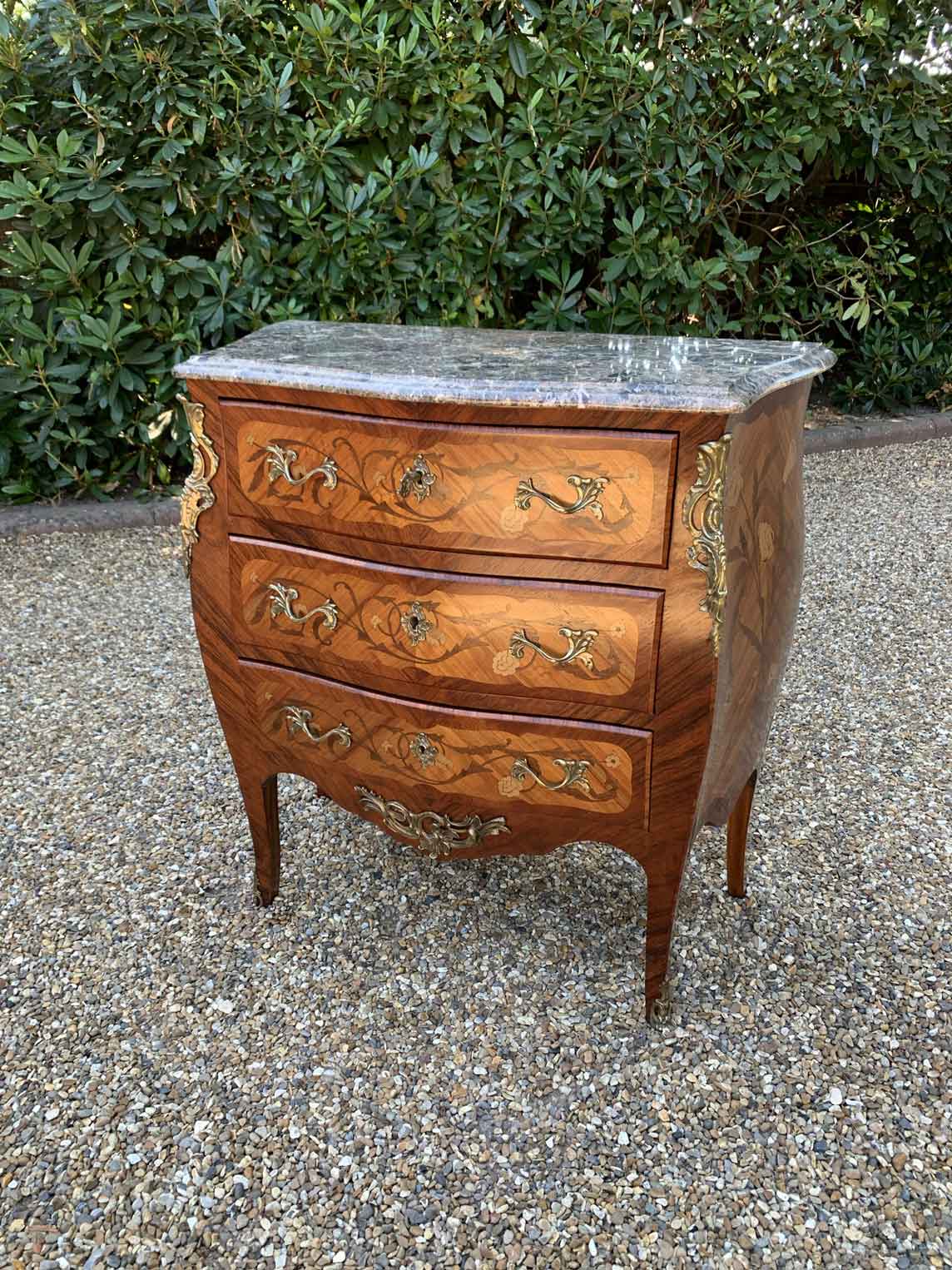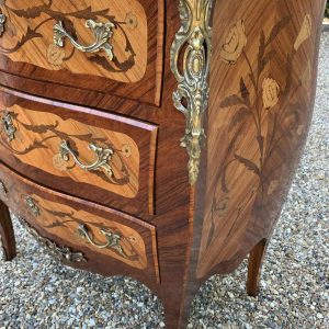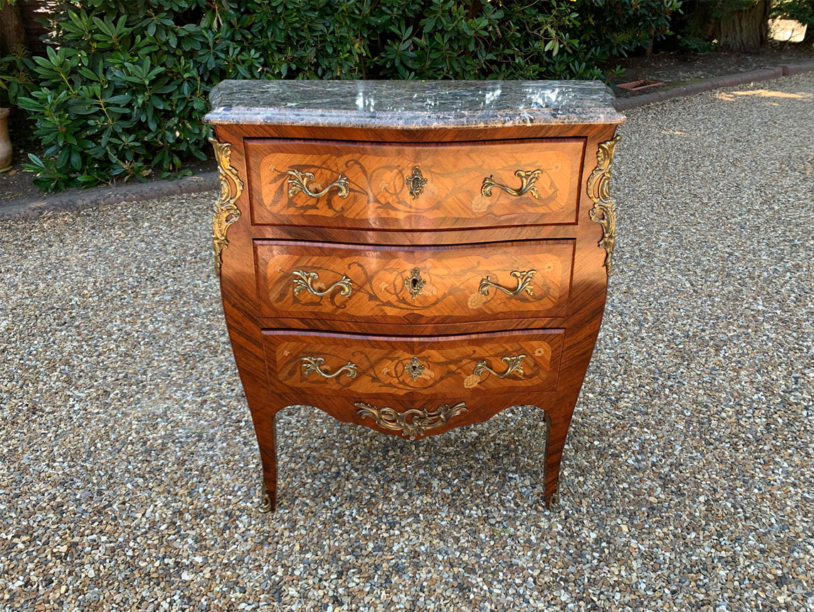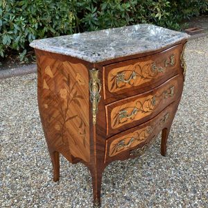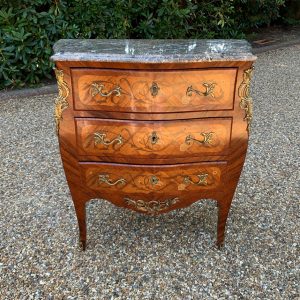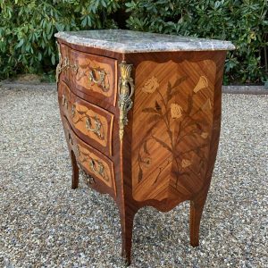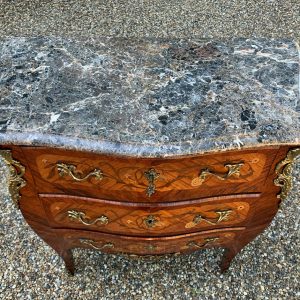 Very high quality Antique French Serpentine Bombe Commode / Chest Of Drawers in Louis XV Style with original Marble top. With Kingwood and floral marquetry with solid walnut drawers and rococo ormolu handles and on the cabriole legs to the sabot feet, With original working key.