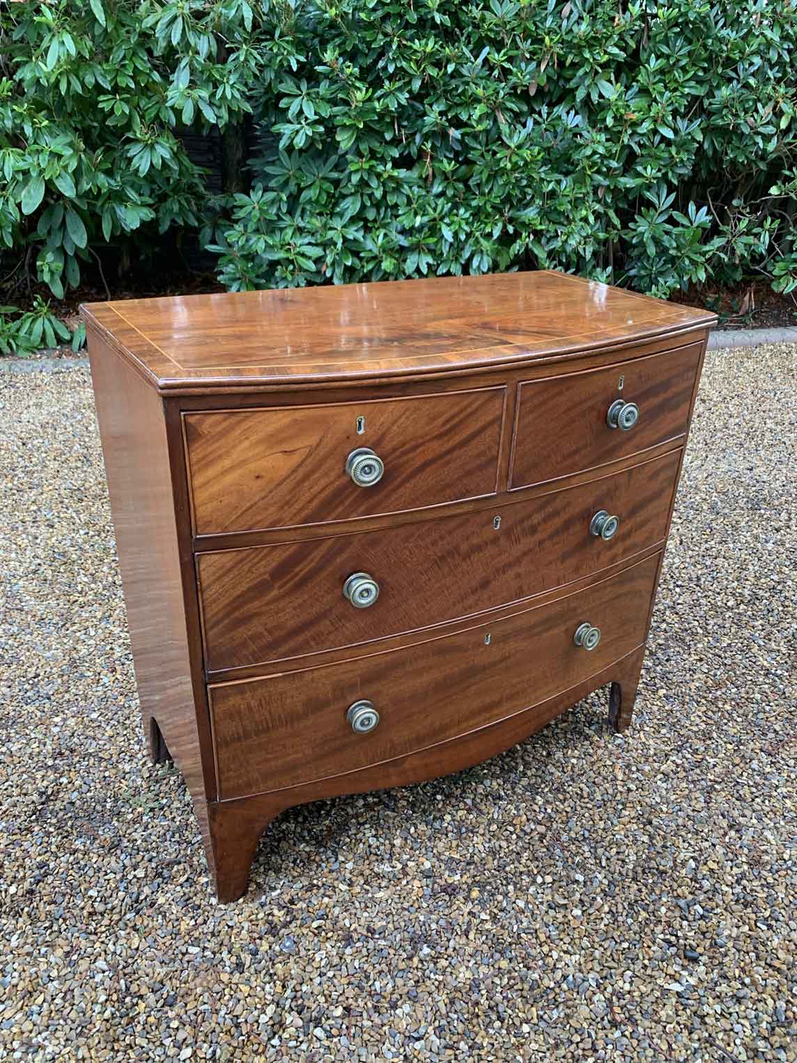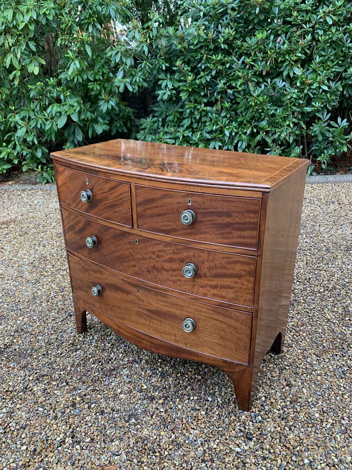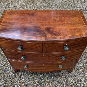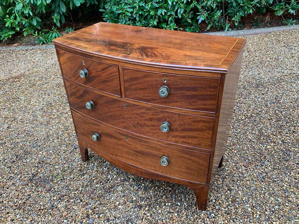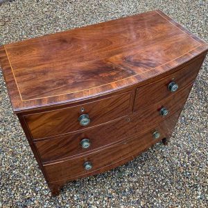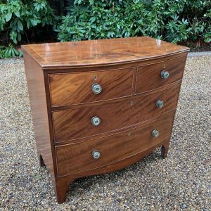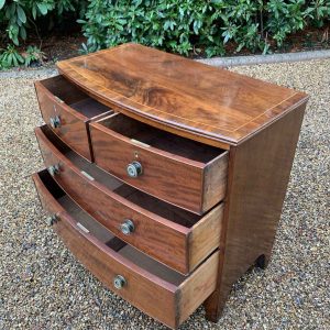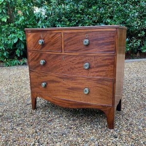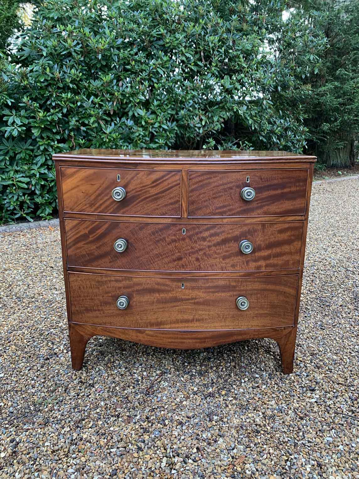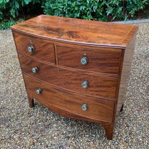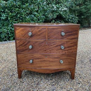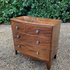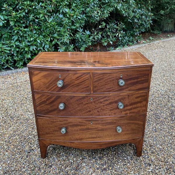19th Century Georgian / Regency Mahogany Bowfront Chest Of Drawers, with two short and two long graduated oak lined drawers with original round brass handles, on splayed feet.