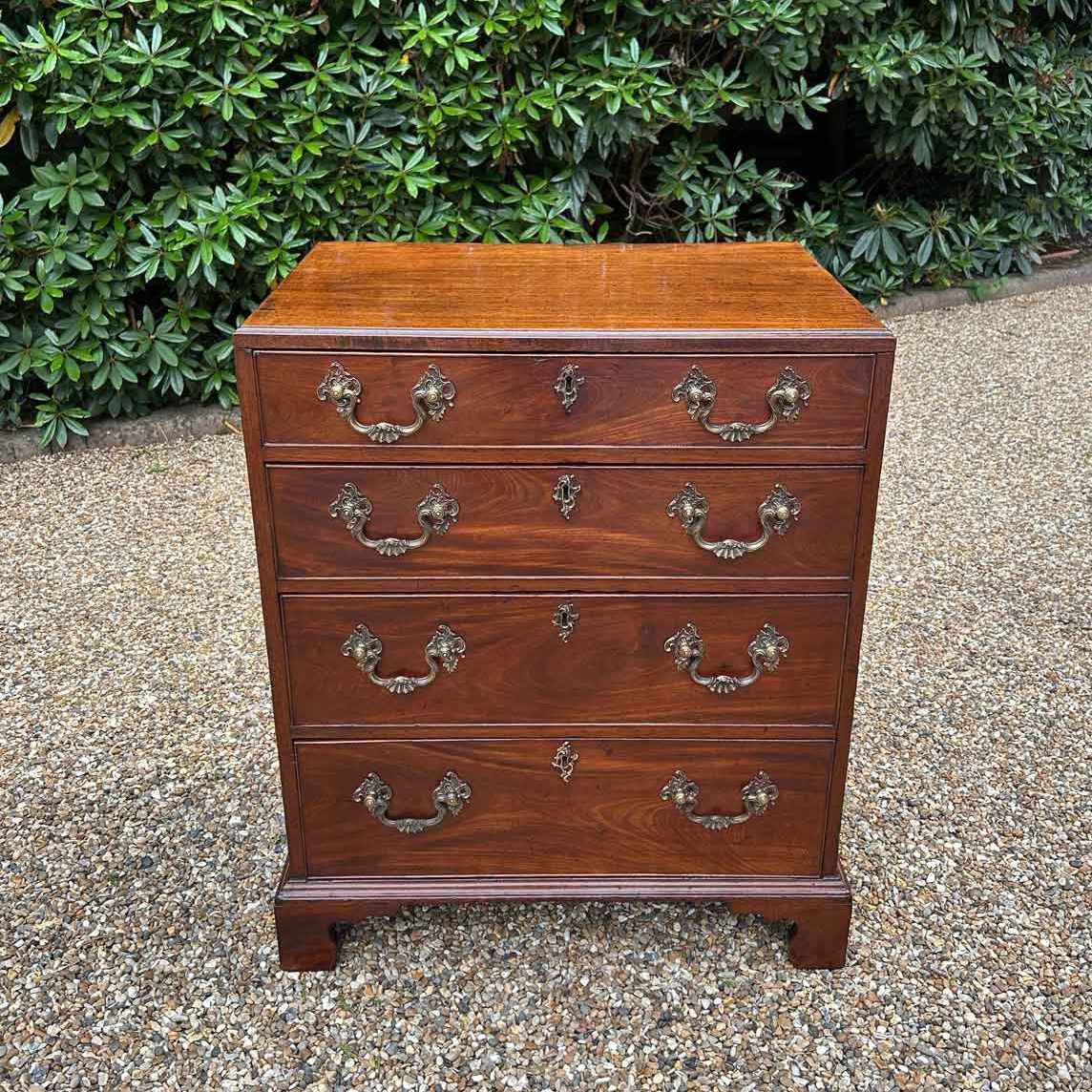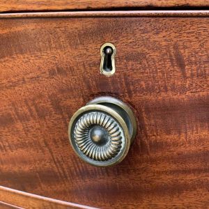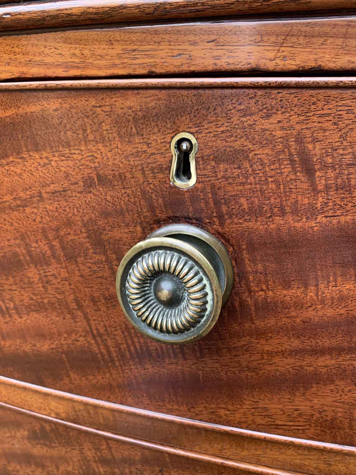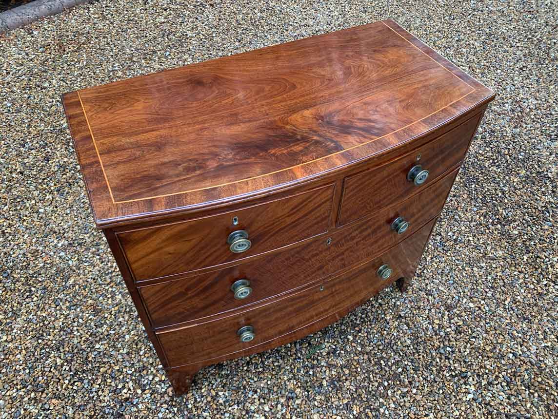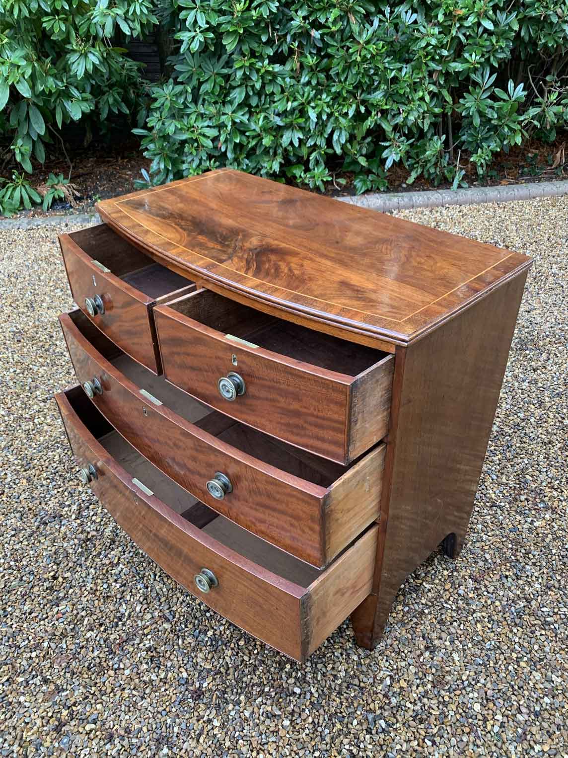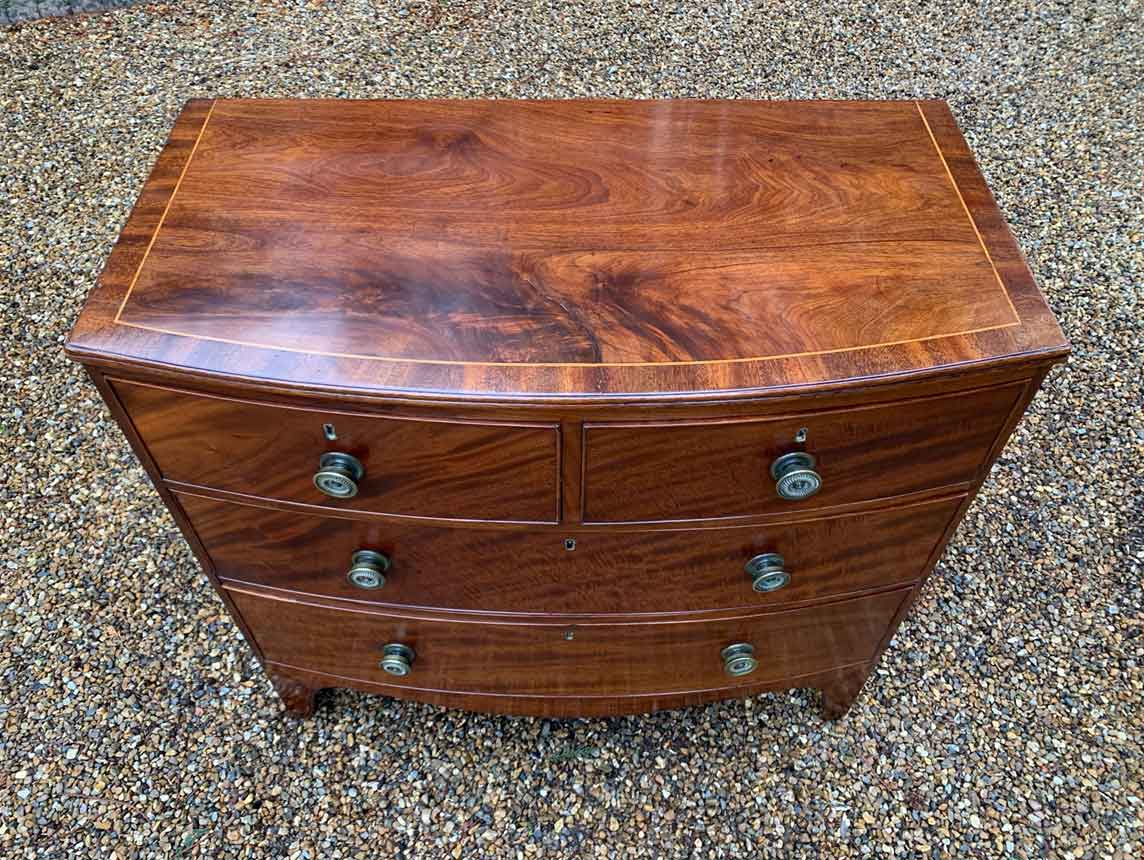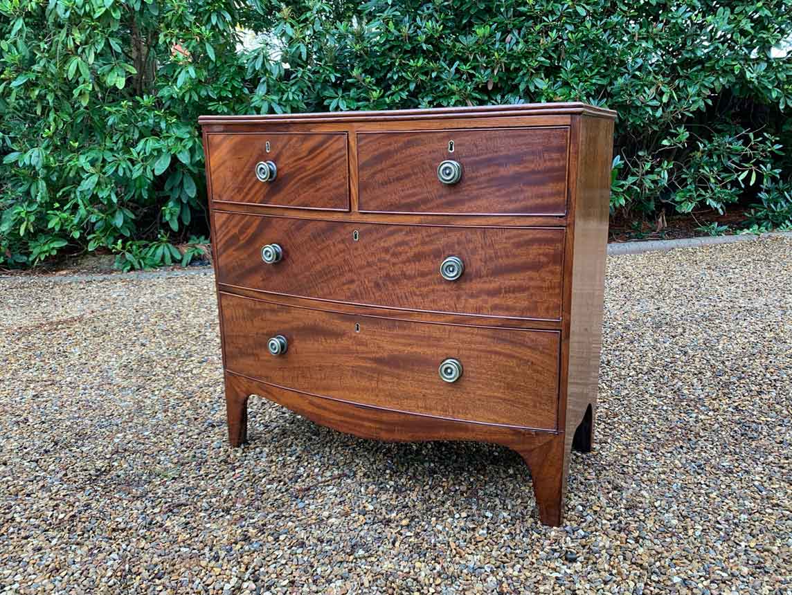 19th Century Georgian / Regency Mahogany Bowfront Chest Of Drawers, with two short and two long graduated oak lined drawers with original round brass handles, on splayed feet.