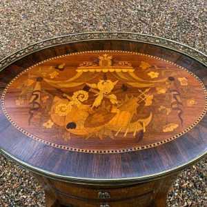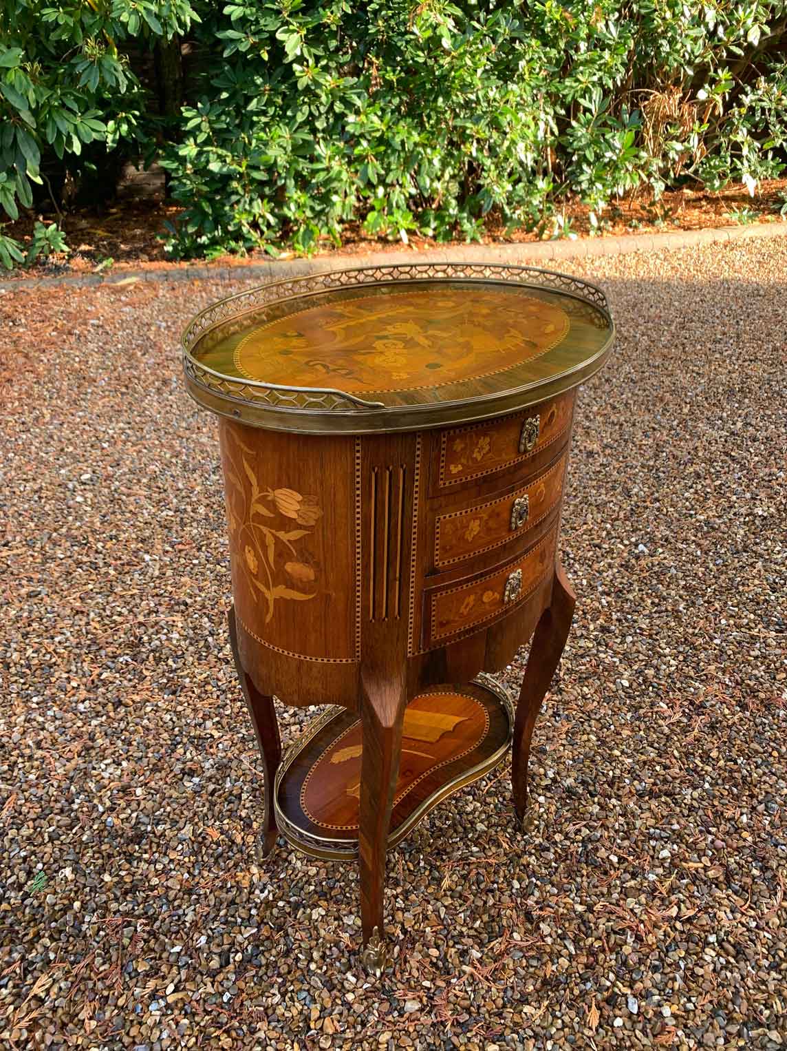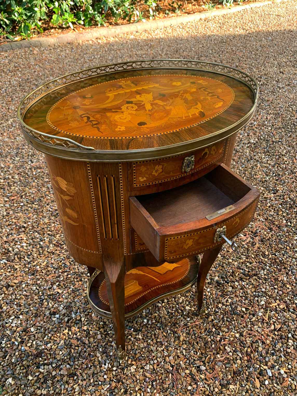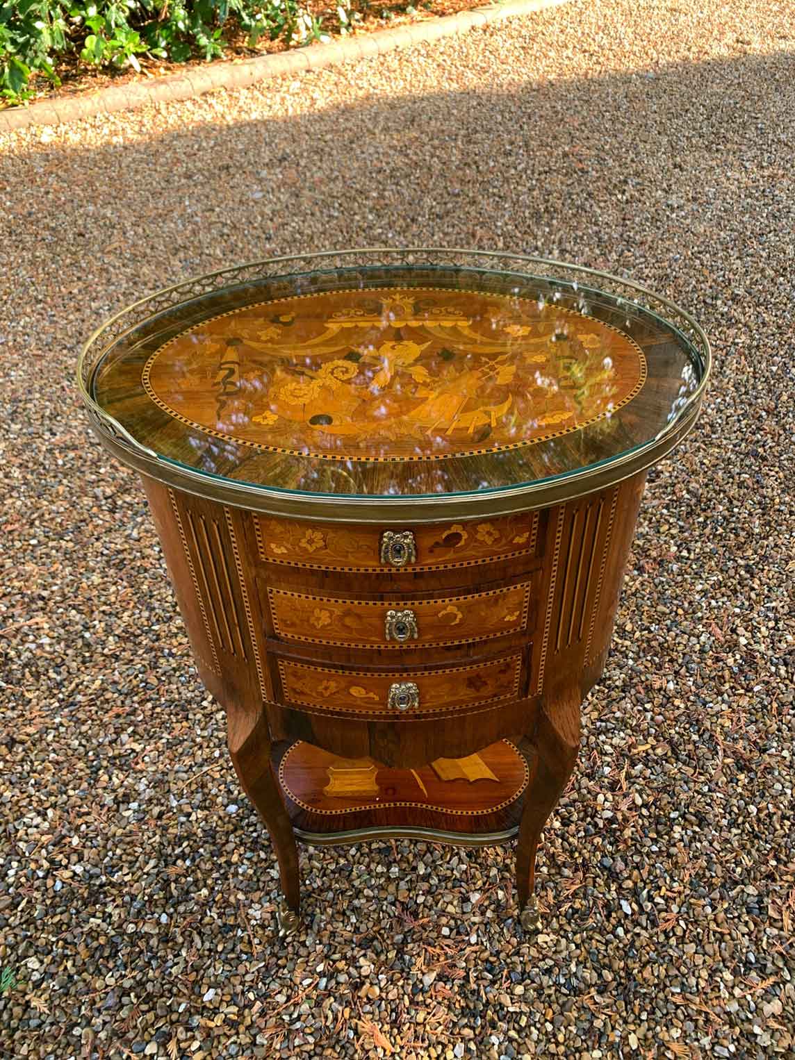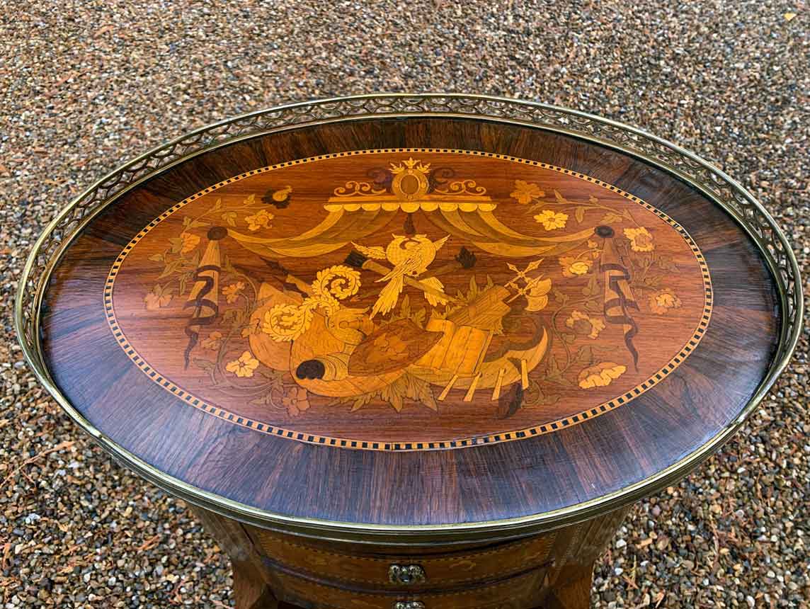 A Edwardian / 1920’s French Kingwood Oval Table with rosewood, marquetry inlay throughout and brass gallery. Above three fitted drawers and gilt metal mounts. Also fitted with a protective oval glass top, shown in picture two.