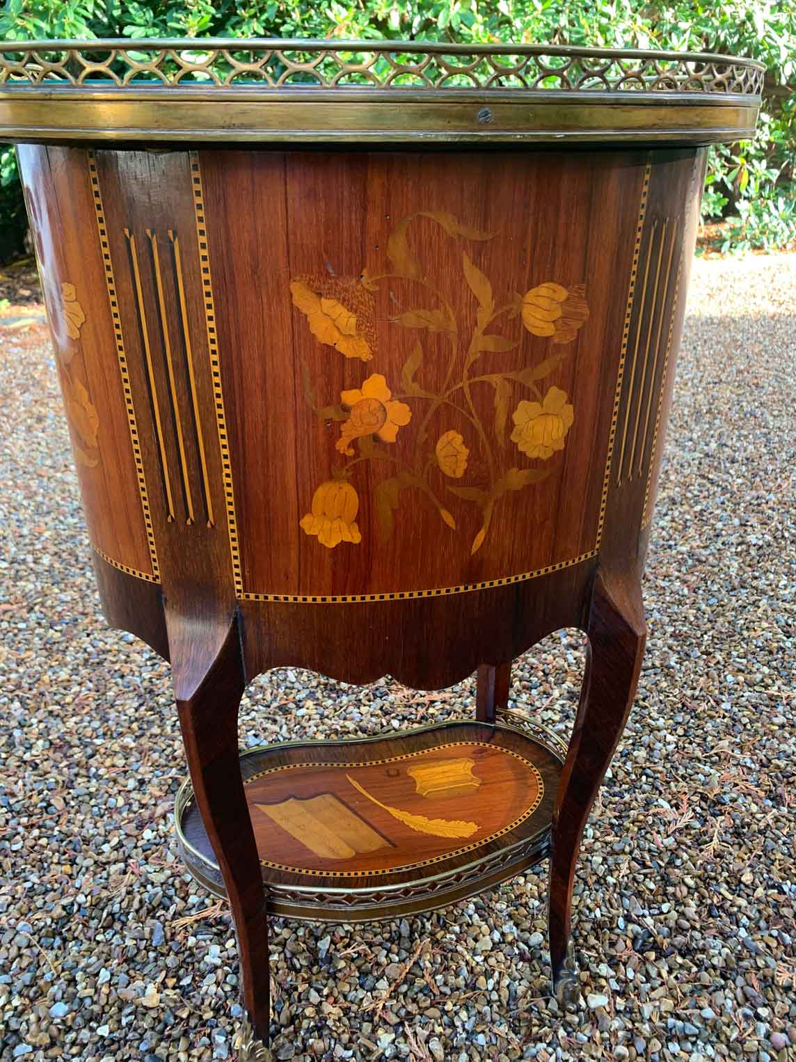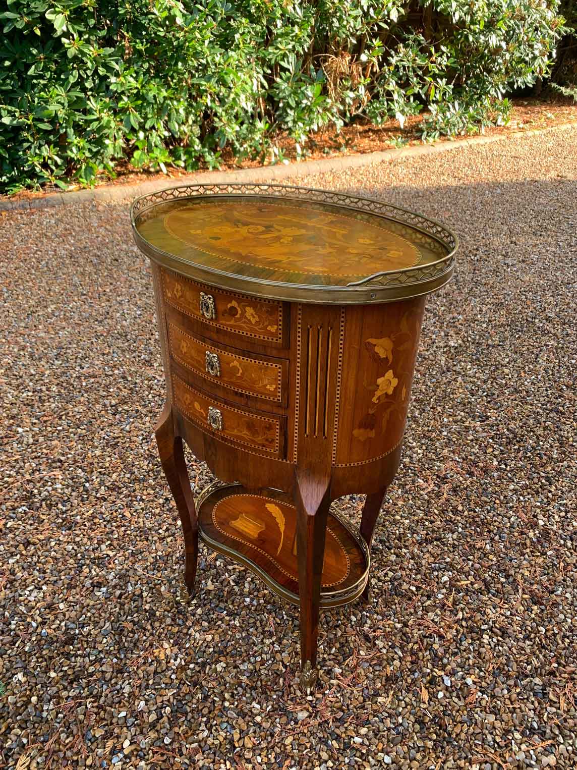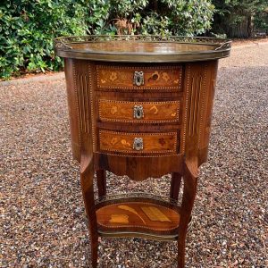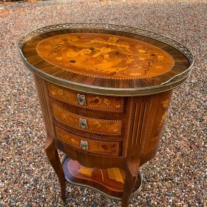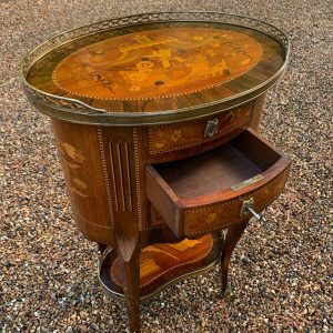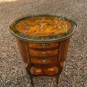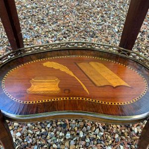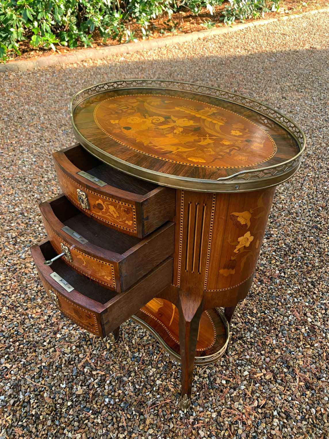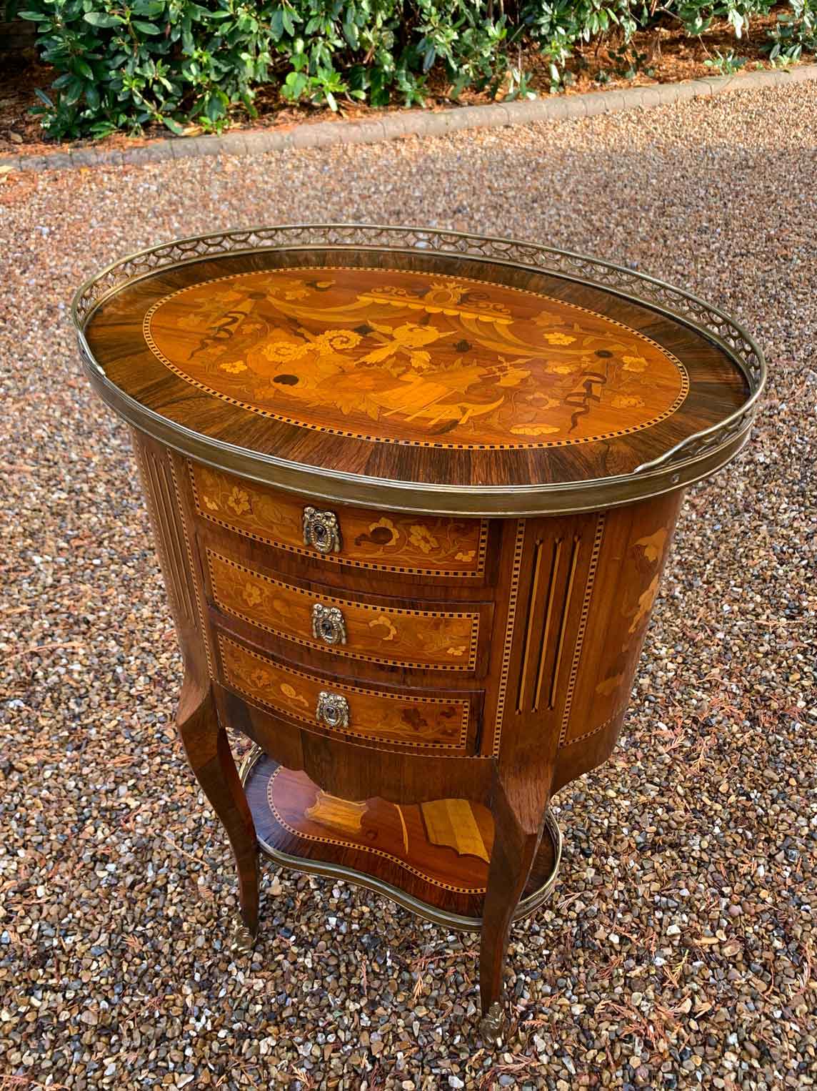 A Edwardian / 1920’s French Kingwood Oval Table with rosewood, marquetry inlay throughout and brass gallery. Above three fitted drawers and gilt metal mounts. Also fitted with a protective oval glass top, shown in picture two.