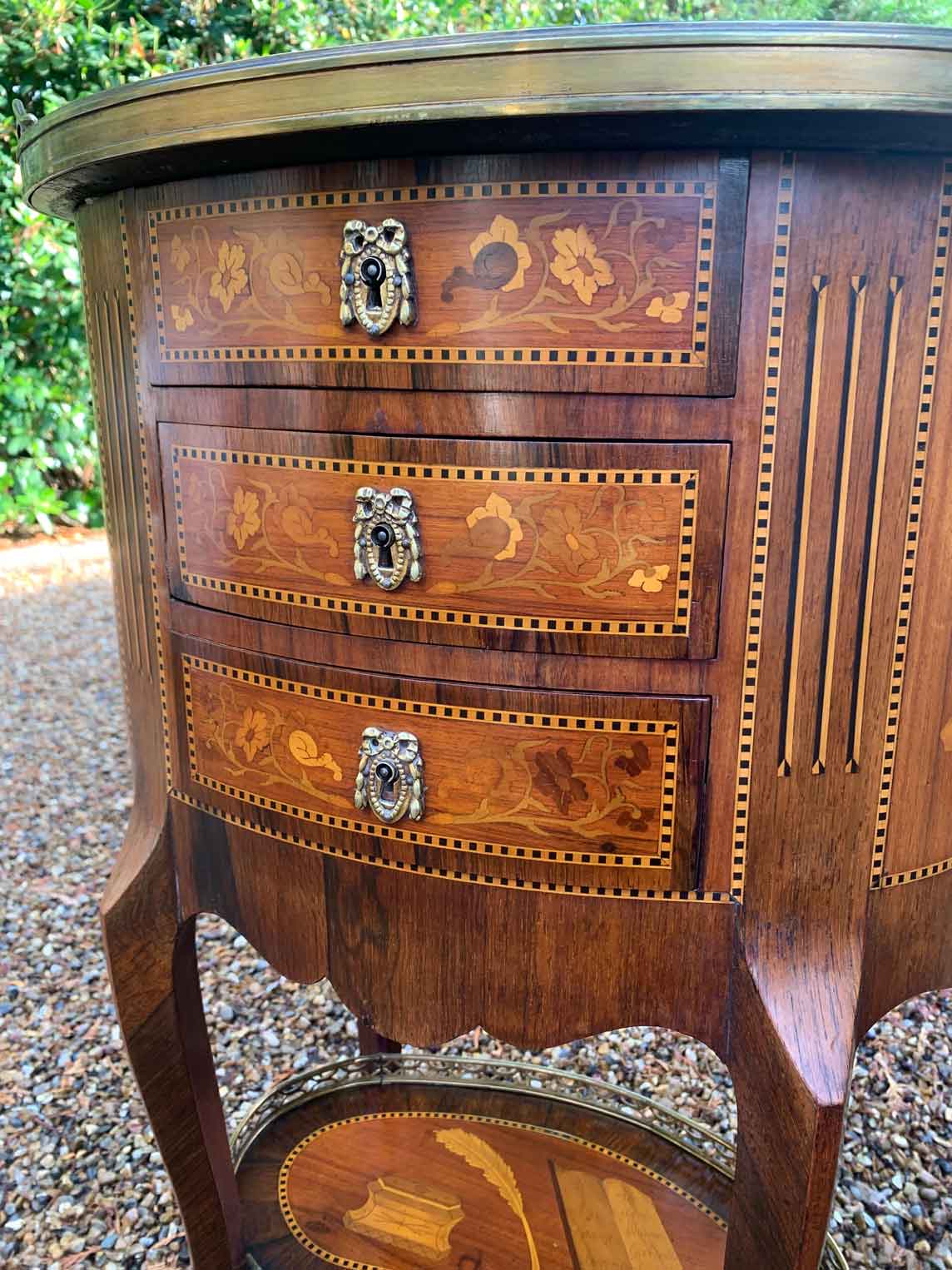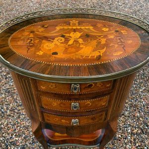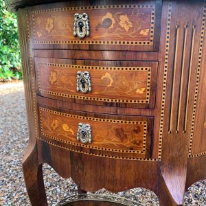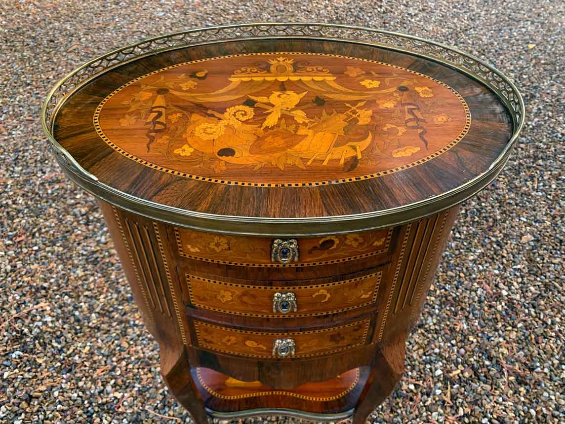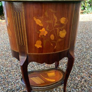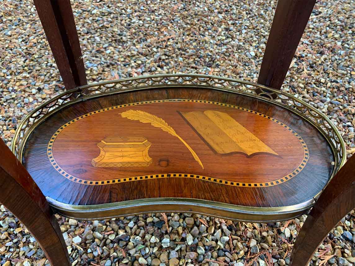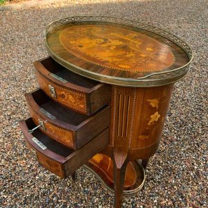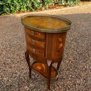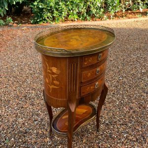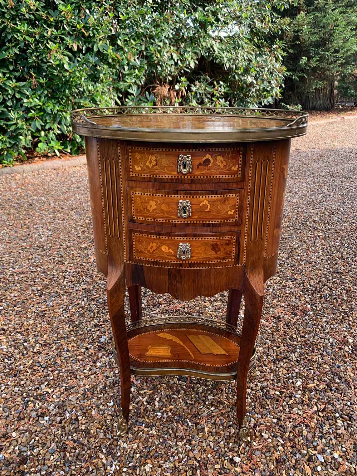 A Edwardian / 1920’s French Kingwood Oval Table with rosewood, marquetry inlay throughout and brass gallery. Above three fitted drawers and gilt metal mounts. Also fitted with a protective oval glass top, shown in picture two.
