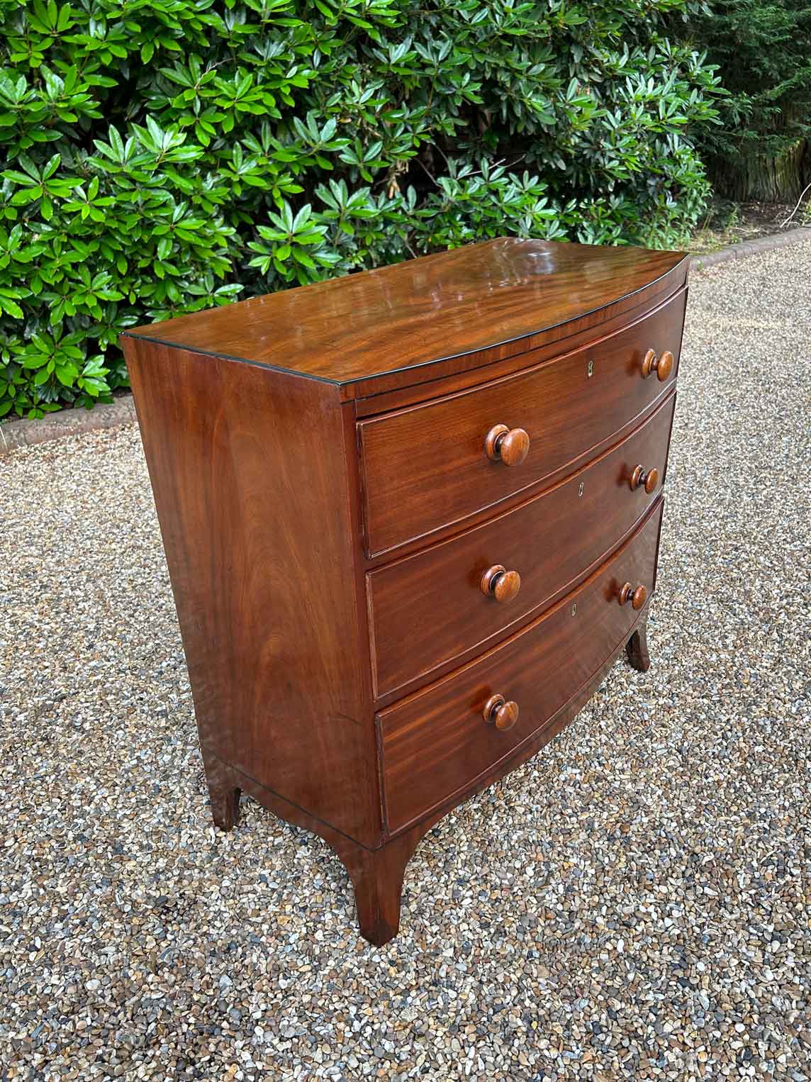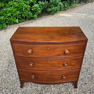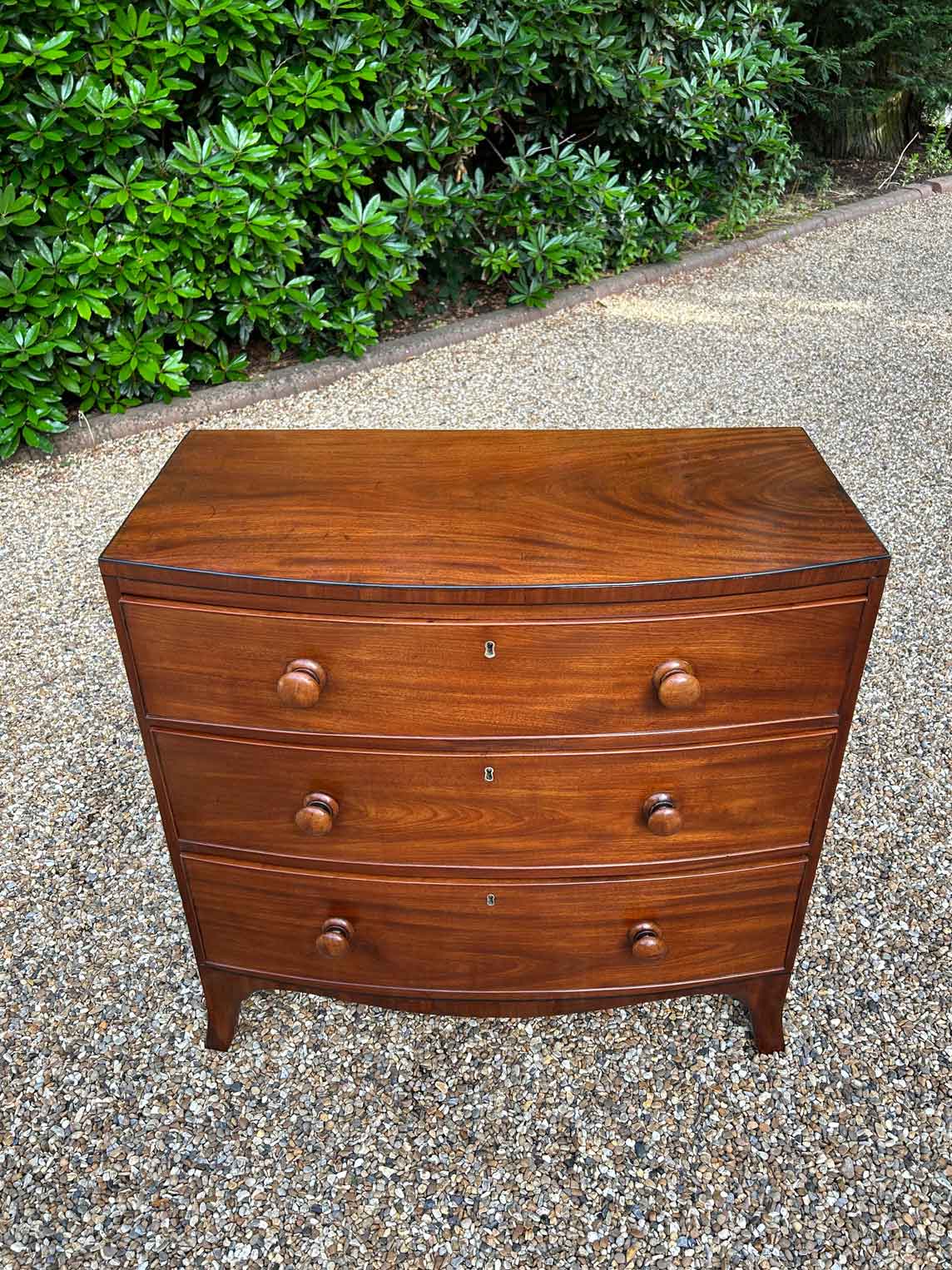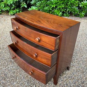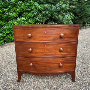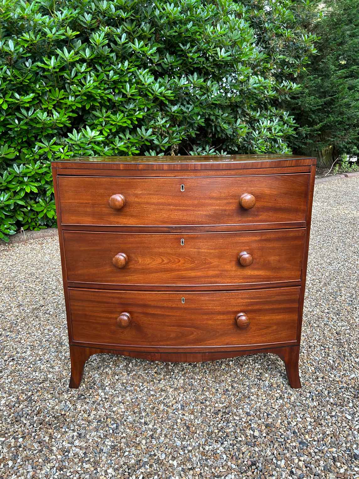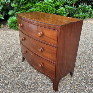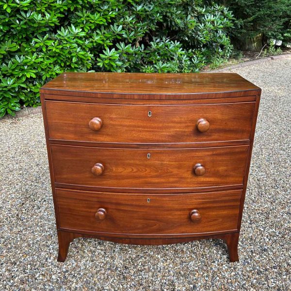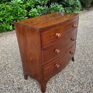 19th Century Georgian / Regency Mahogany Bowfront Chest Of Drawers, with three long graduated oak lined drawers with round turned bun handles, on splayed feet.
