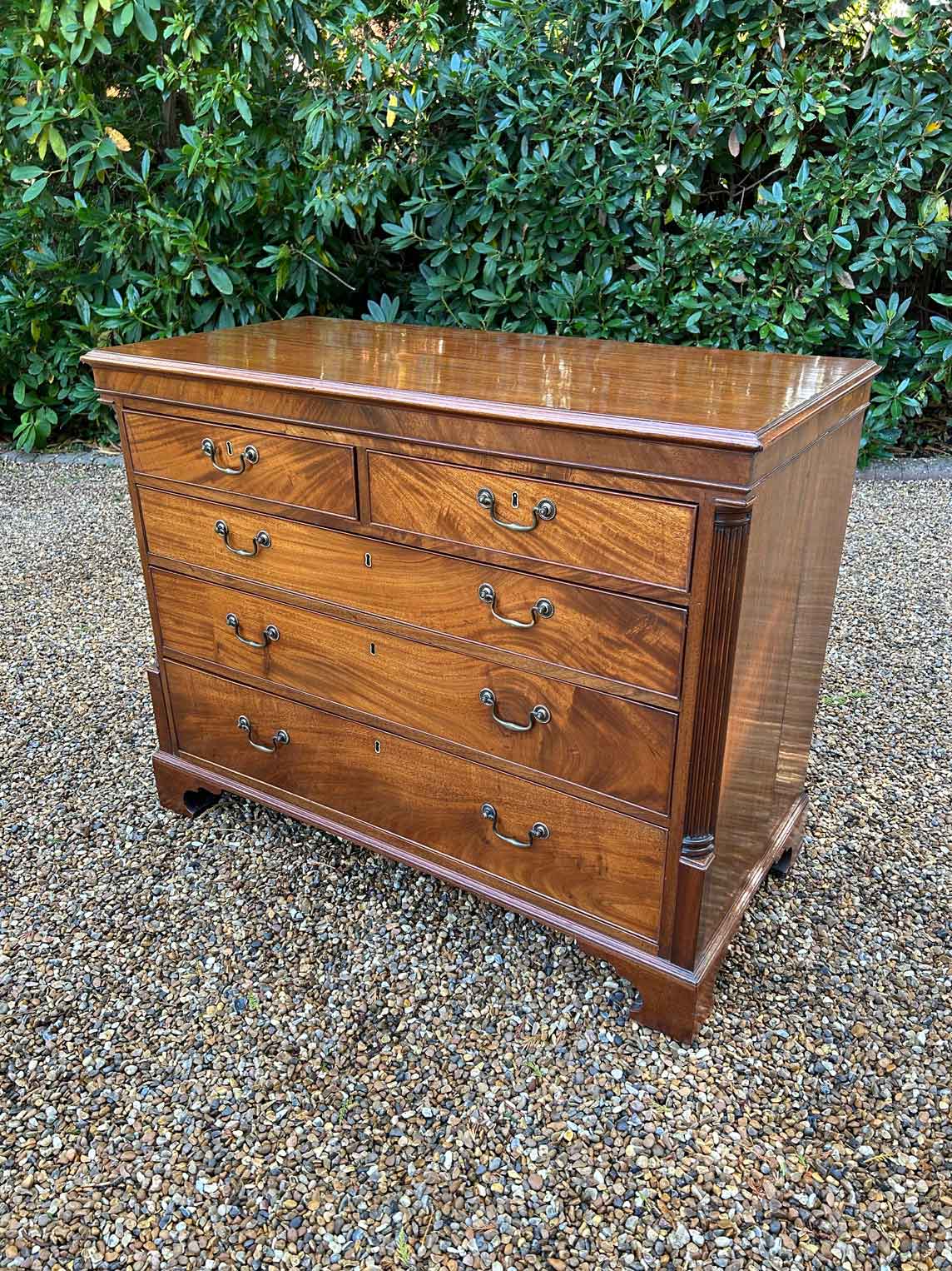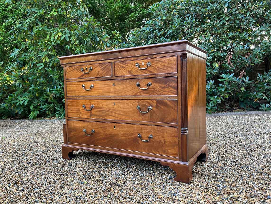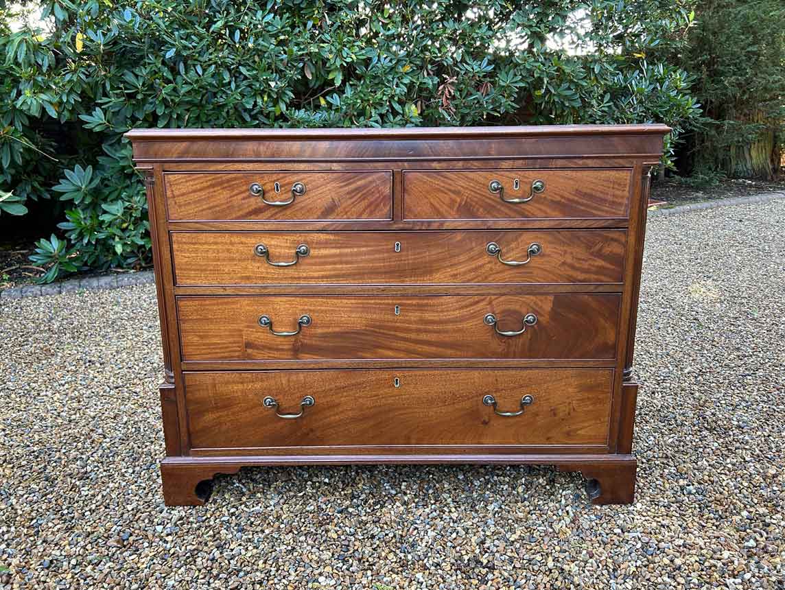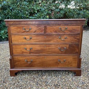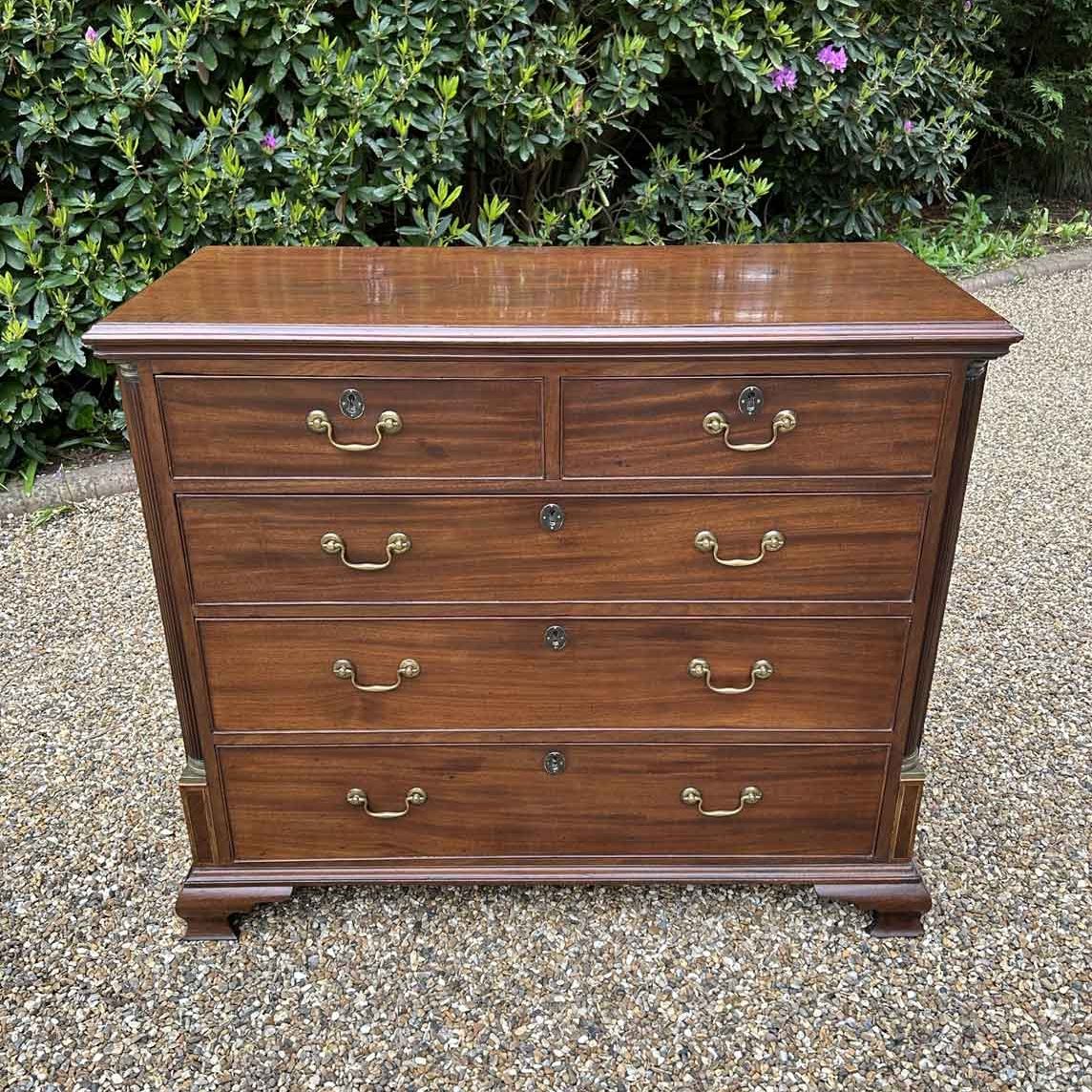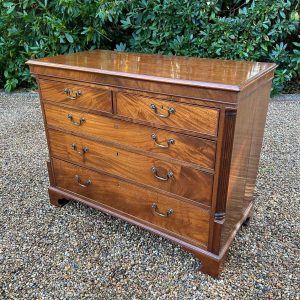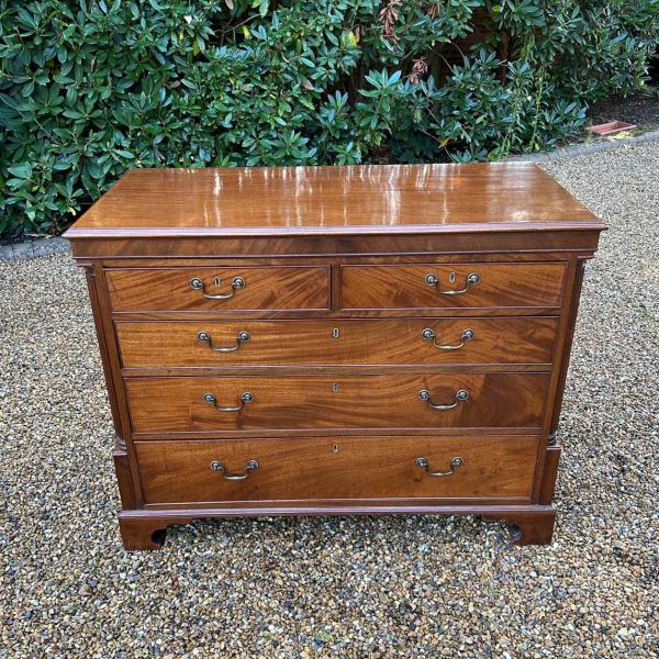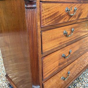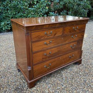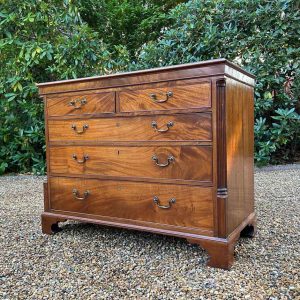 18th Century / Georgian Mahogany Chest of Drawers with two short and three long oak lined drawers, flanked by column pilasters with solid brass fitting on bracket feet.