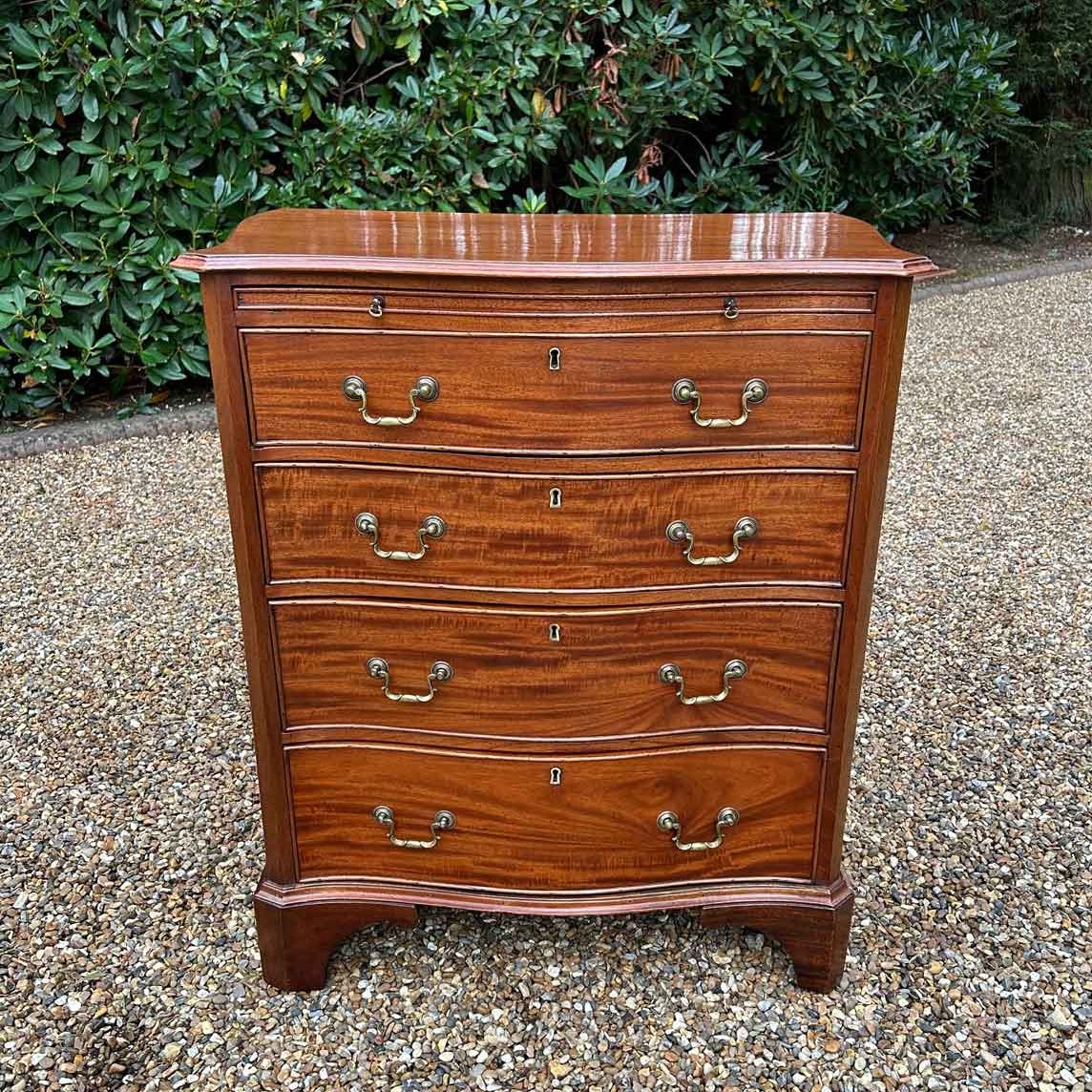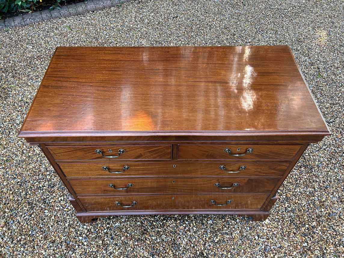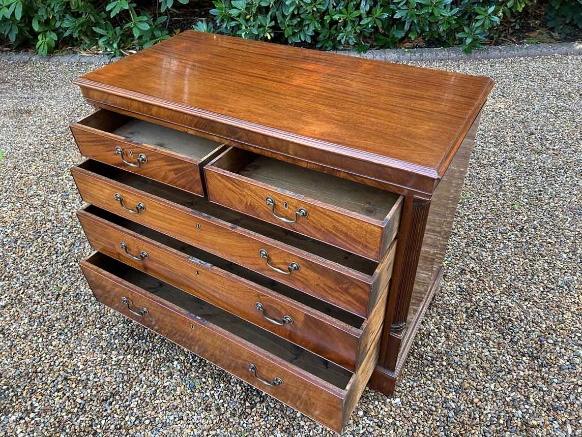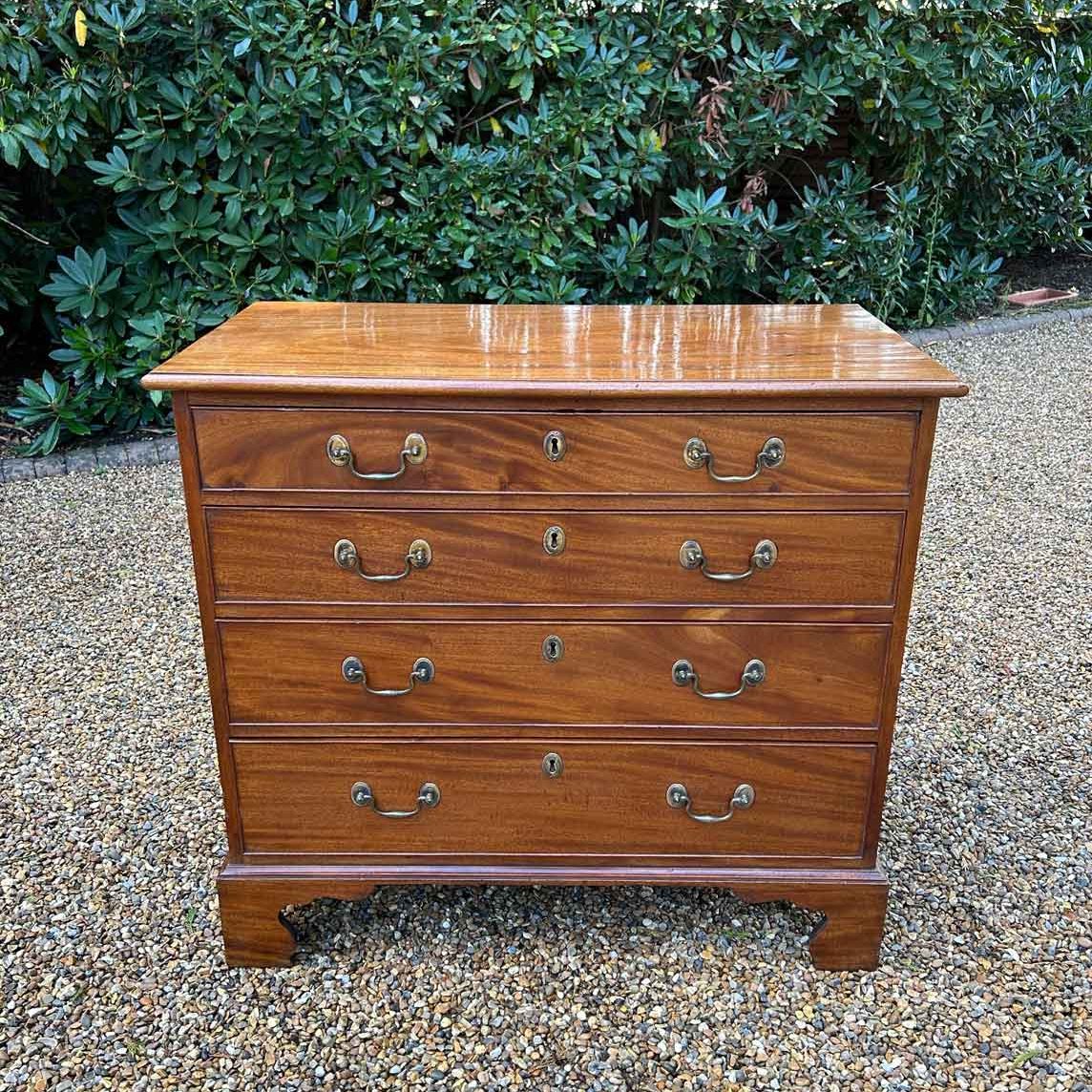 18th Century / Georgian Mahogany Chest of Drawers with two short and three long oak lined drawers, flanked by column pilasters with solid brass fitting on bracket feet.
