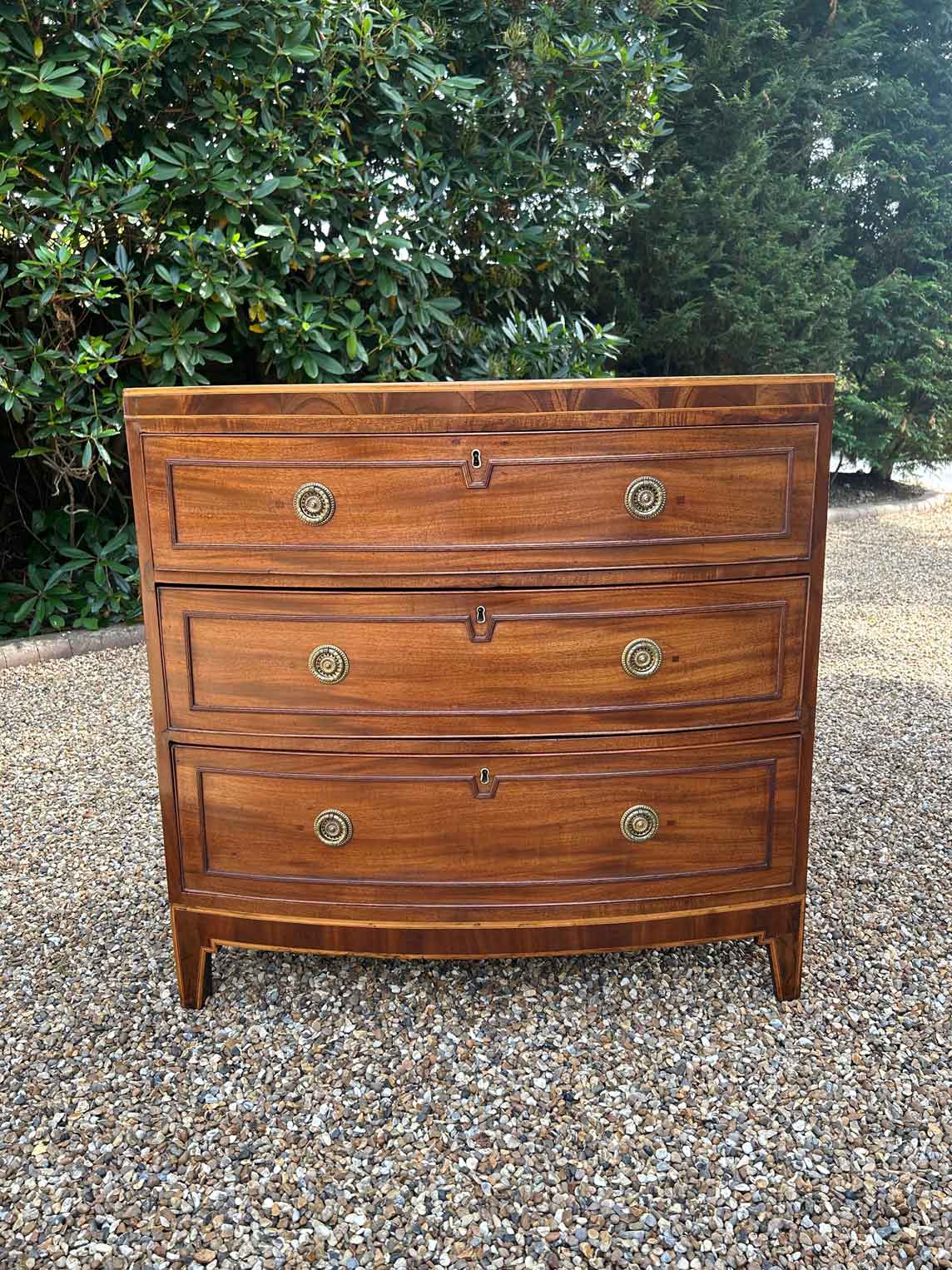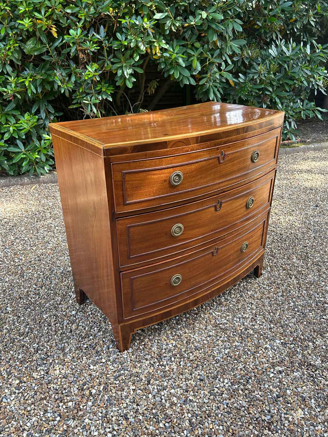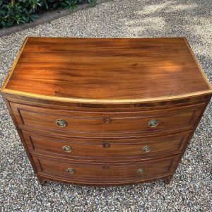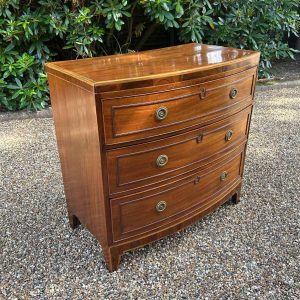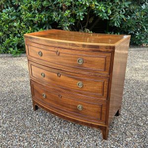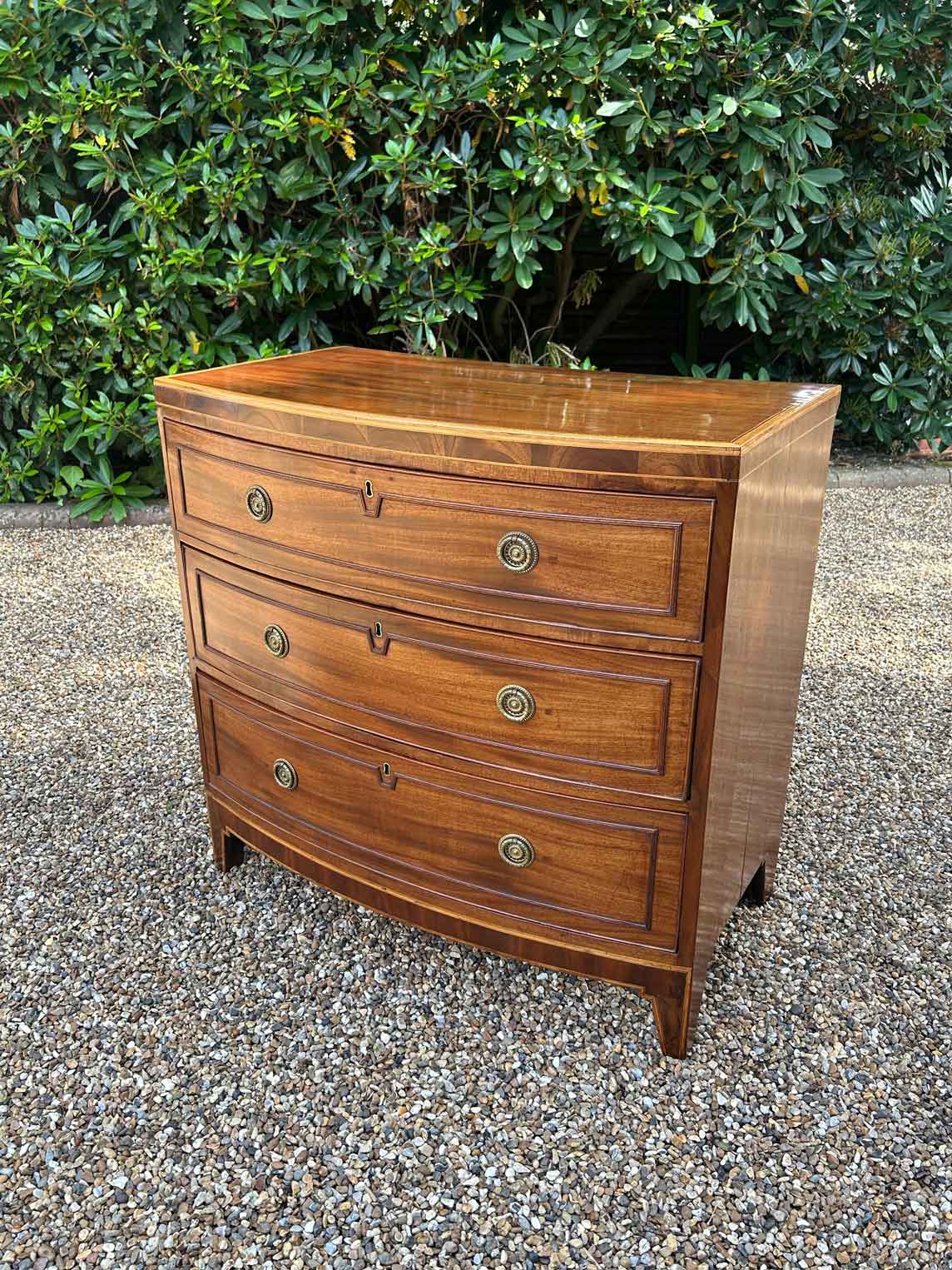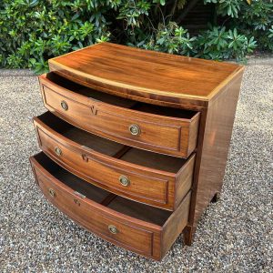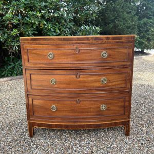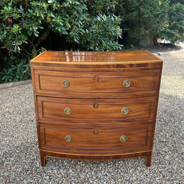 19th Century Regency Mahogany Bowfront Chest Of Drawers with three long graduated oak lined drawers, circular brass ring handles, raised upon bracket feet.