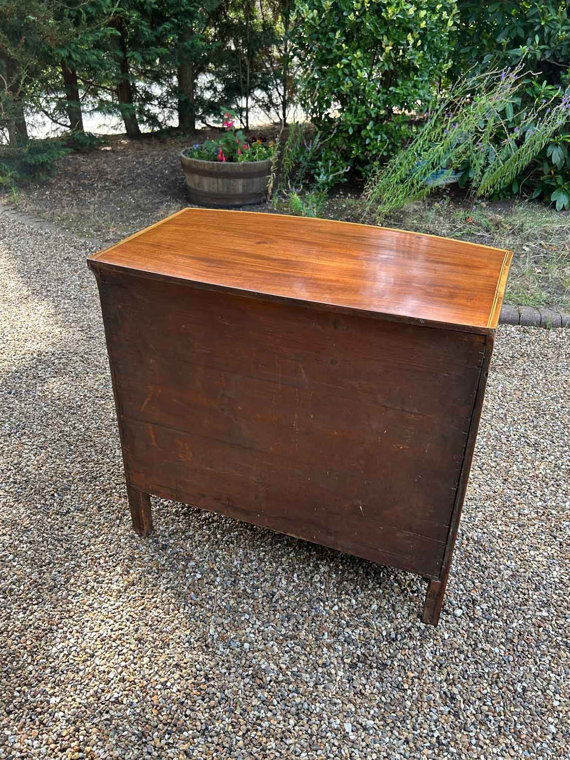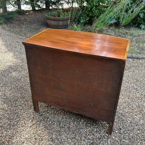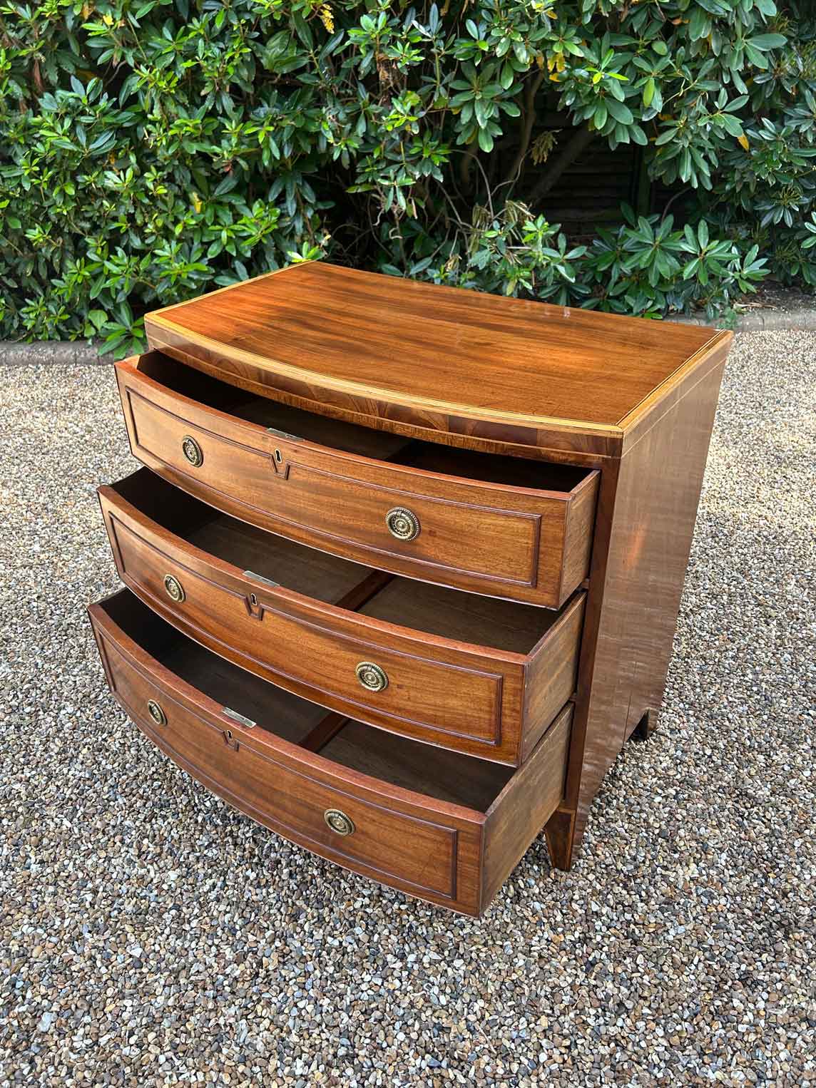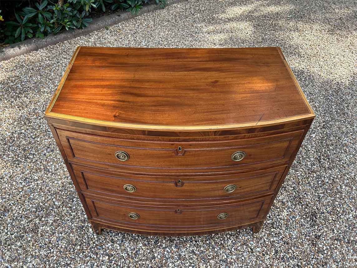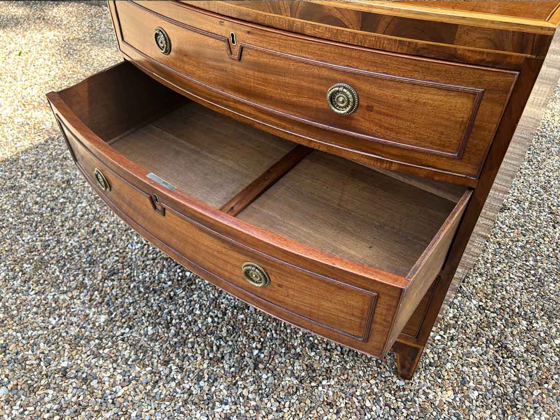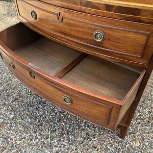 19th Century Regency Mahogany Bowfront Chest Of Drawers with three long graduated oak lined drawers, circular brass ring handles, raised upon bracket feet.