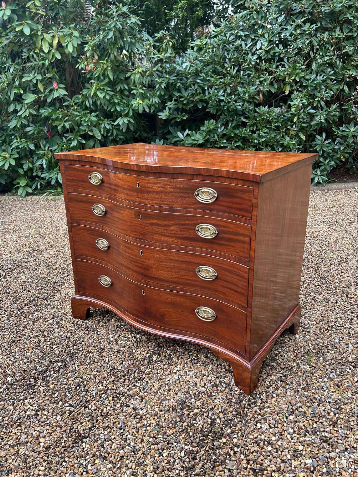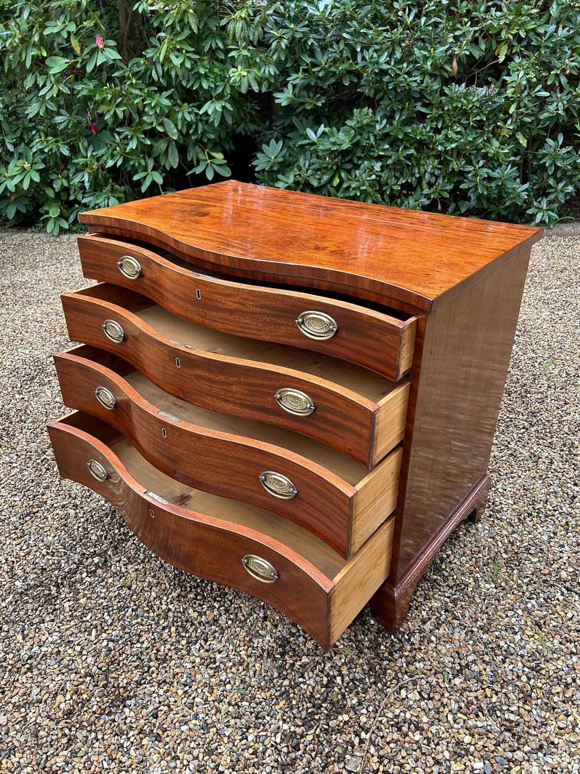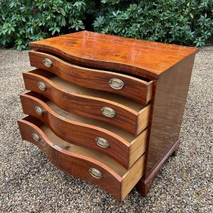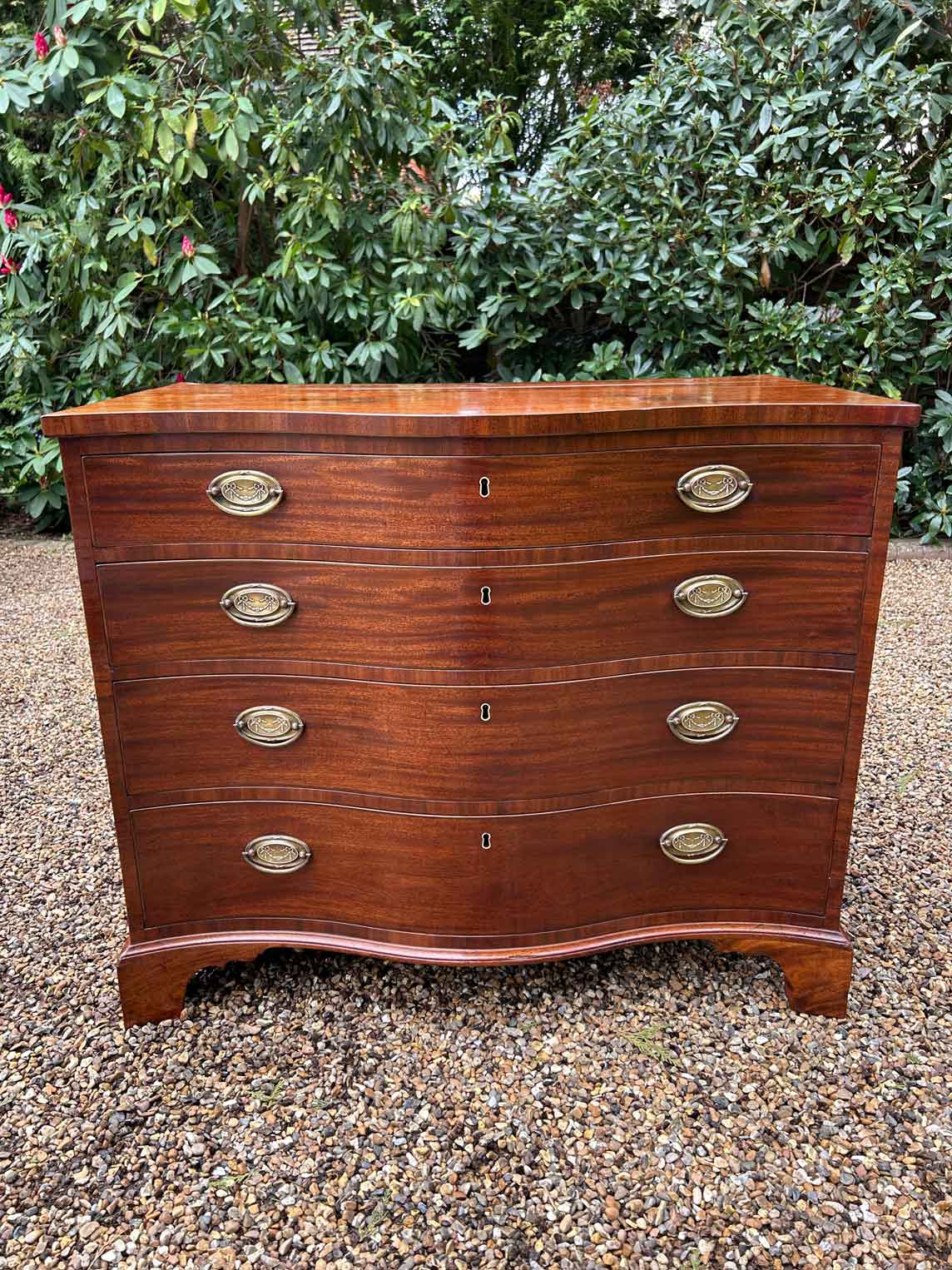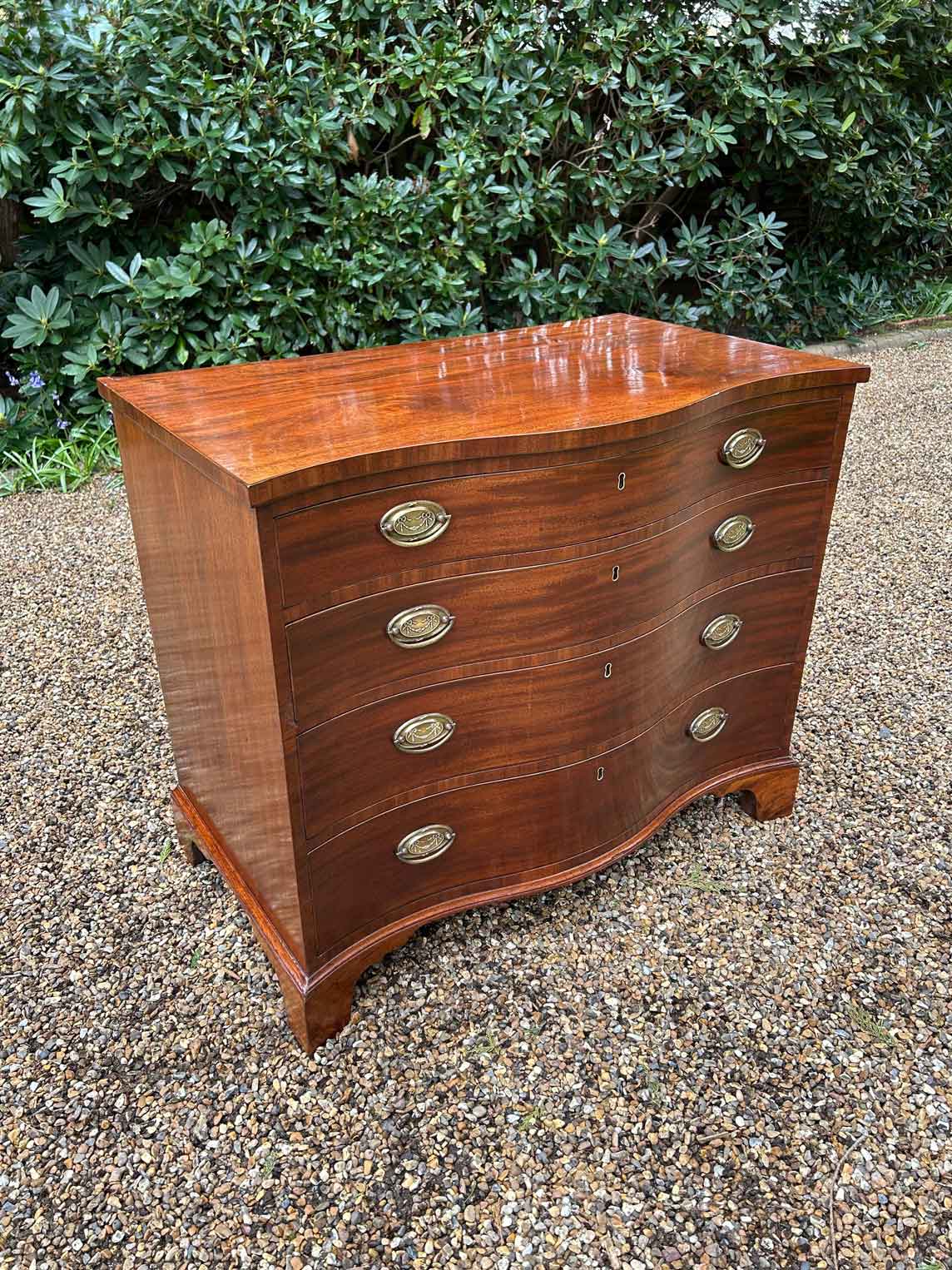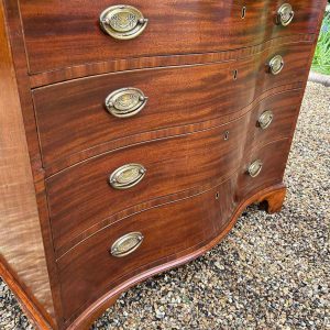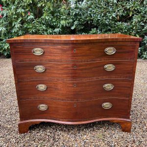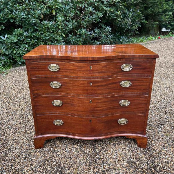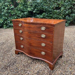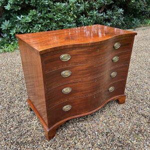 A high quality 19th Century George III Mahogany Serpentine Chest Of Drawers, over four long graduated drawers with brass oval plate handles on bracket feet.