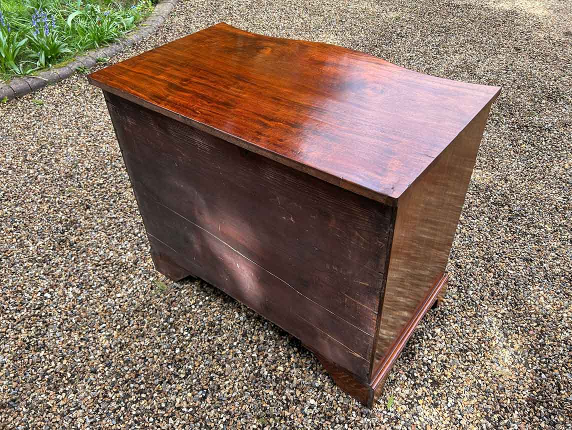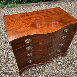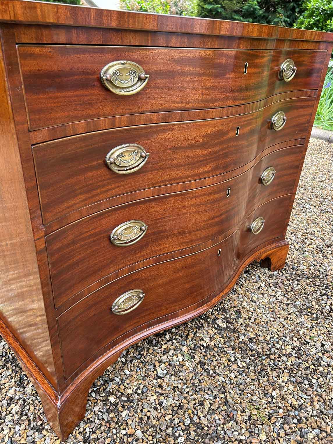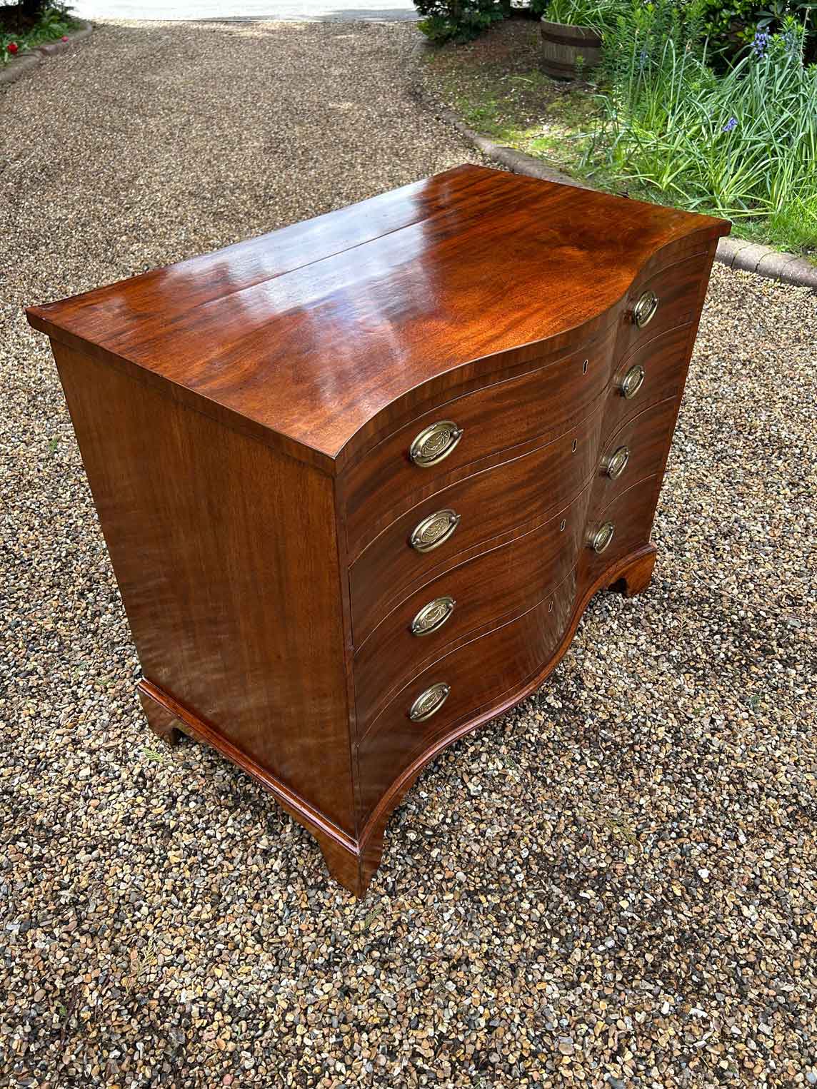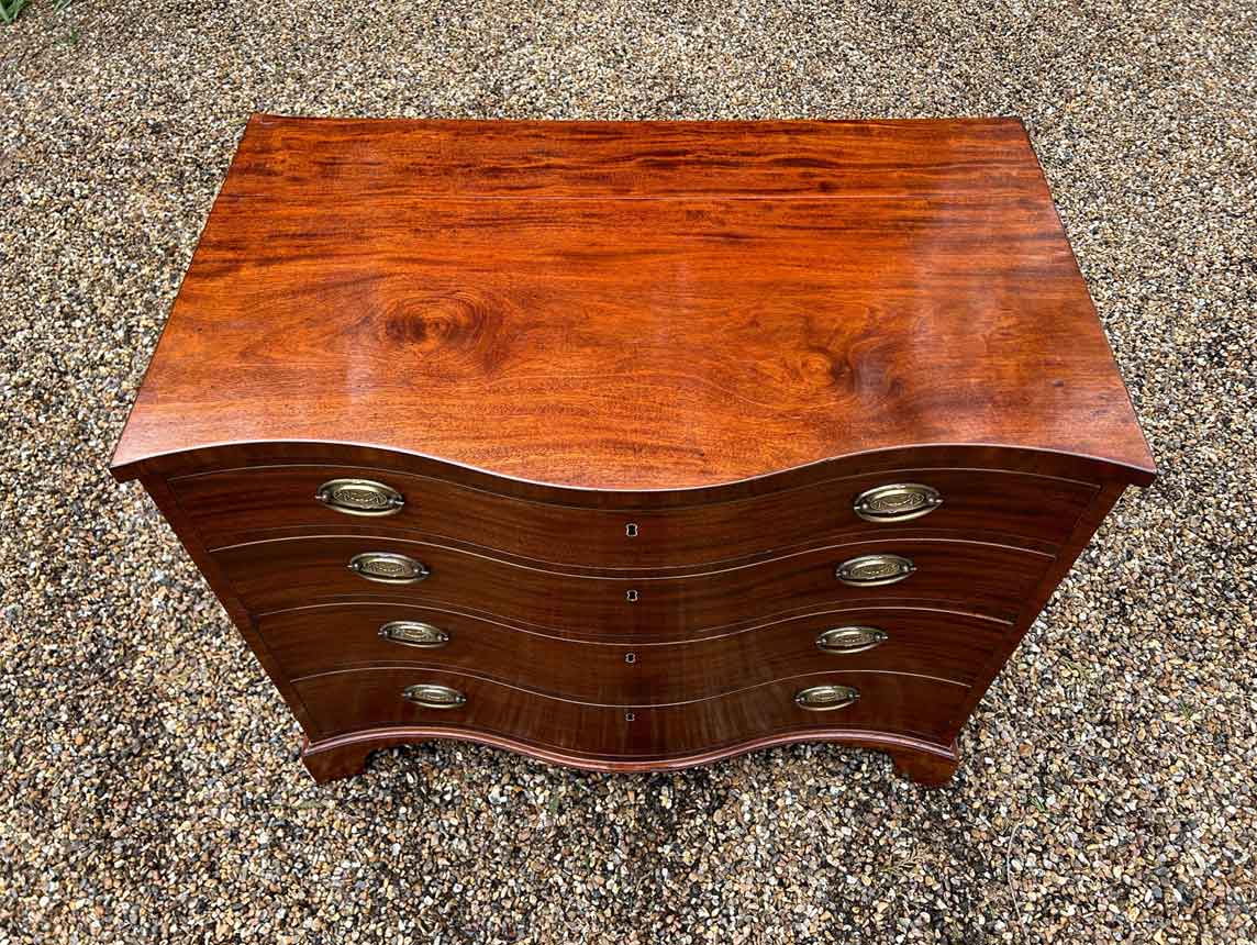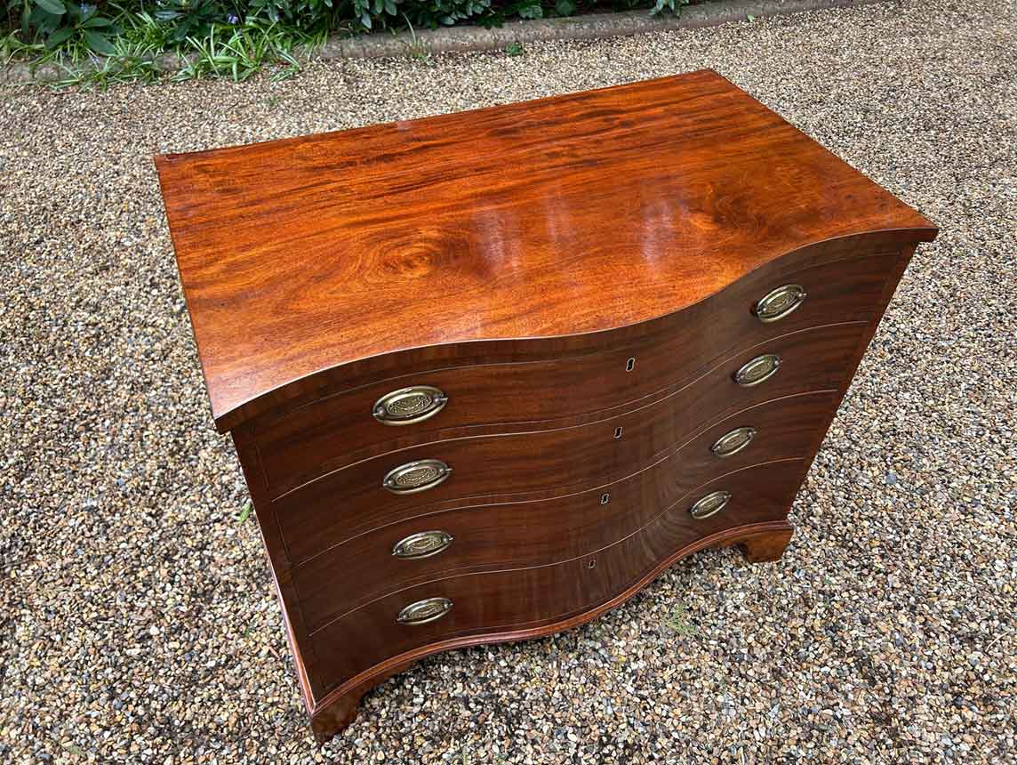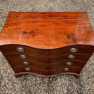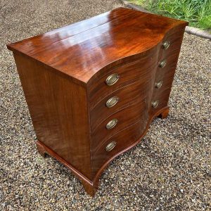 A high quality 19th Century George III Mahogany Serpentine Chest Of Drawers, over four long graduated drawers with brass oval plate handles on bracket feet.