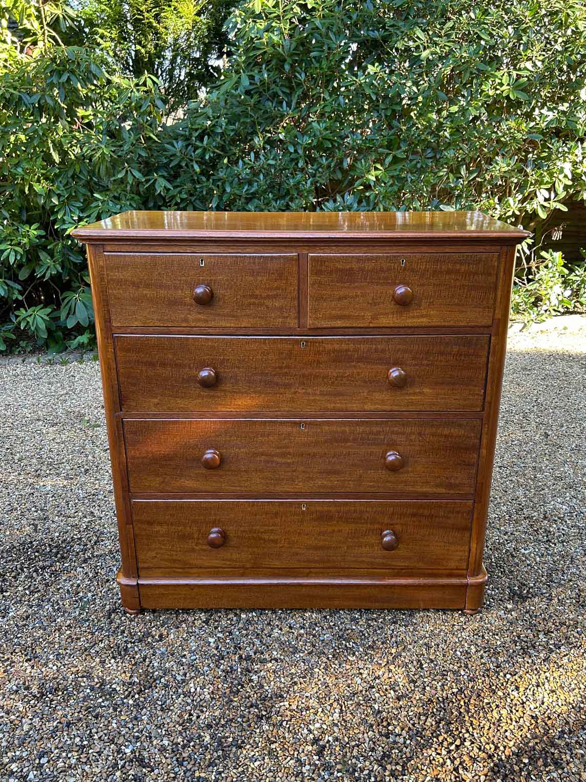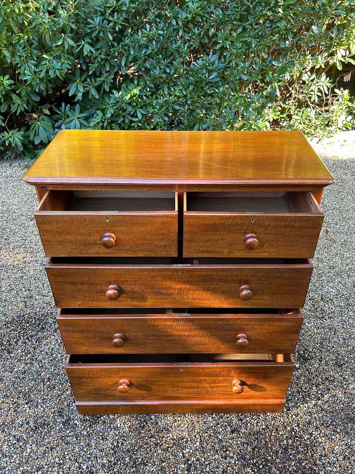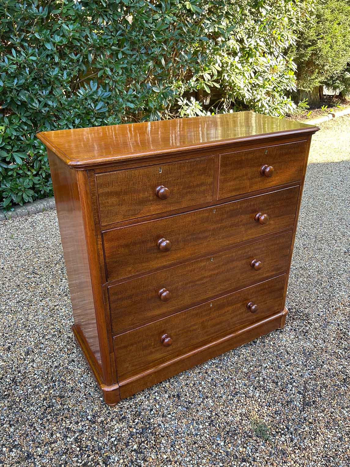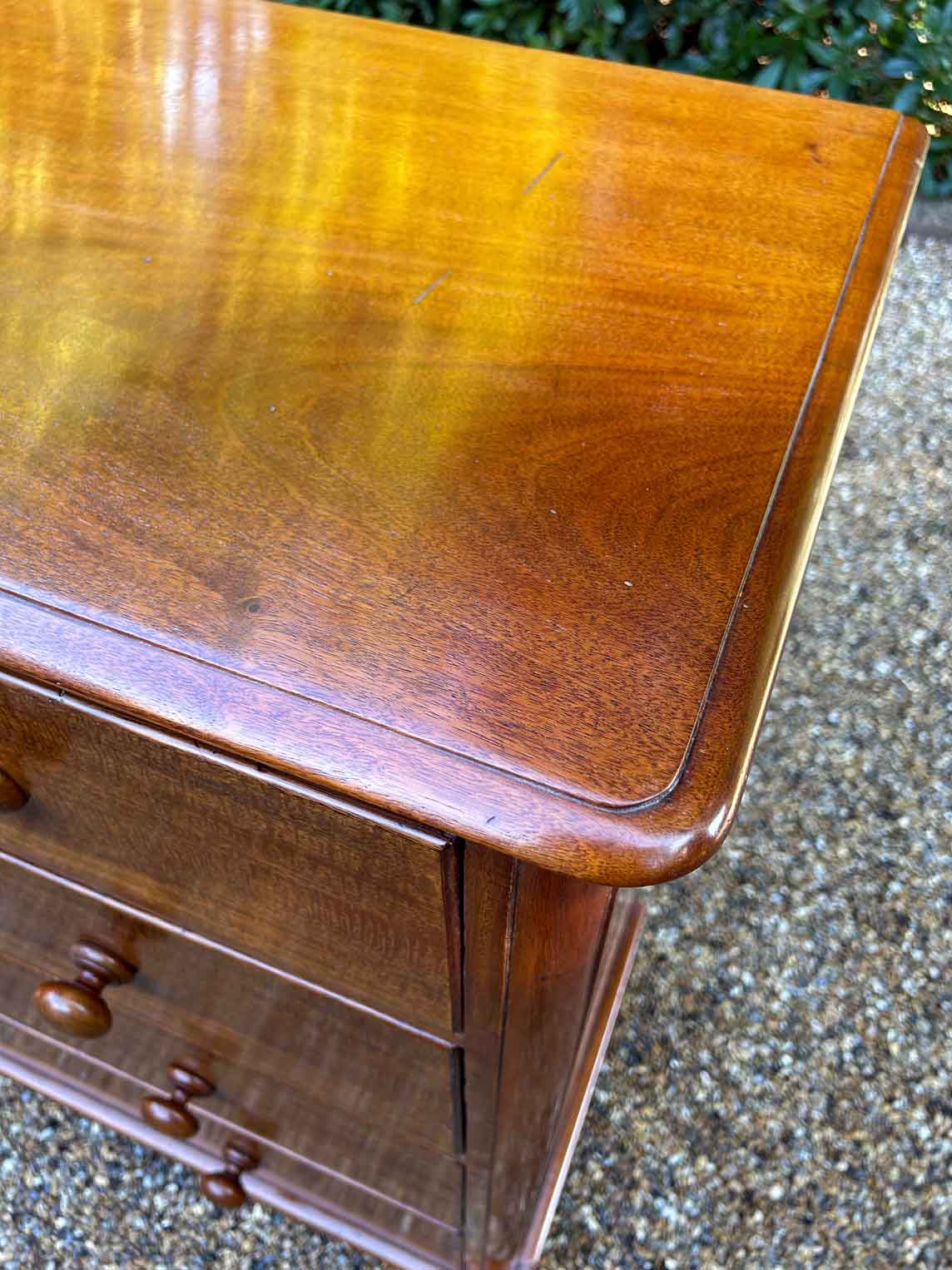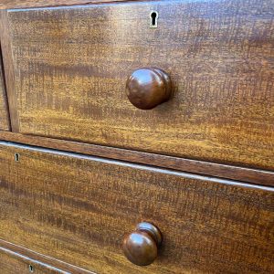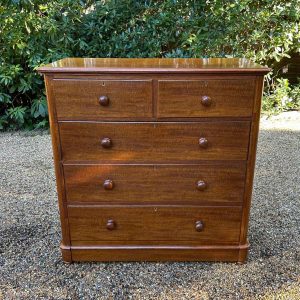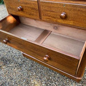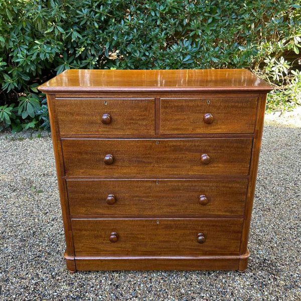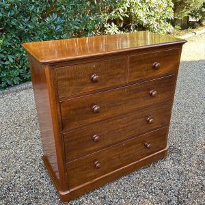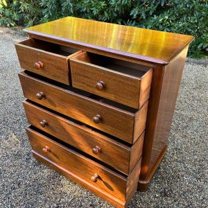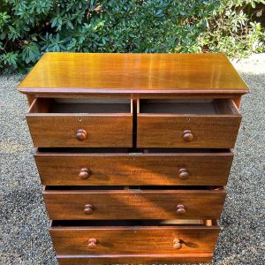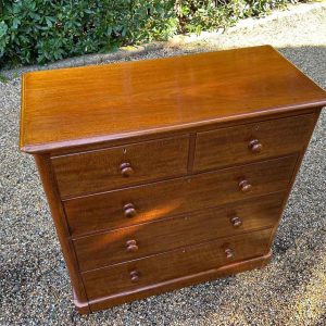 19th Century Victorian Mahogany Chest Of Drawers with two short, three long solid mahogany and oak lined drawers with turned bun handles.