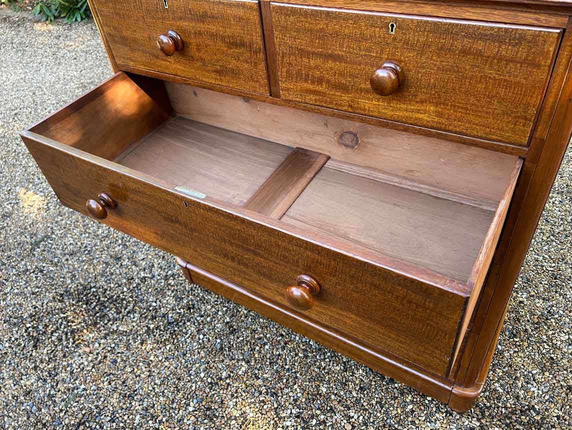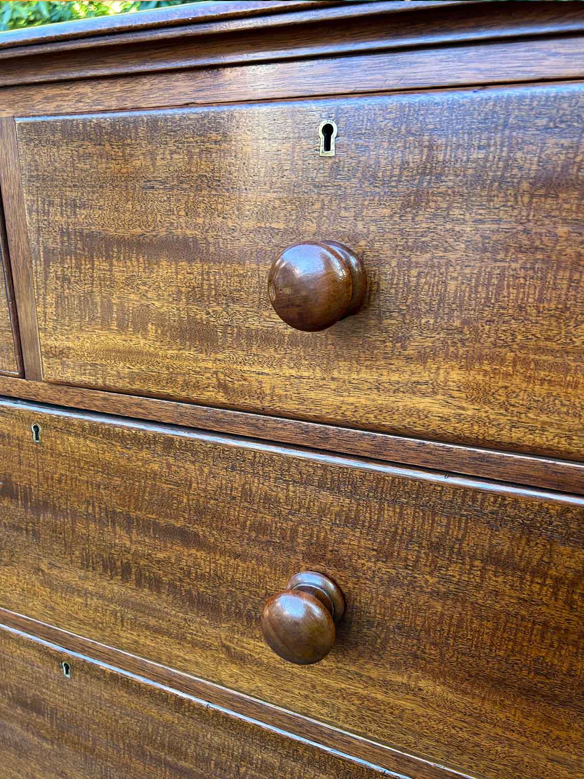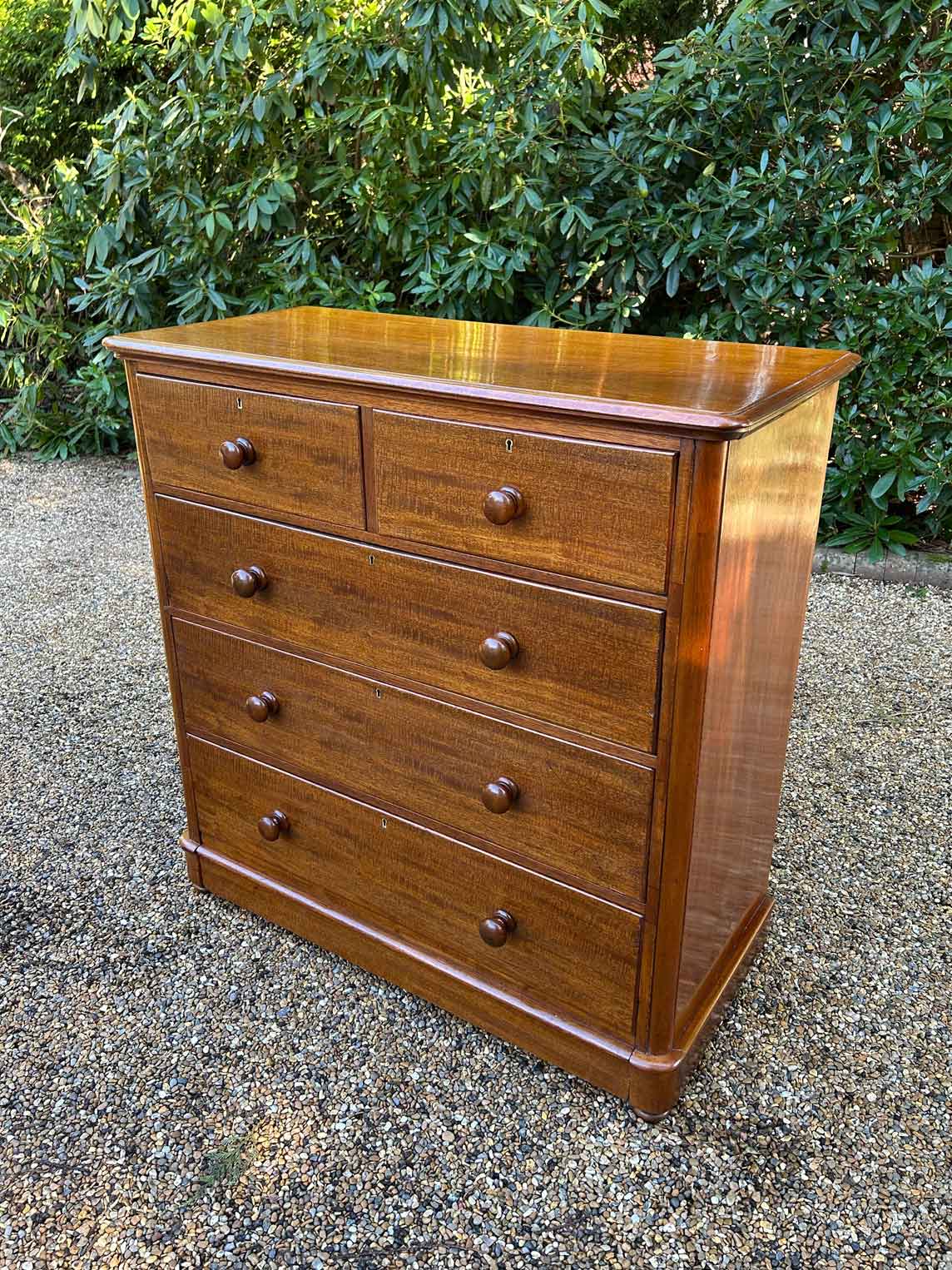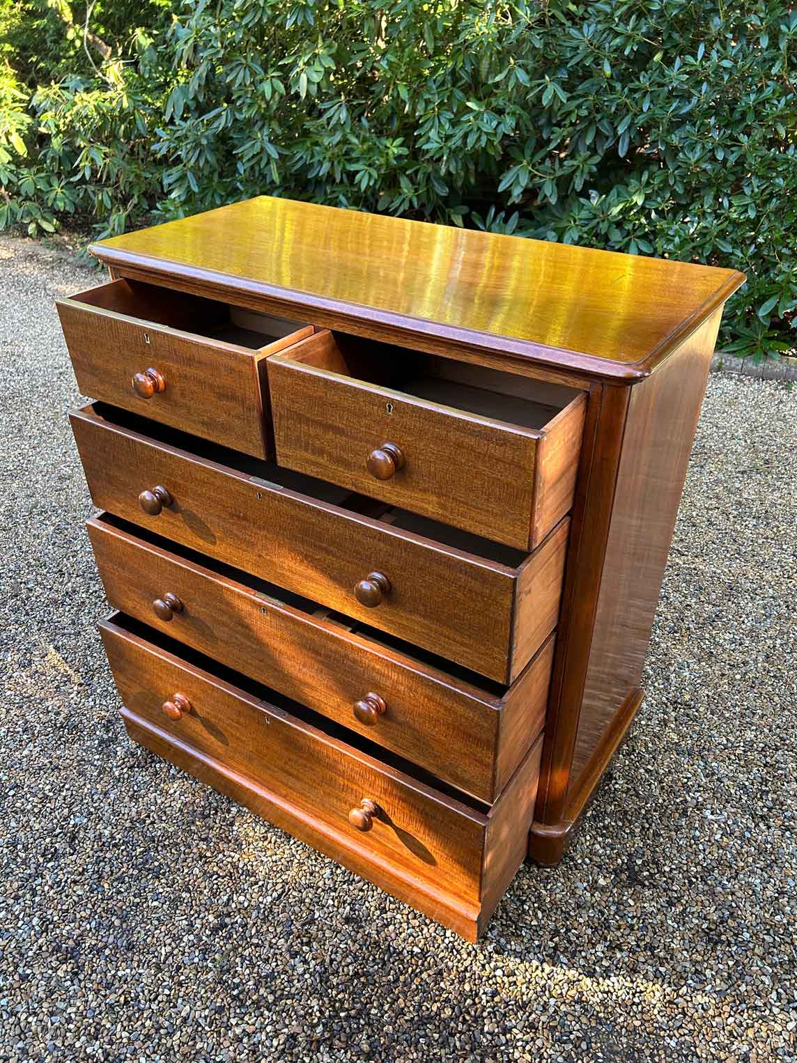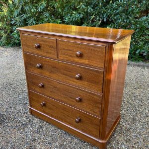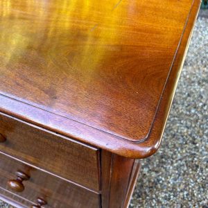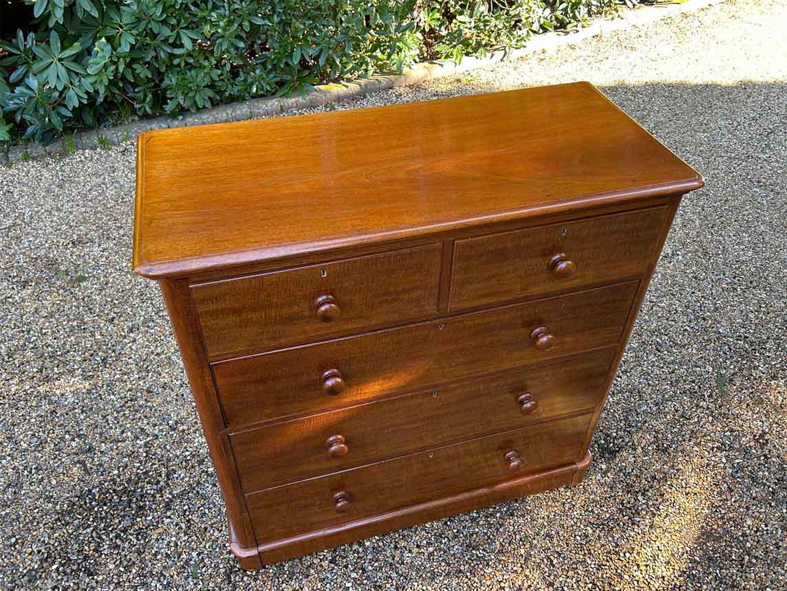 19th Century Victorian Mahogany Chest Of Drawers with two short, three long solid mahogany and oak lined drawers with turned bun handles.