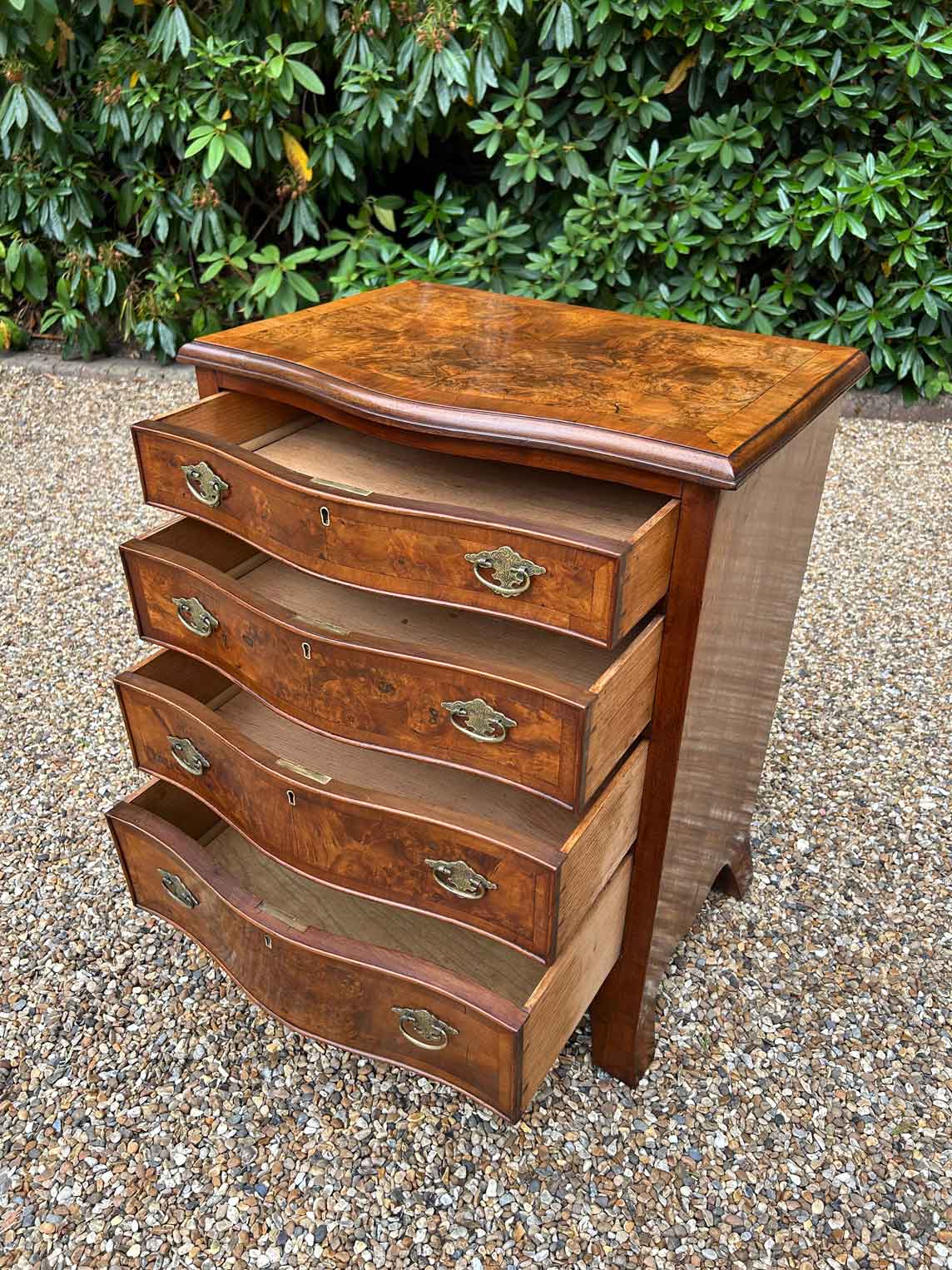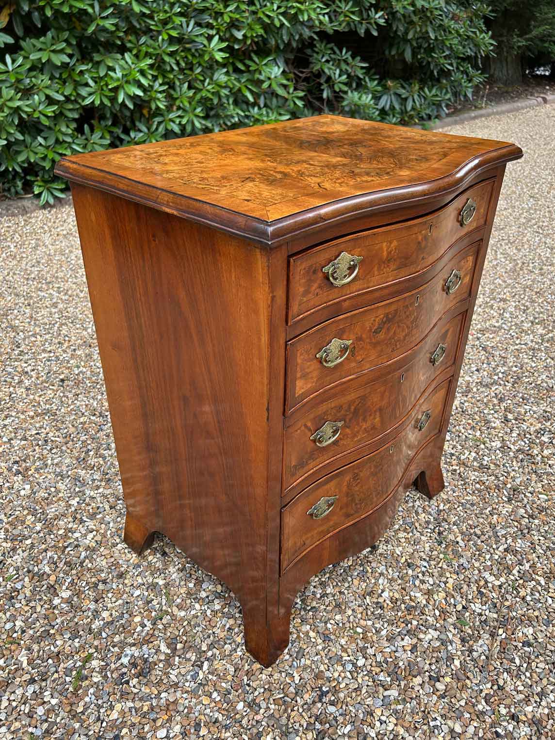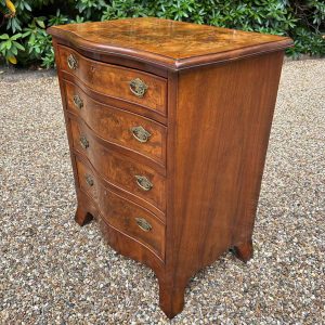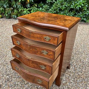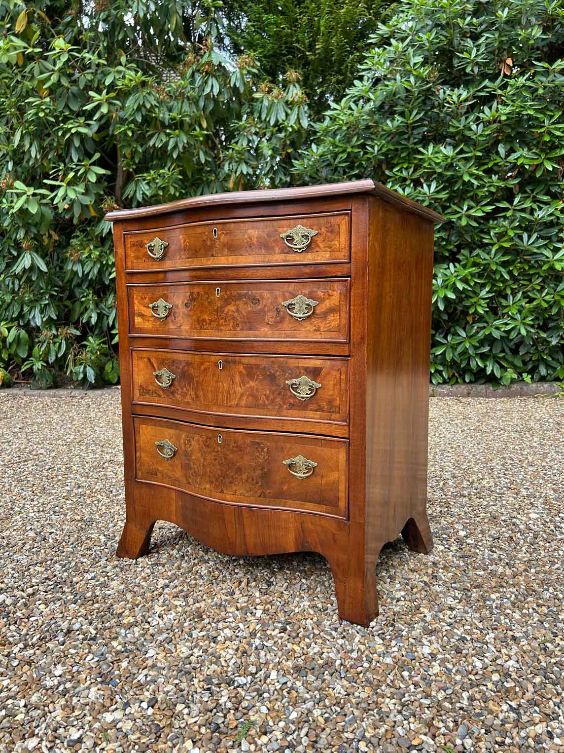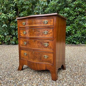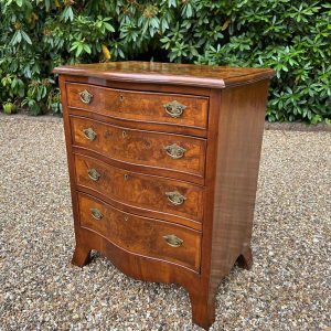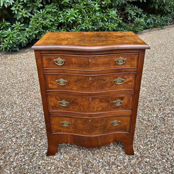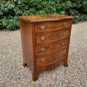 A Small Edwardian Walnut Serpentine Chest Of Drawers with four long oak lined drawers, brass fittings on splayed bracket feet.