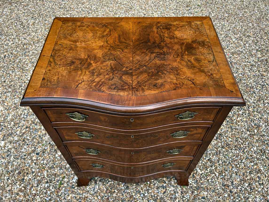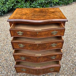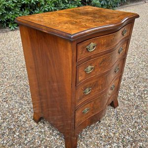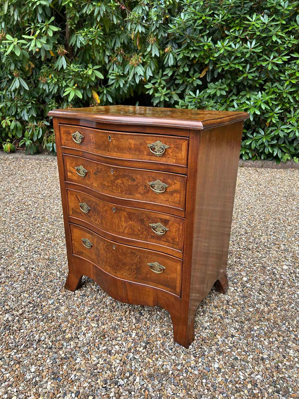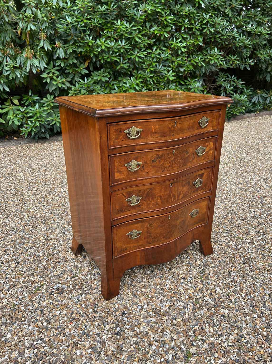 A Small Edwardian Walnut Serpentine Chest Of Drawers with four long oak lined drawers, brass fittings on splayed bracket feet.
