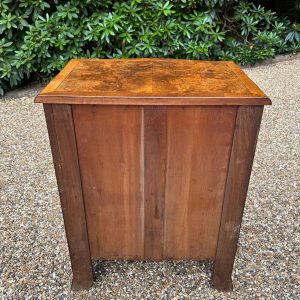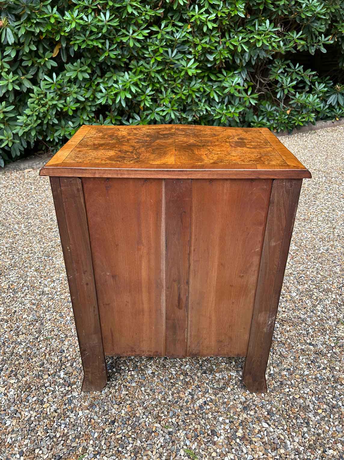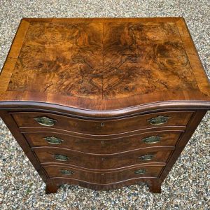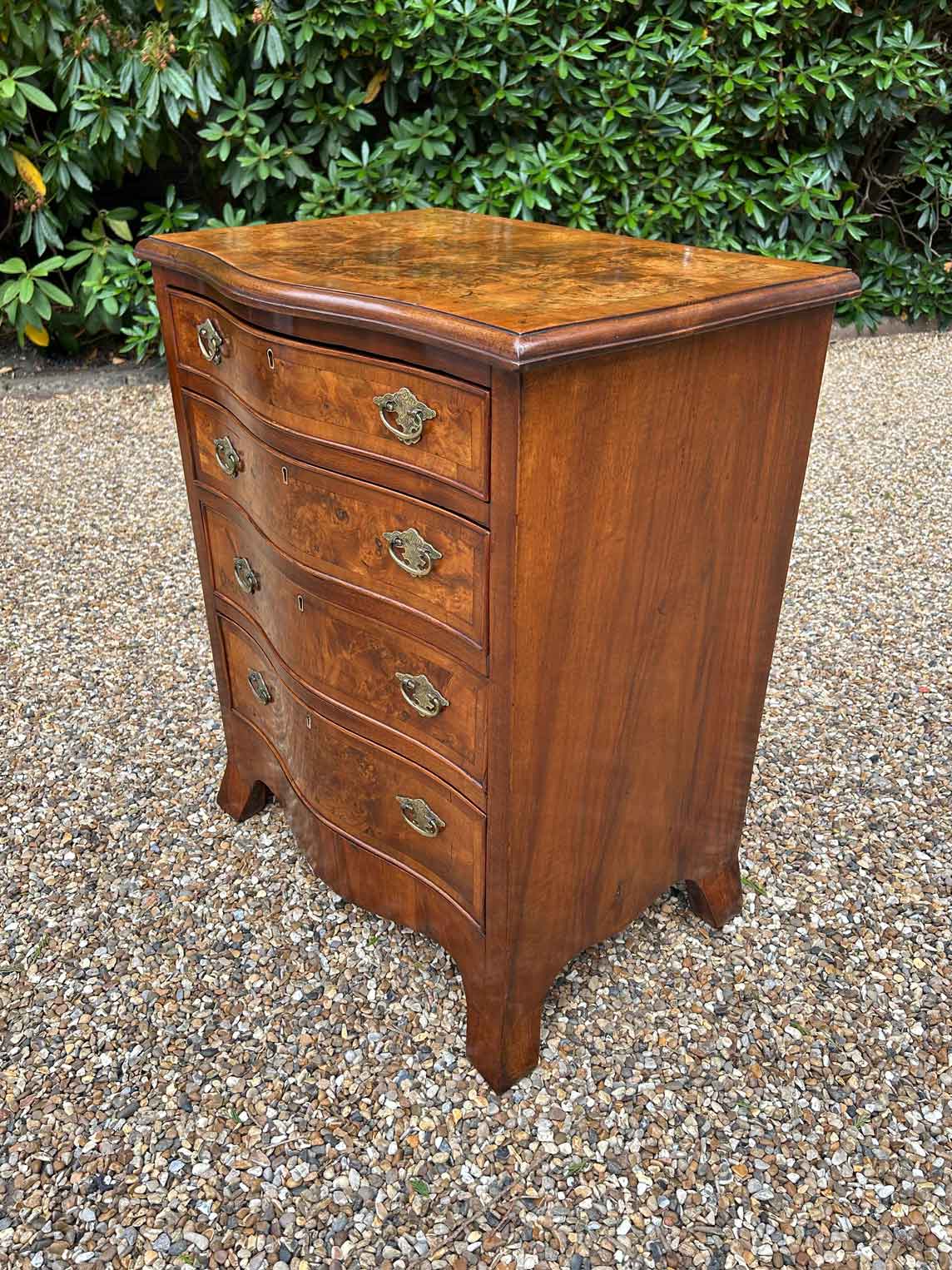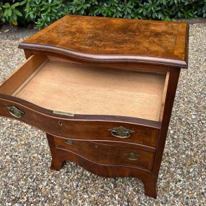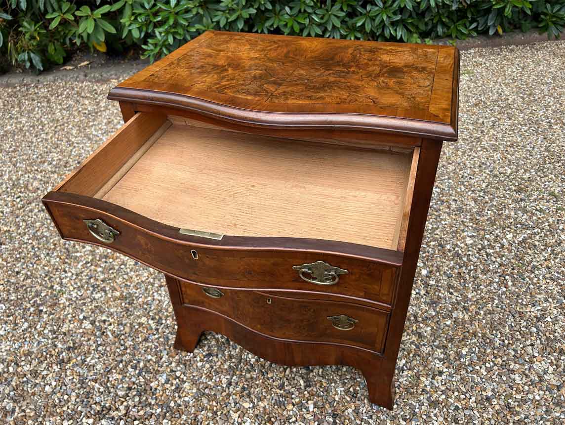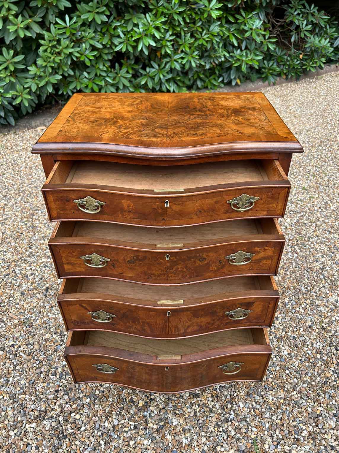 A Small Edwardian Walnut Serpentine Chest Of Drawers with four long oak lined drawers, brass fittings on splayed bracket feet.