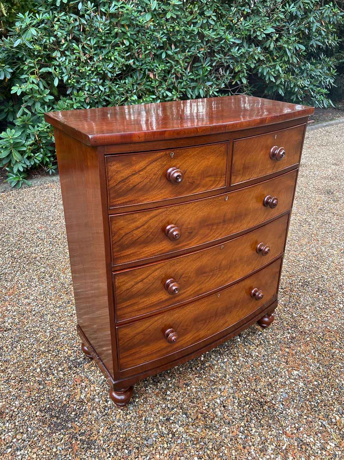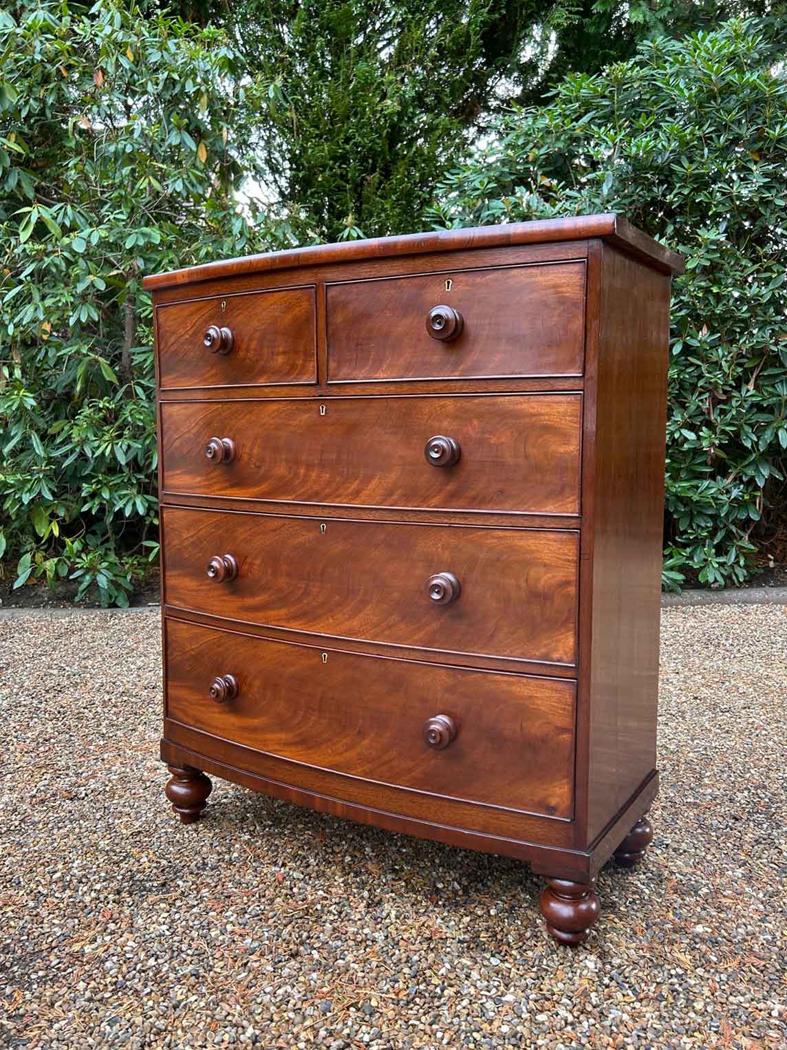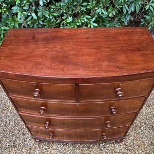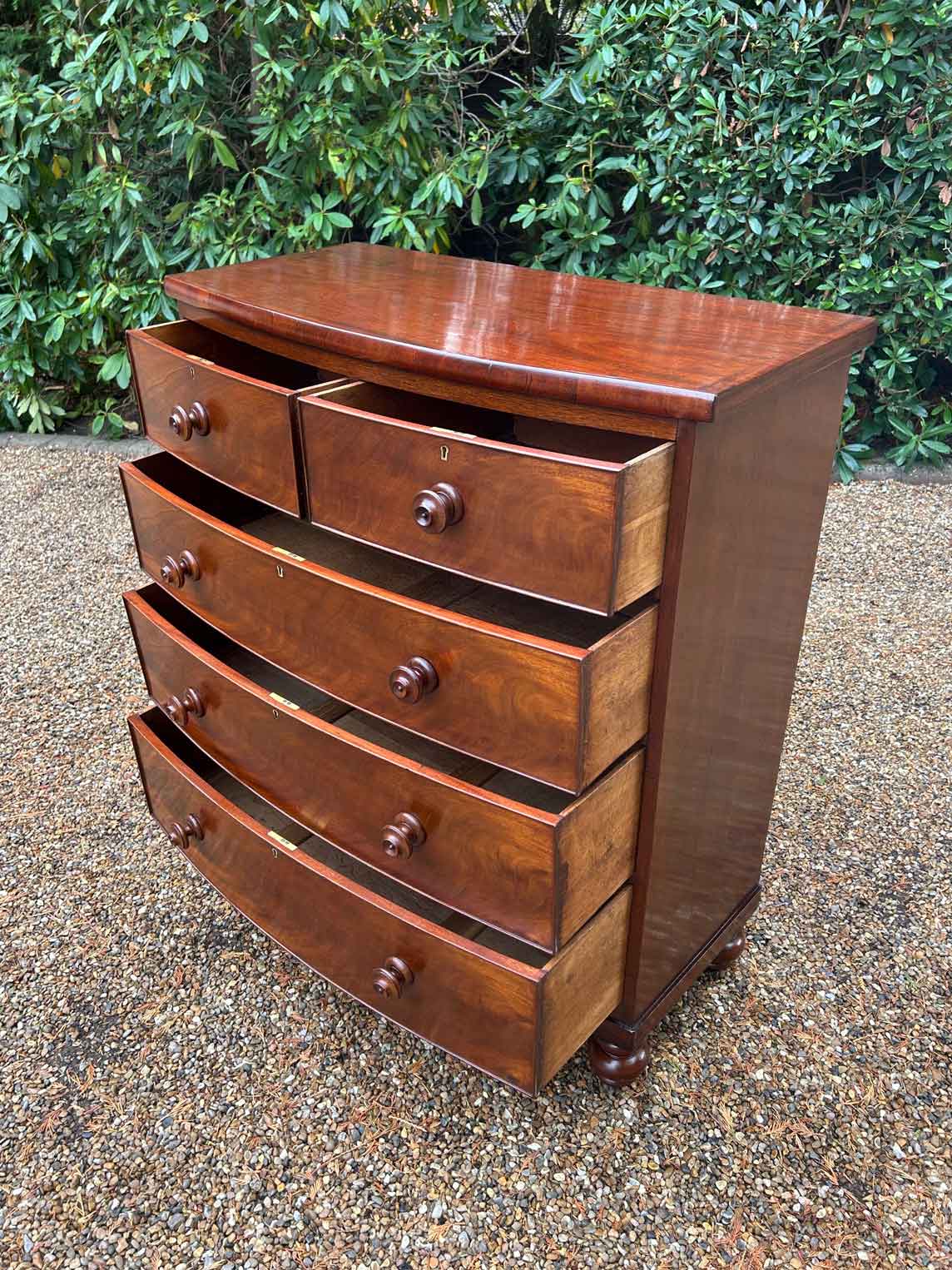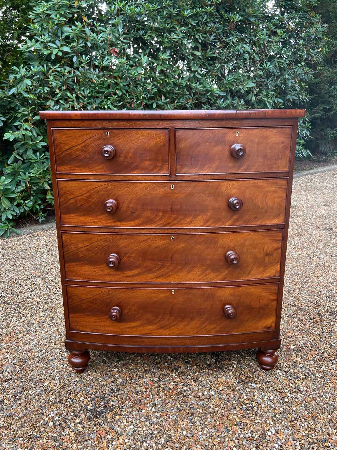 A 19th Century Mahogany Bow Fronted Chest of Drawers, with two short and three long graduated oak lined drawers with turned bun handles raised upon turned feet.
