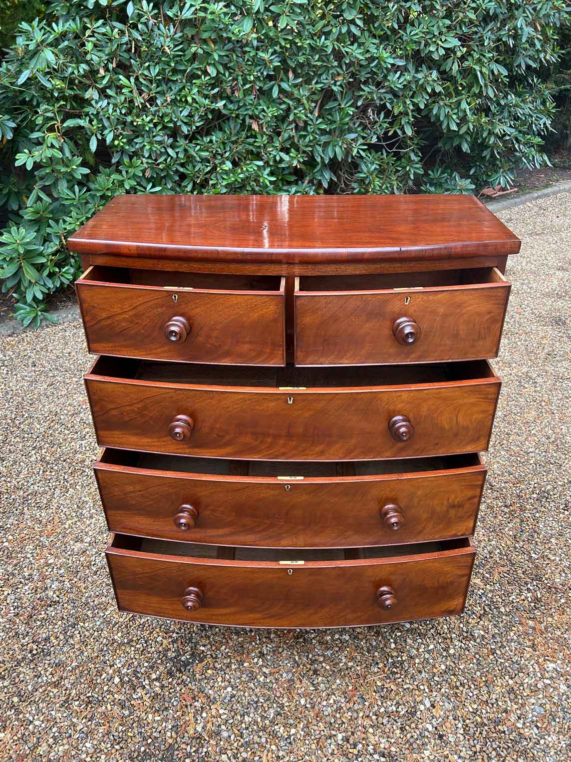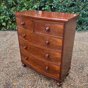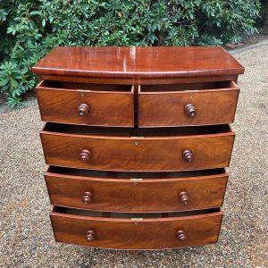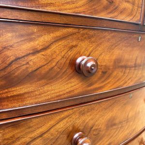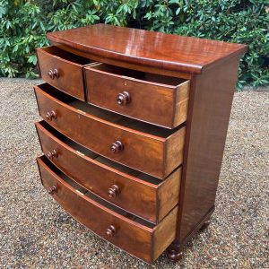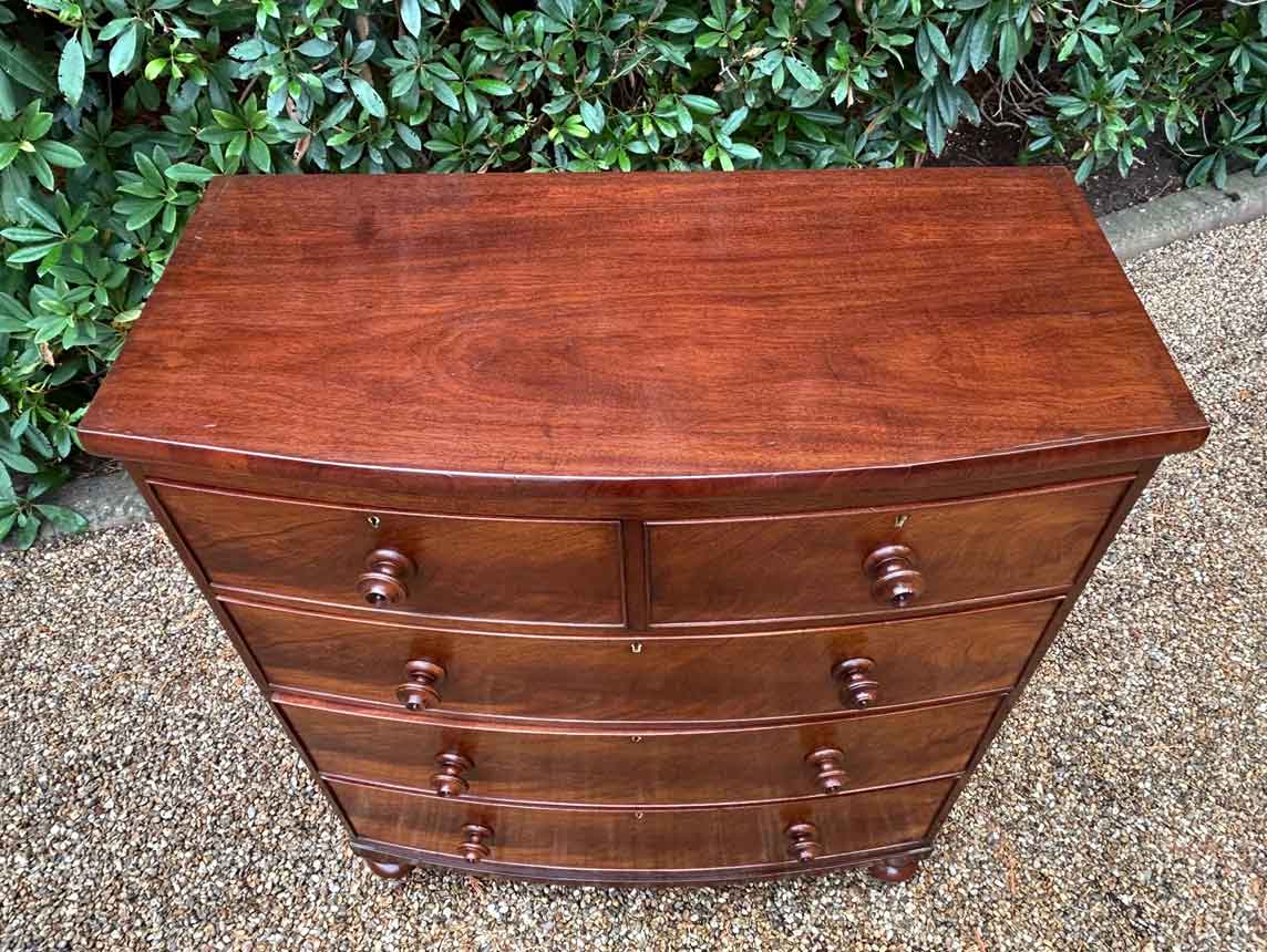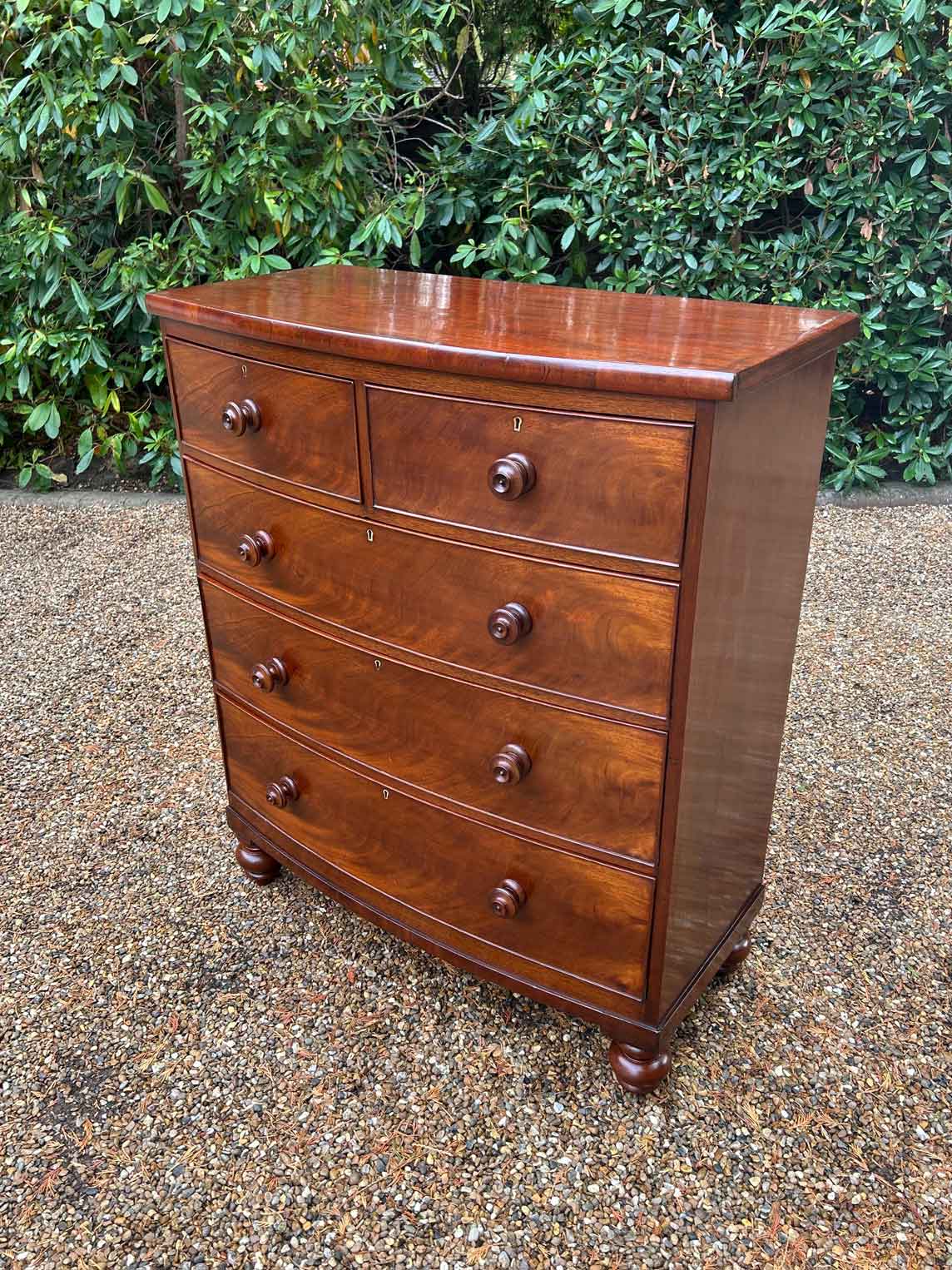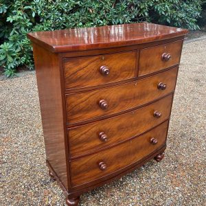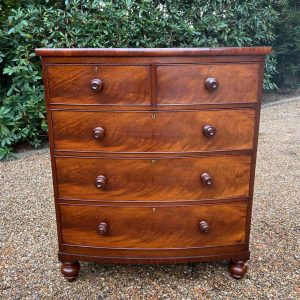A 19th Century Mahogany Bow Fronted Chest of Drawers, with two short and three long graduated oak lined drawers with turned bun handles raised upon turned feet.