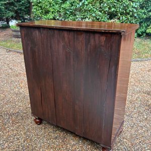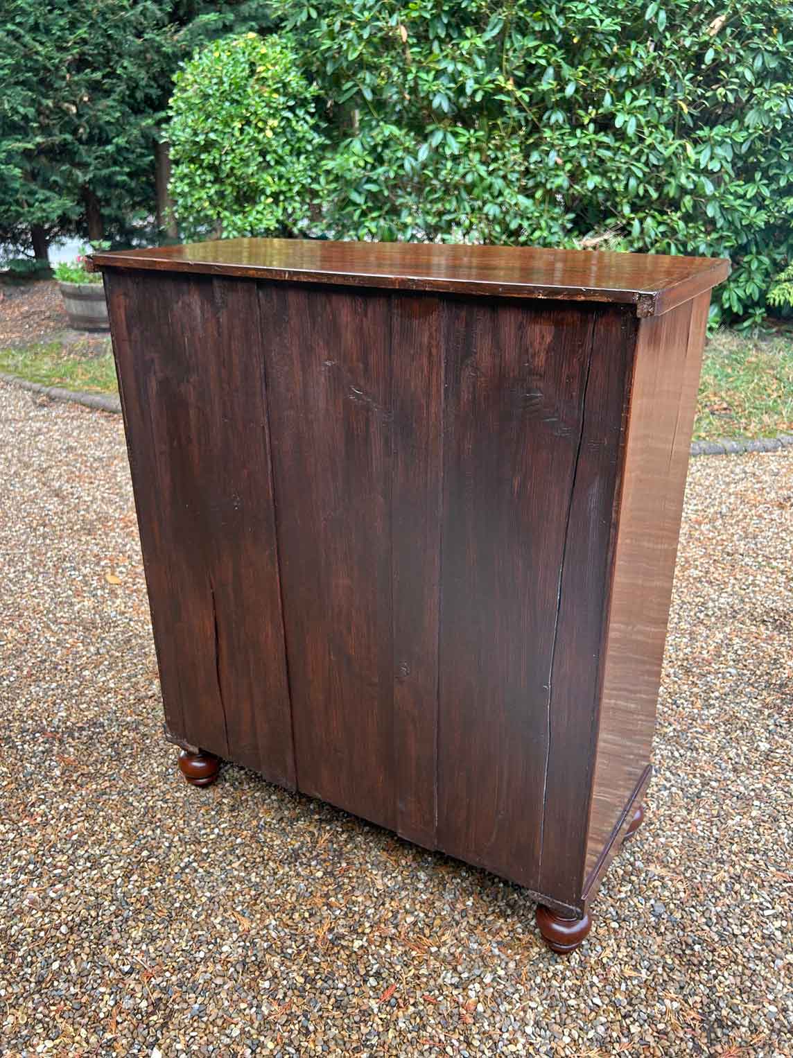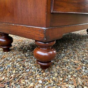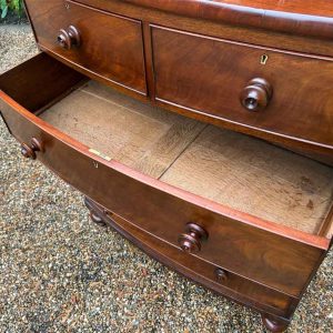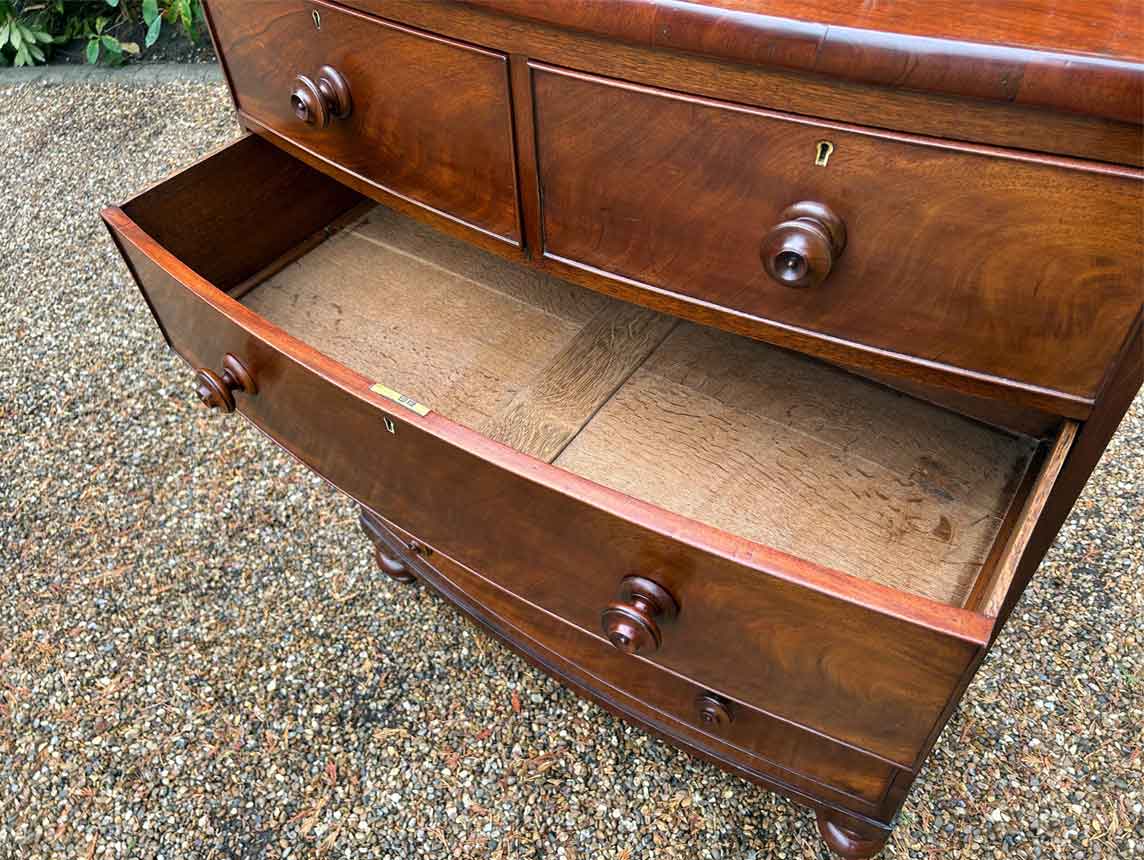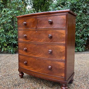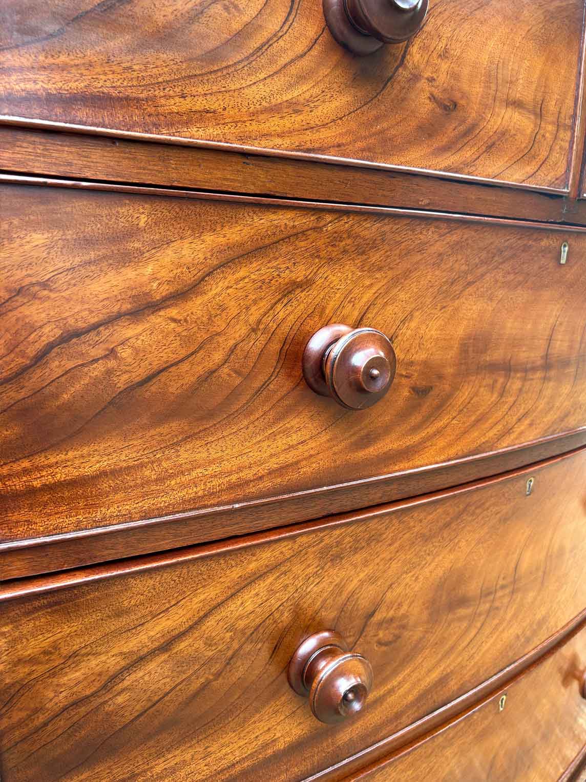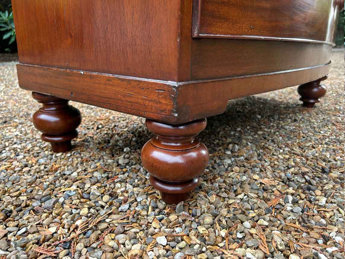 A 19th Century Mahogany Bow Fronted Chest of Drawers, with two short and three long graduated oak lined drawers with turned bun handles raised upon turned feet.