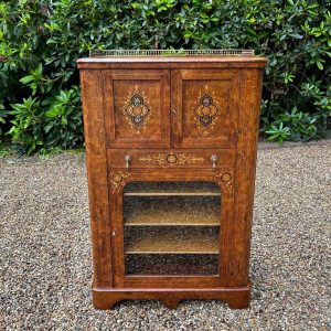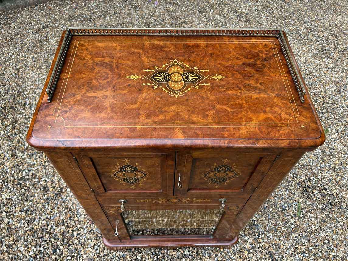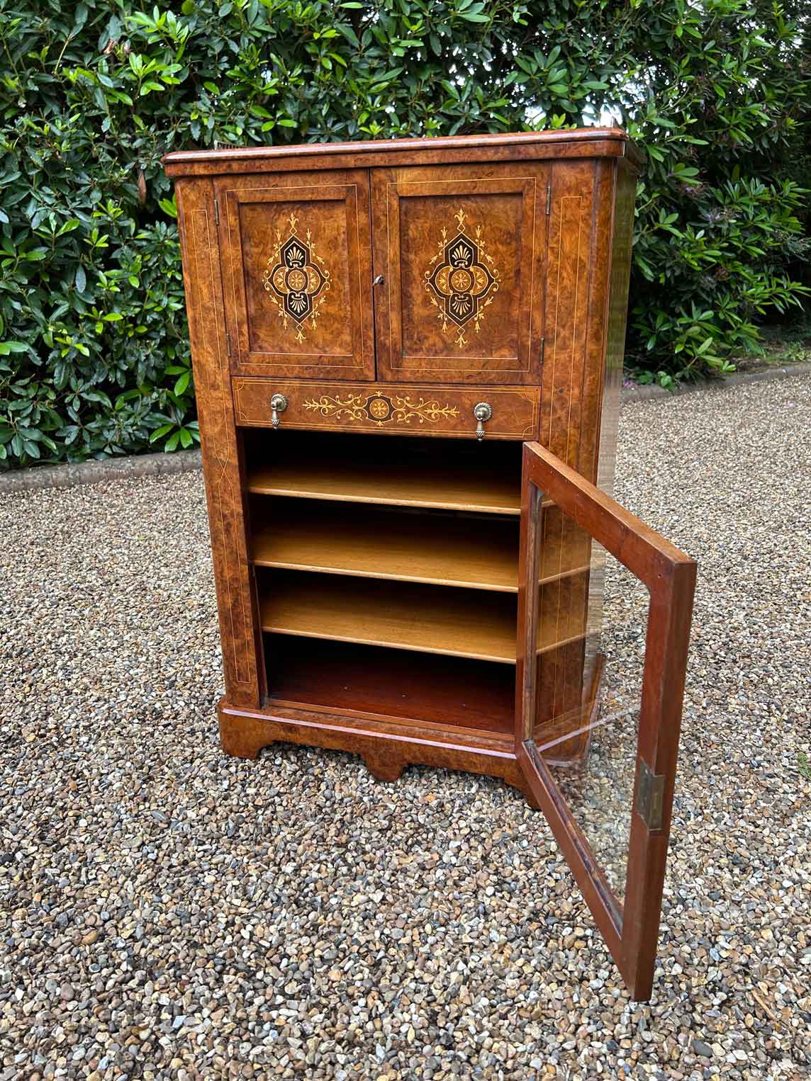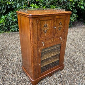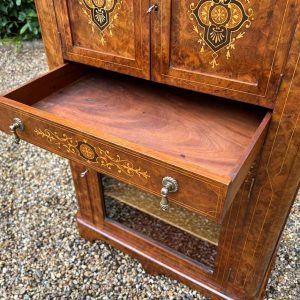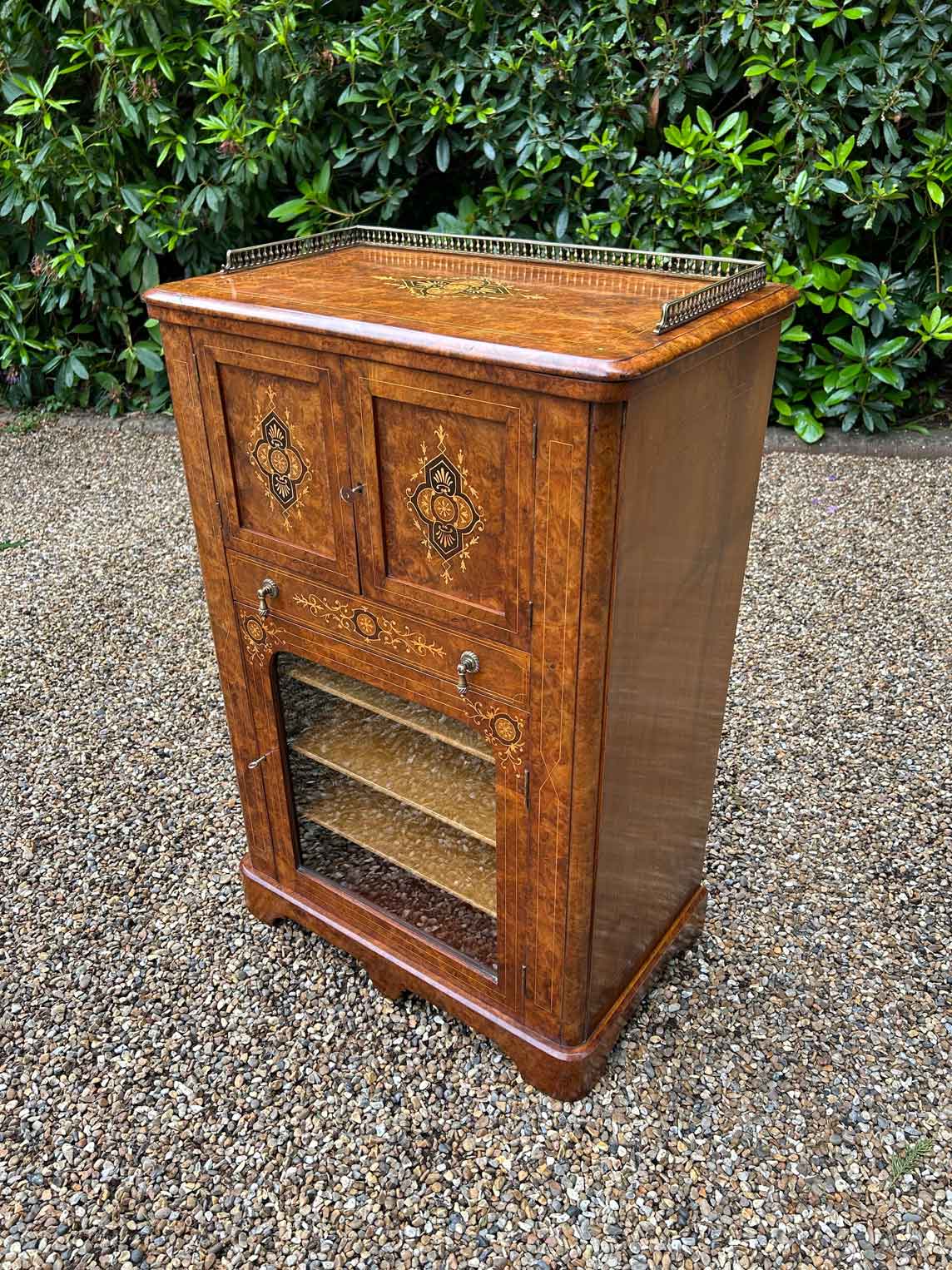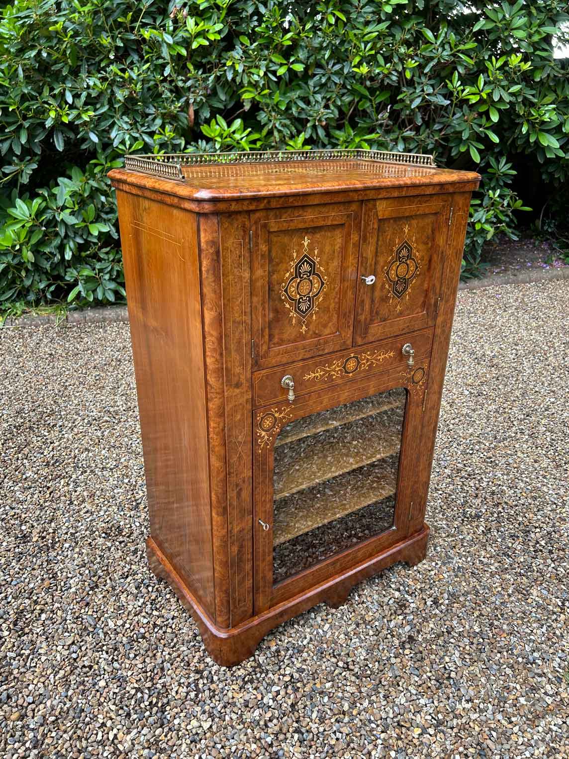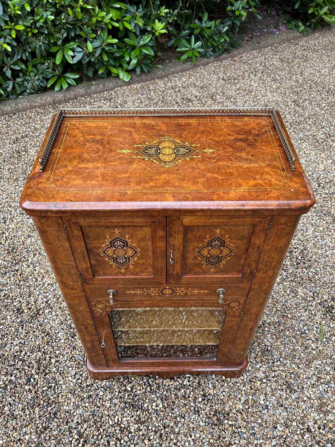 A very high quality 19th Century Victorian Burr Walnut Marquetry & Inlaid Cabinet with brass gallery to top, above two doors, a drawer and a glazed door enclosing shelves and working keys.