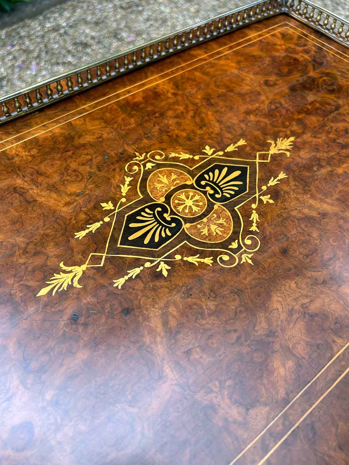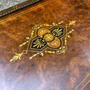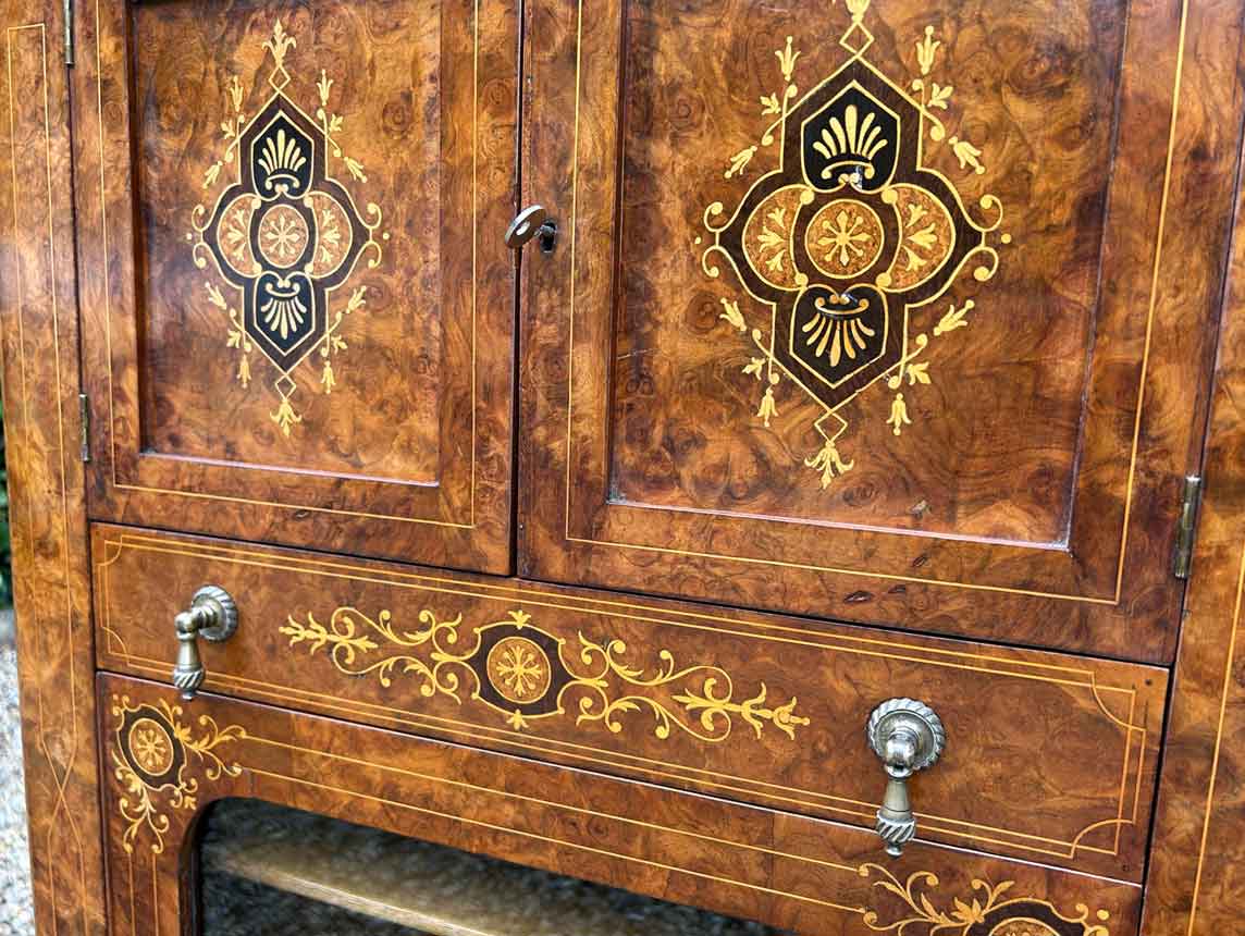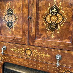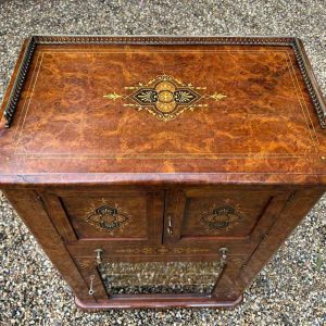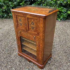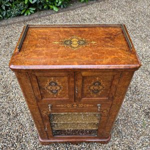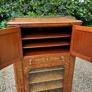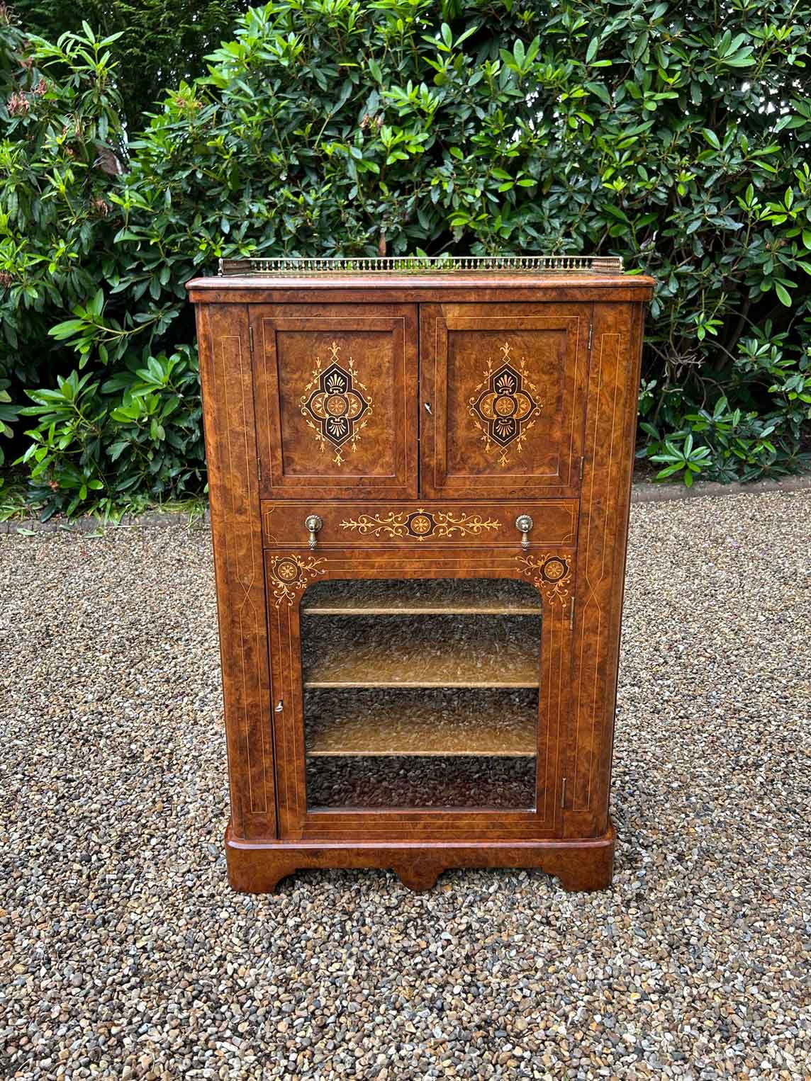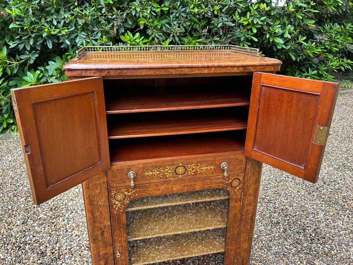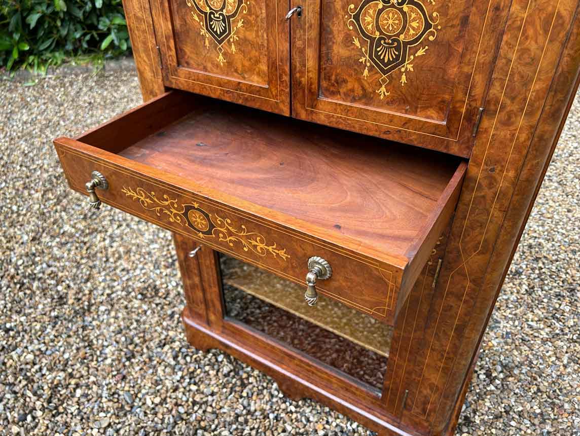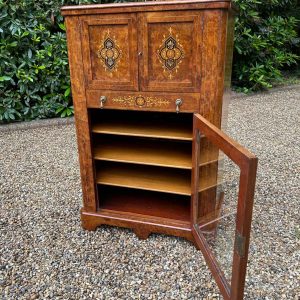 A very high quality 19th Century Victorian Burr Walnut Marquetry & Inlaid Cabinet with brass gallery to top, above two doors, a drawer and a glazed door enclosing shelves and working keys.