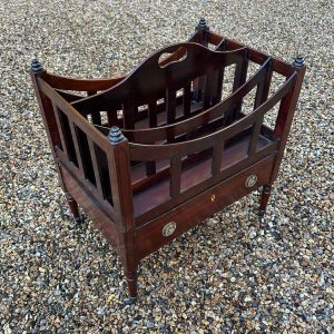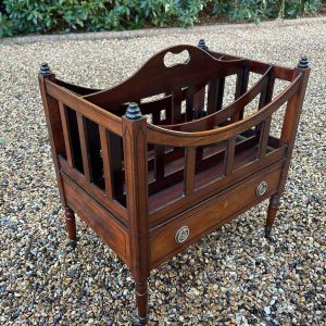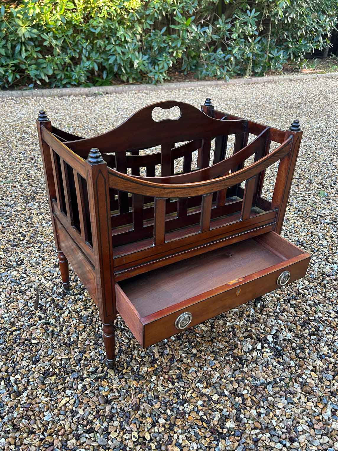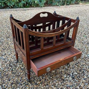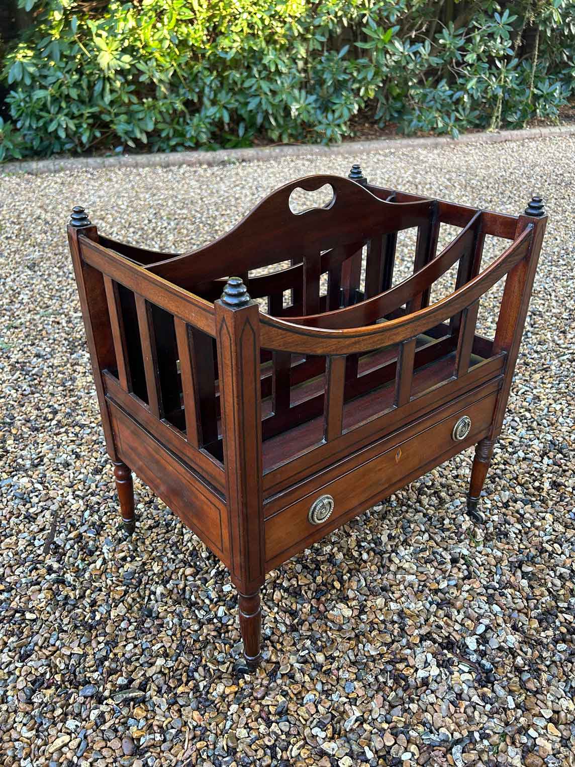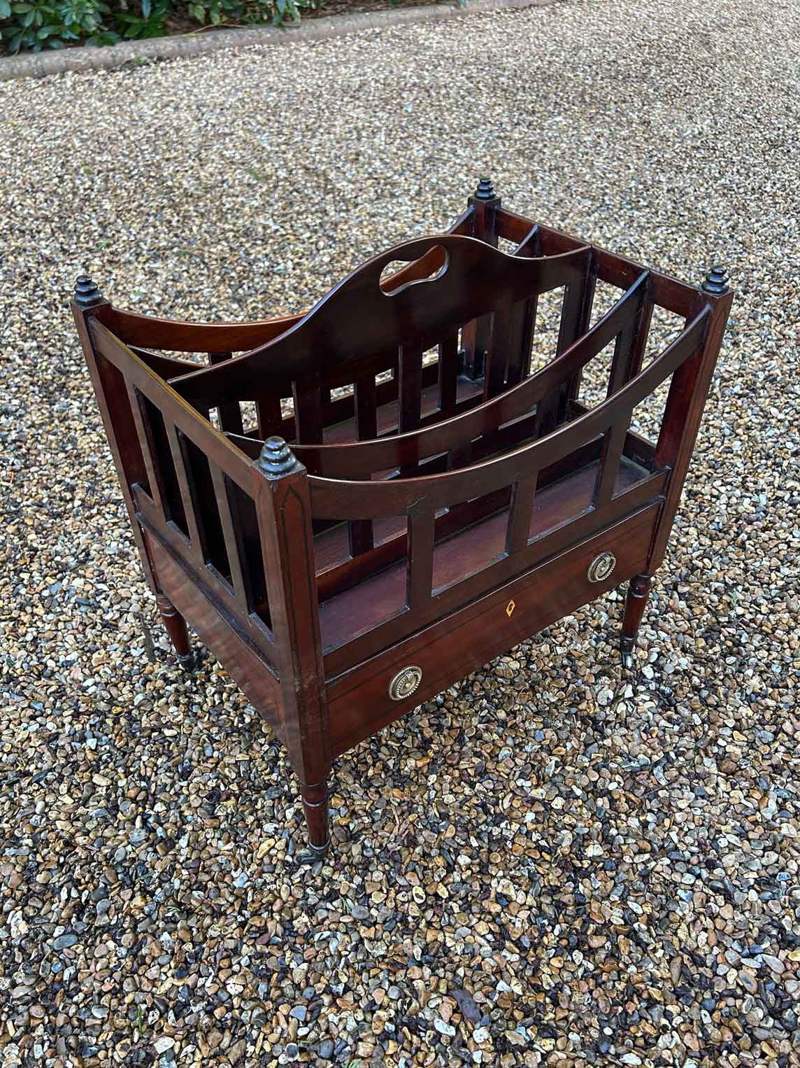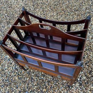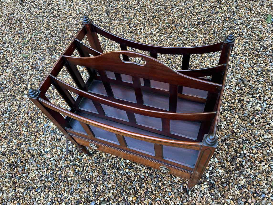 19th Century Georgian Inlaid Mahogany Canterbury with four sections above a single fitted drawer raised on turned turned legs with castors.