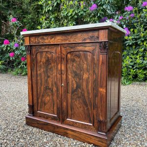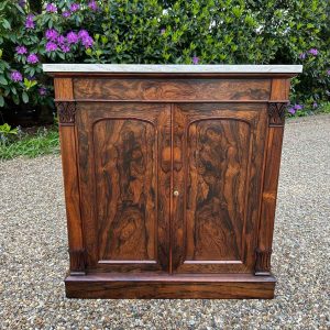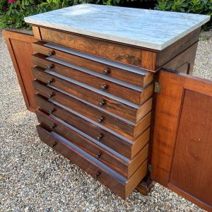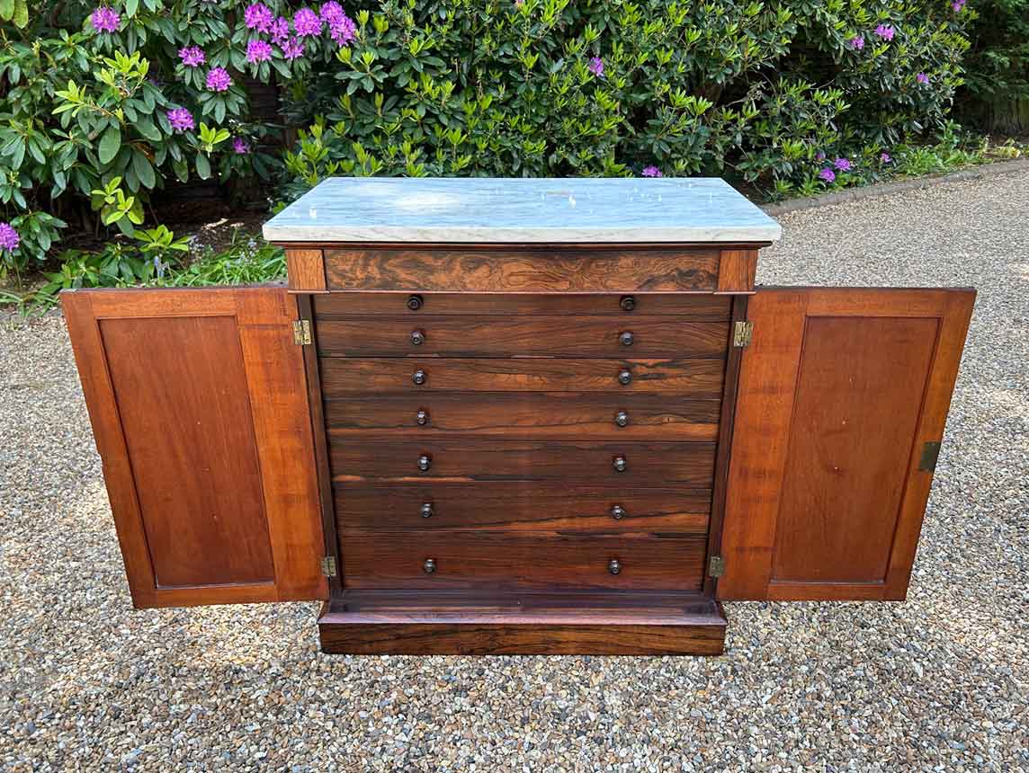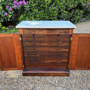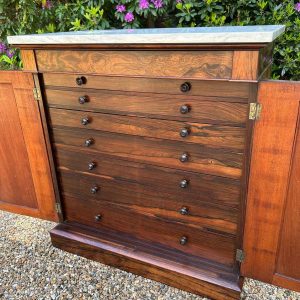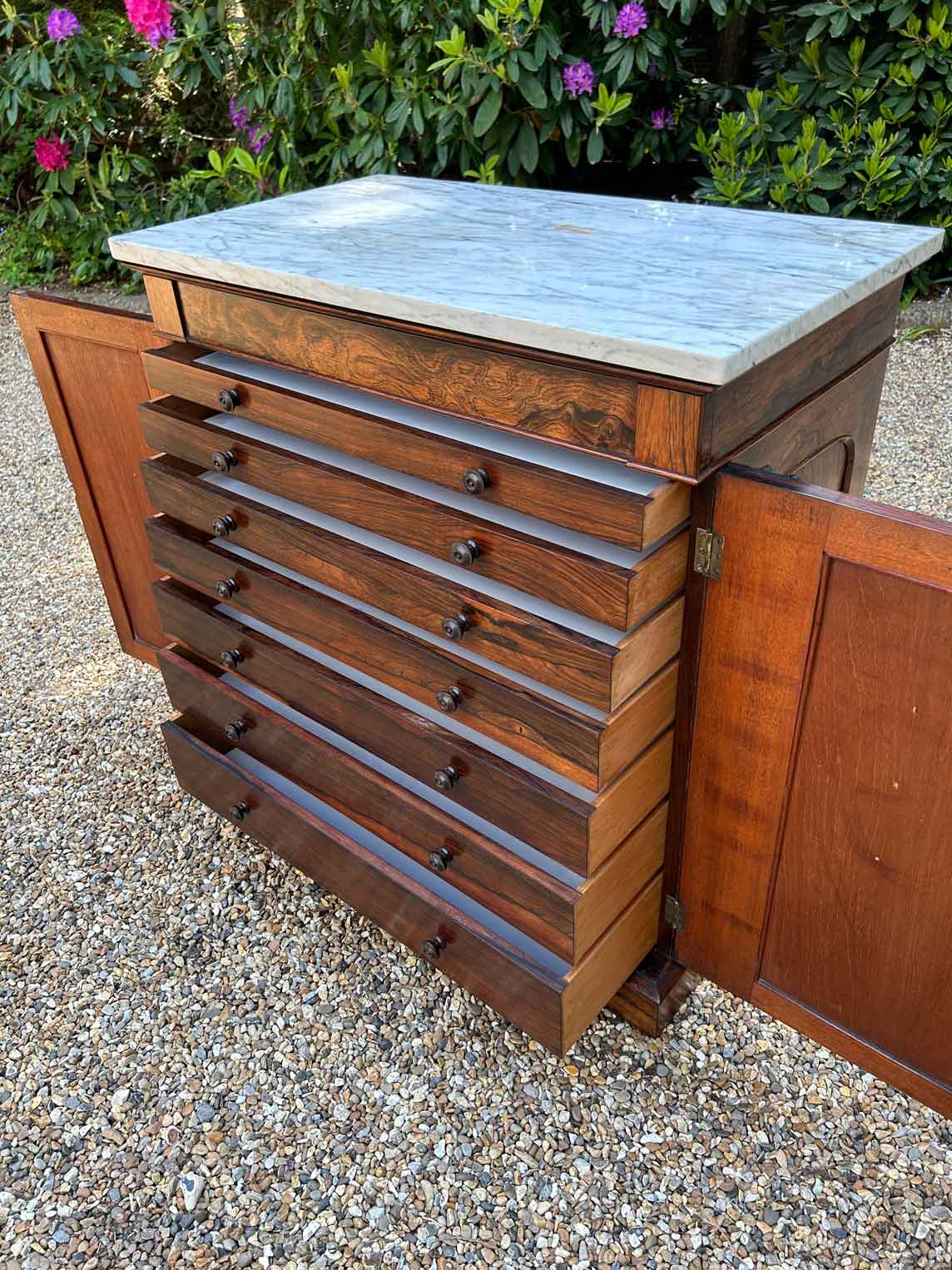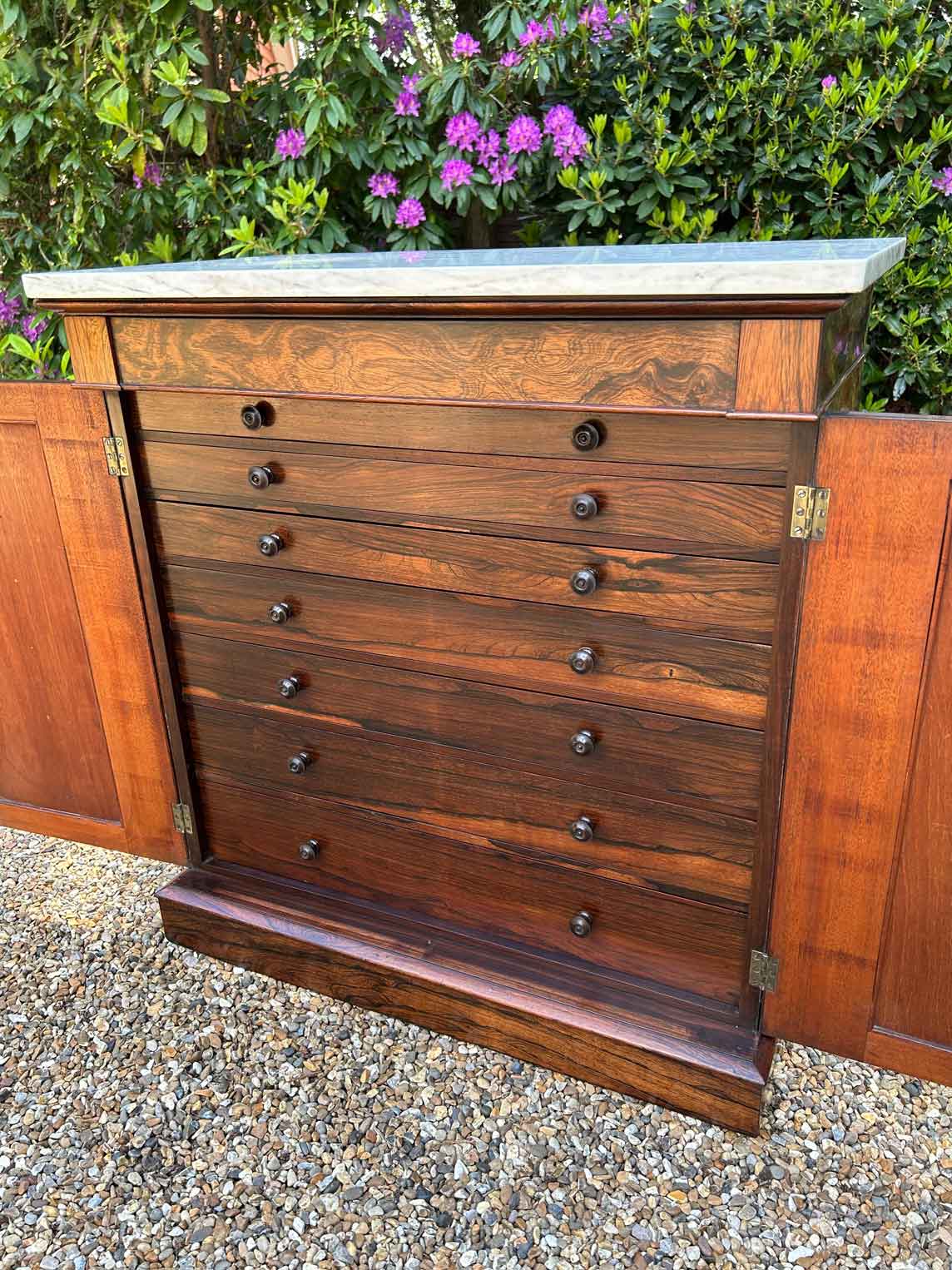 A very high quality 19th Century Regency Rosewood Collector’s Cabinet with Marble Top fitted with two doors, eight fitted drawers with turned rosewood bun handles and cedar wood lined drawers, on a plinth base.