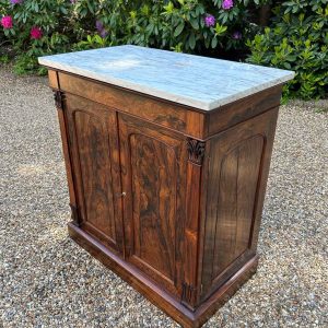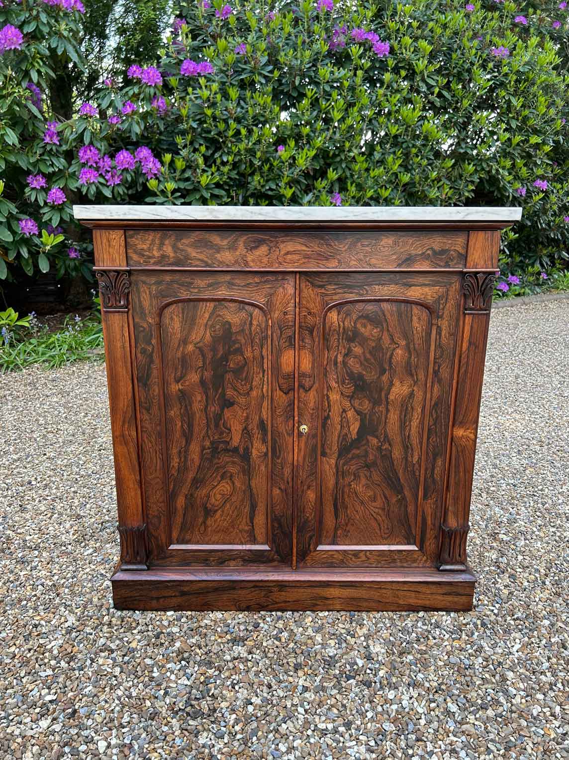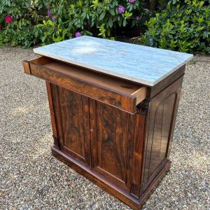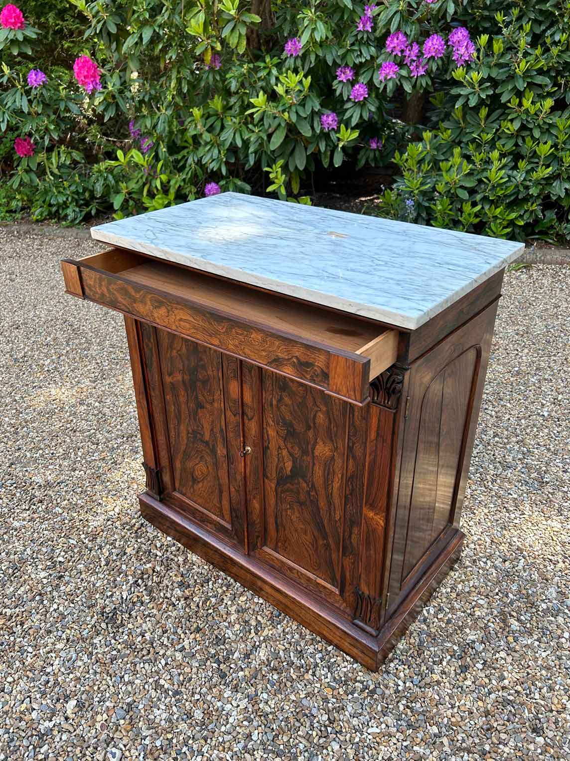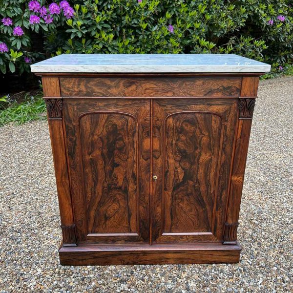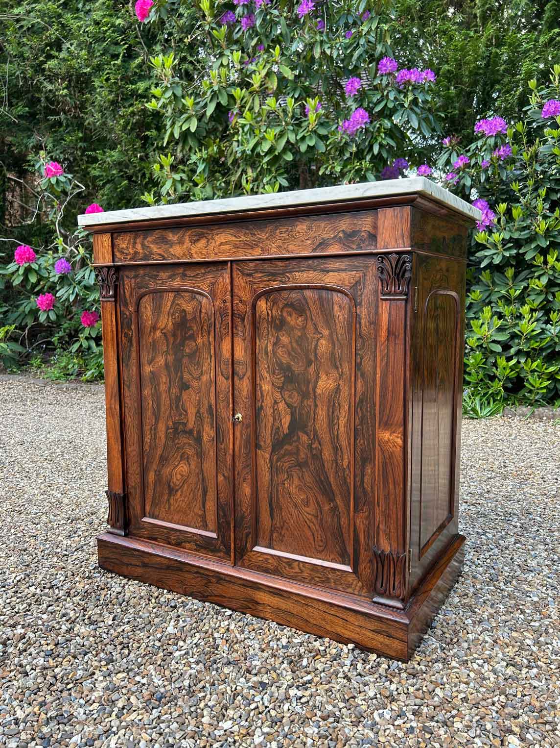 A very high quality 19th Century Regency Rosewood Collector’s Cabinet with Marble Top fitted with two doors, eight fitted drawers with turned rosewood bun handles and cedar wood lined drawers, on a plinth base.