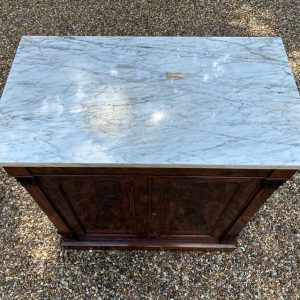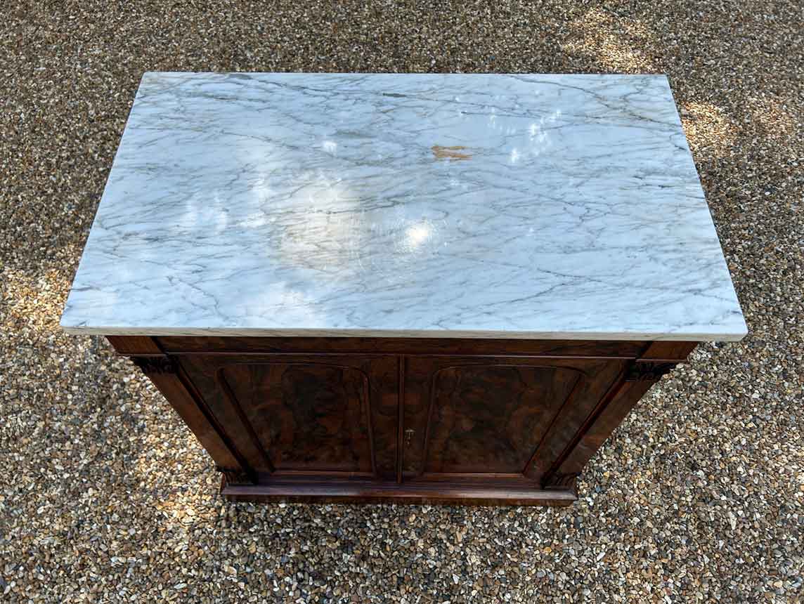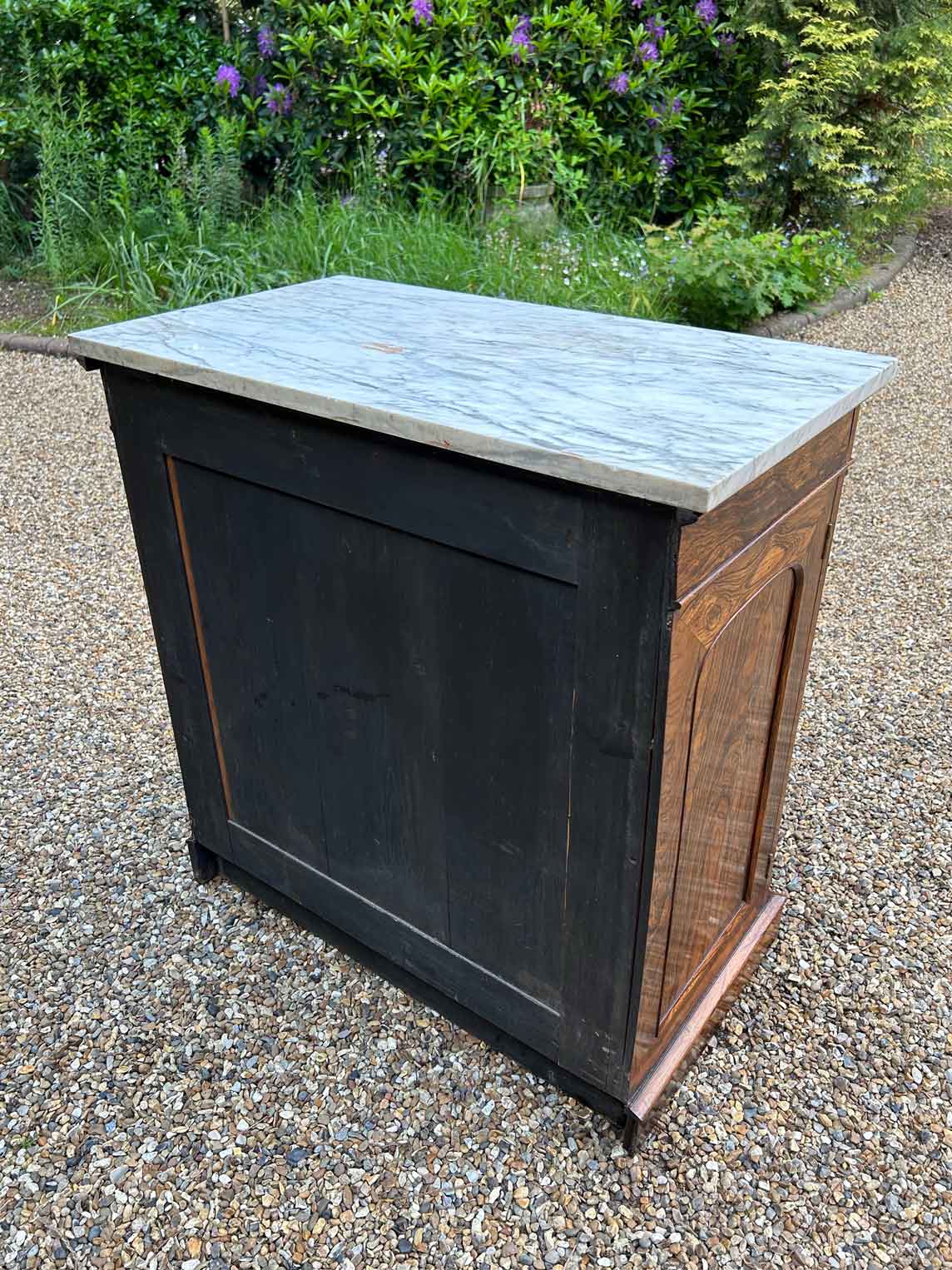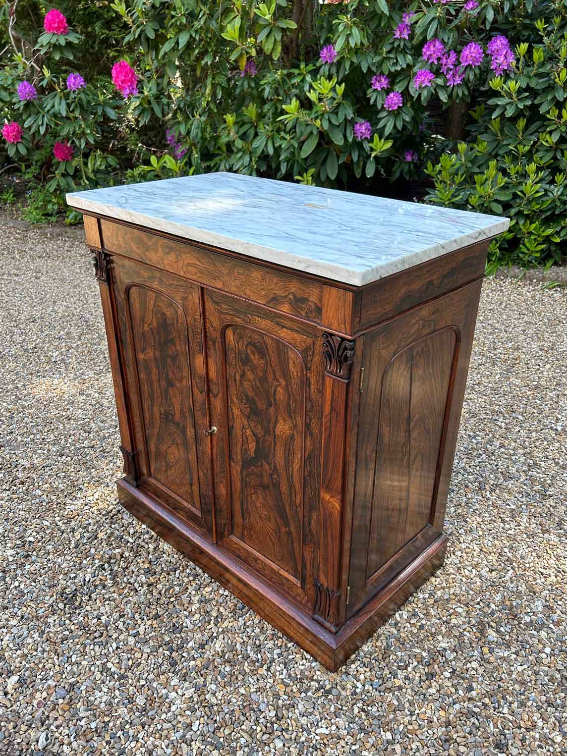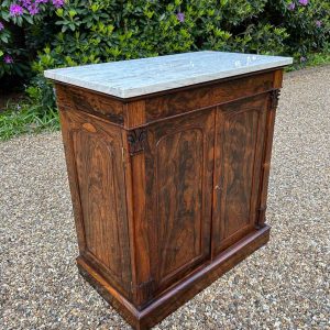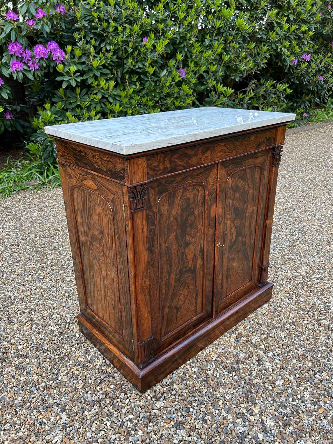A very high quality 19th Century Regency Rosewood Collector’s Cabinet with Marble Top fitted with two doors, eight fitted drawers with turned rosewood bun handles and cedar wood lined drawers, on a plinth base.