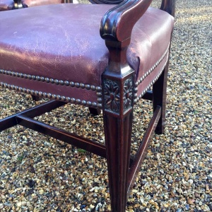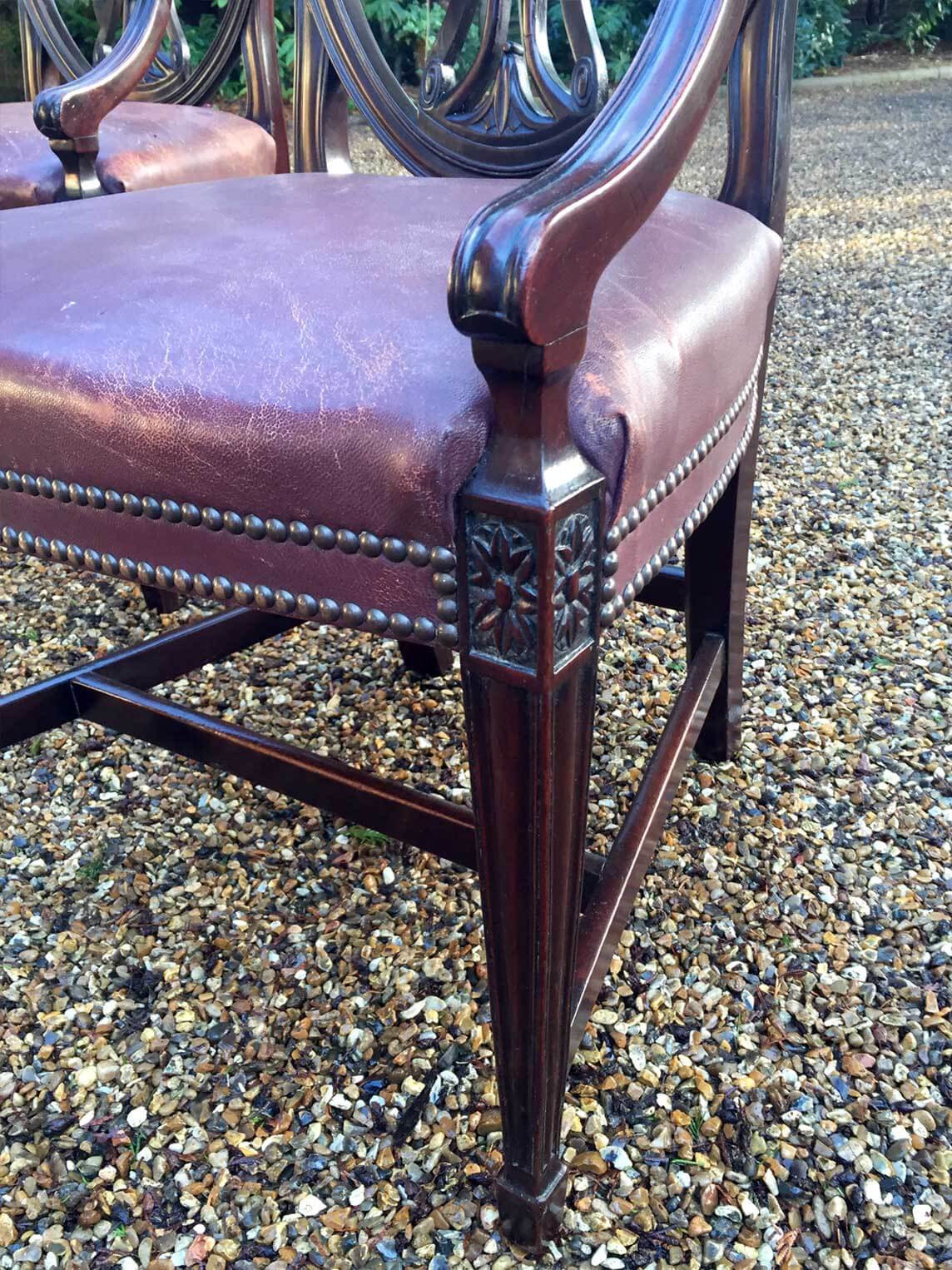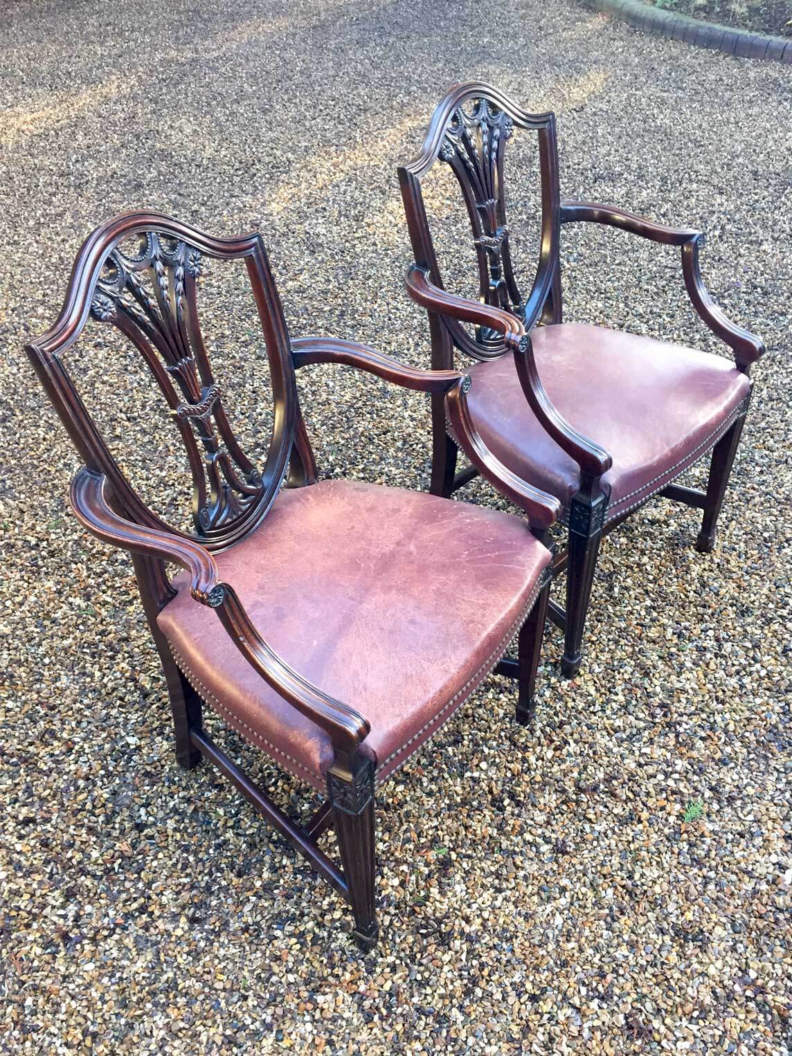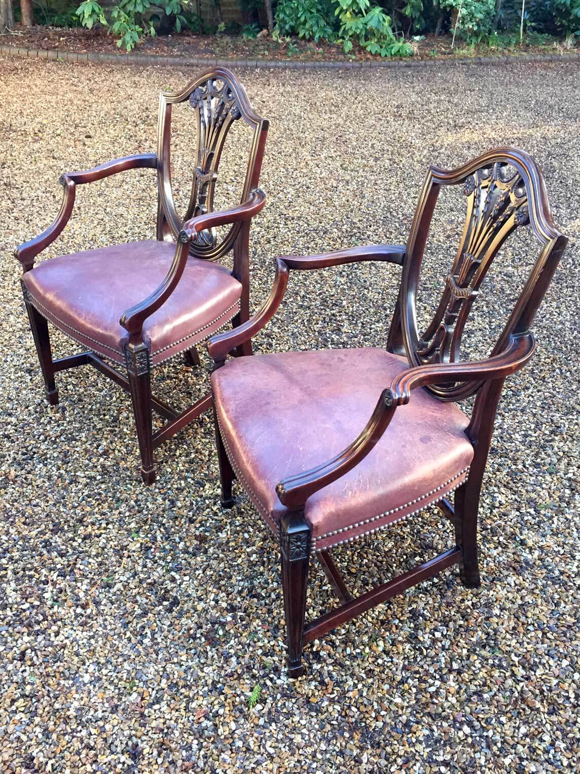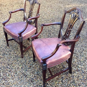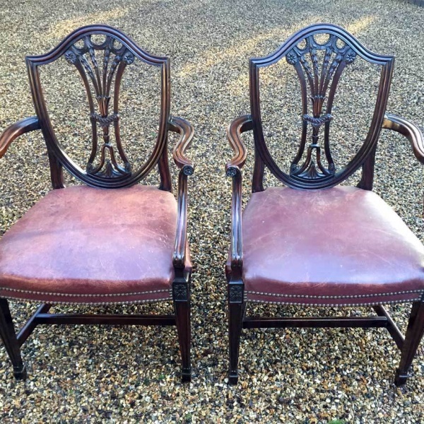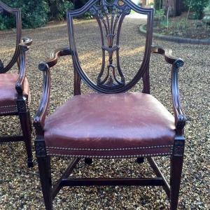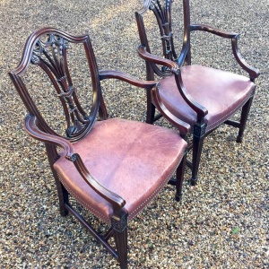 A Pair of 19th Century Mahogany Shield back Carver Chairs. Each carved and pierced splat back above an leather seat, on moulded square tapering legs.