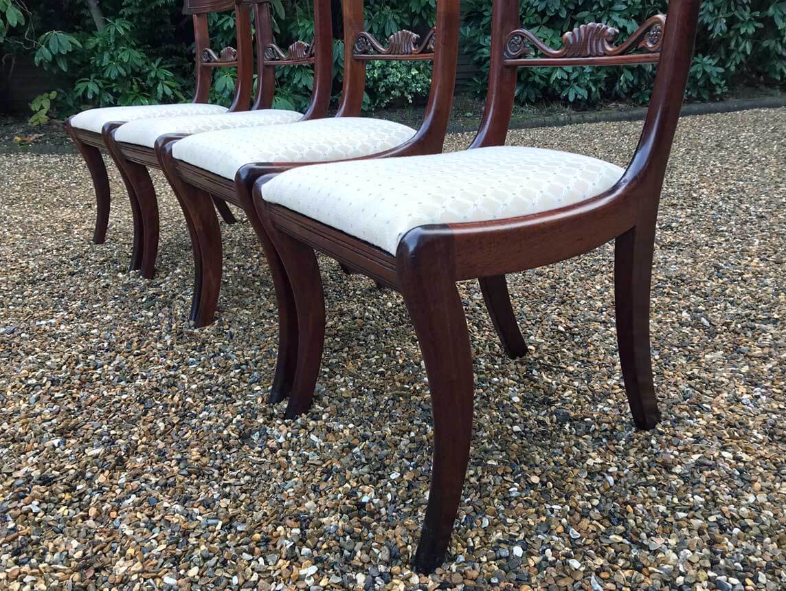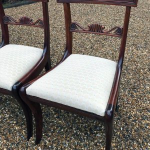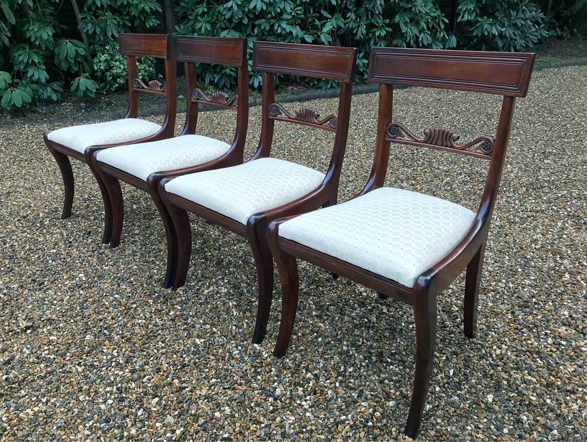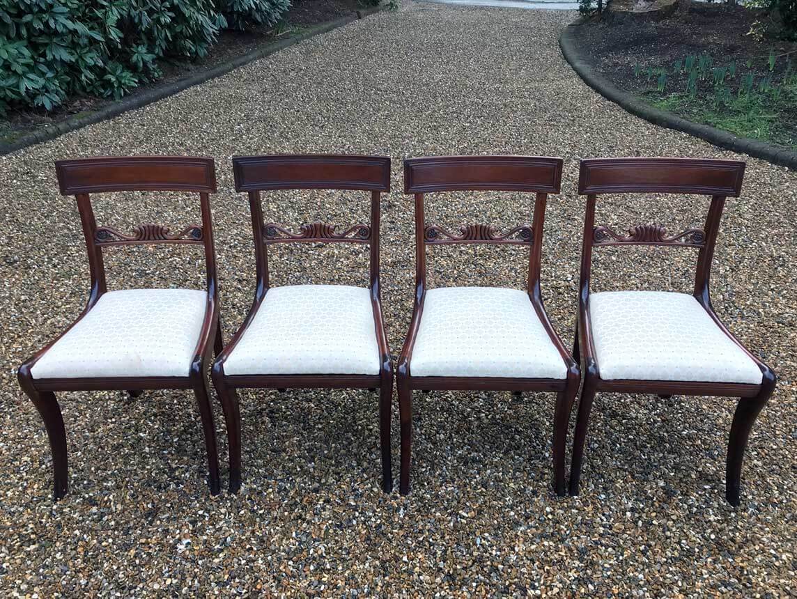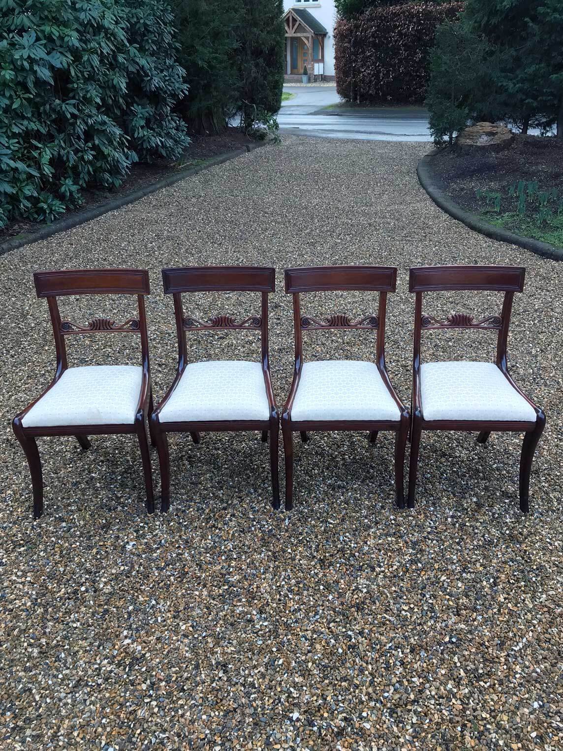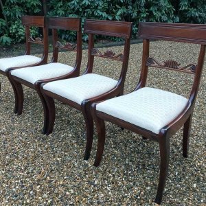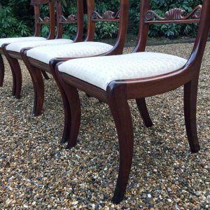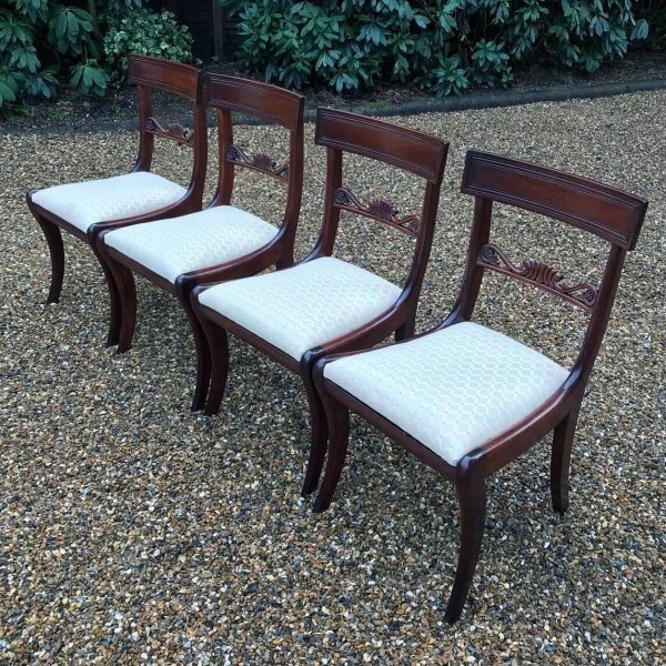A very good quality Set of Four 19th Century Regency Mahogany Dining Chairs with newly upholstered drop-in seats on saber legs.