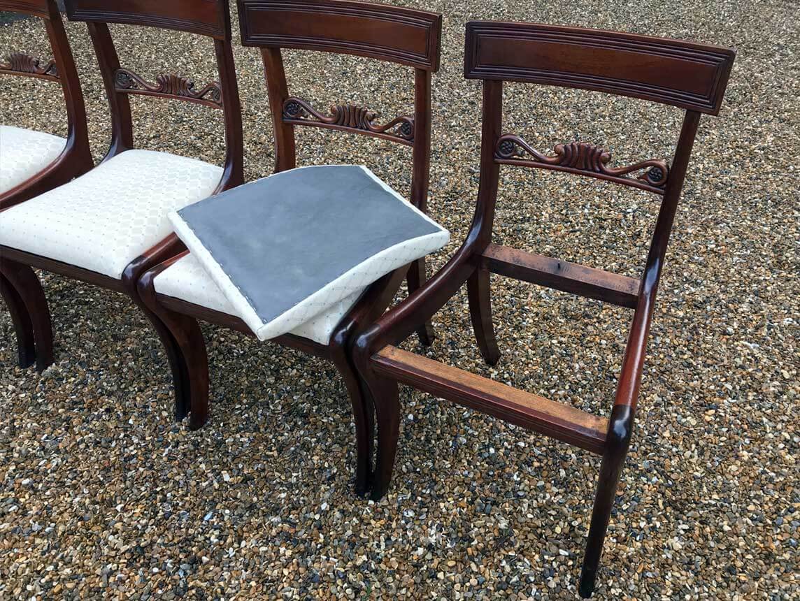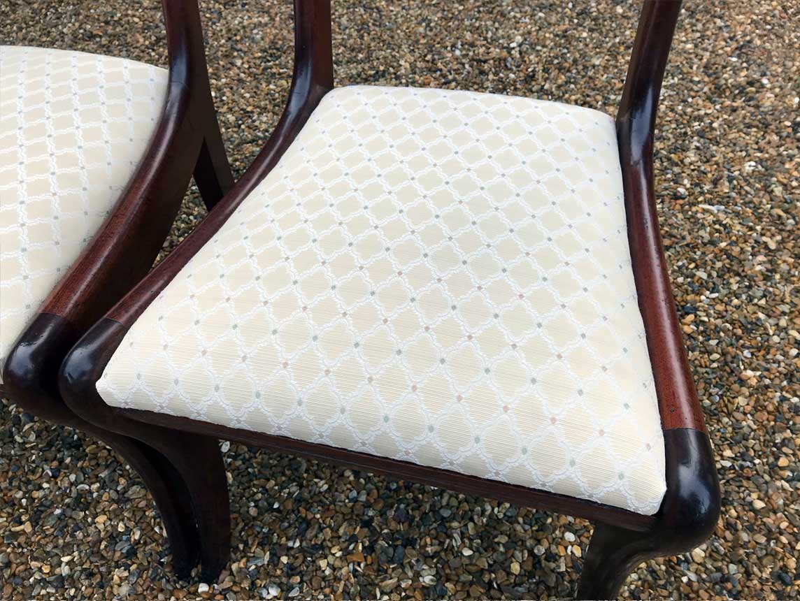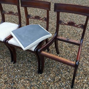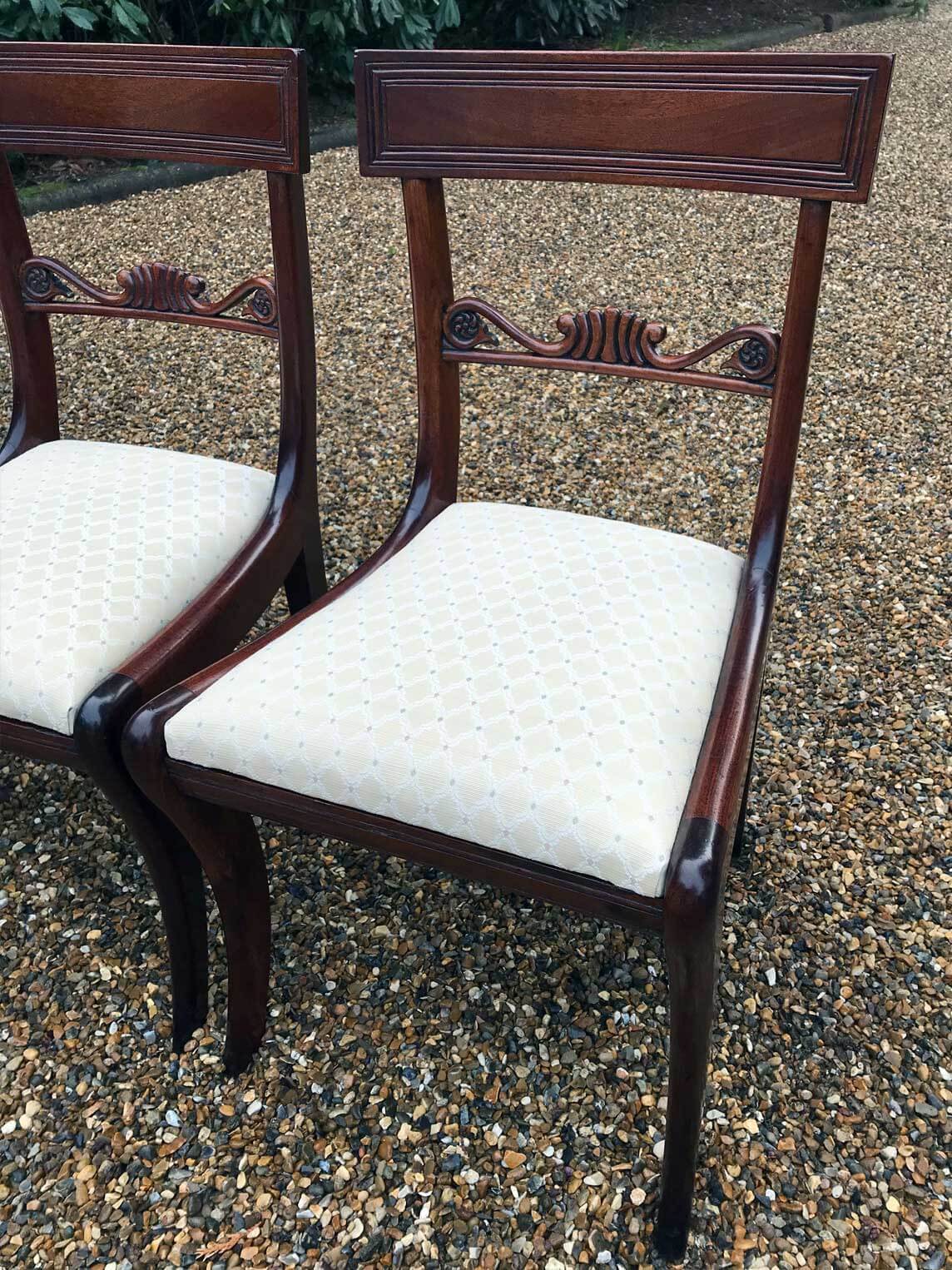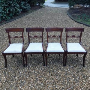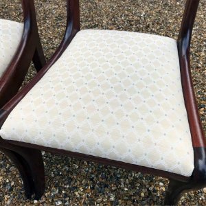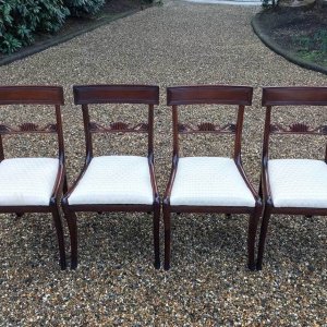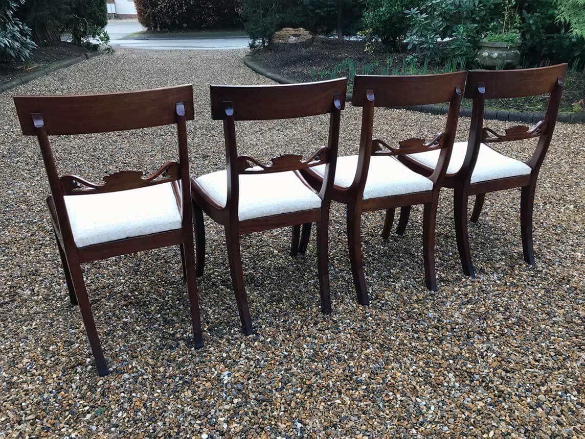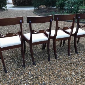 A very good quality Set of Four 19th Century Regency Mahogany Dining Chairs with newly upholstered drop-in seats on saber legs.