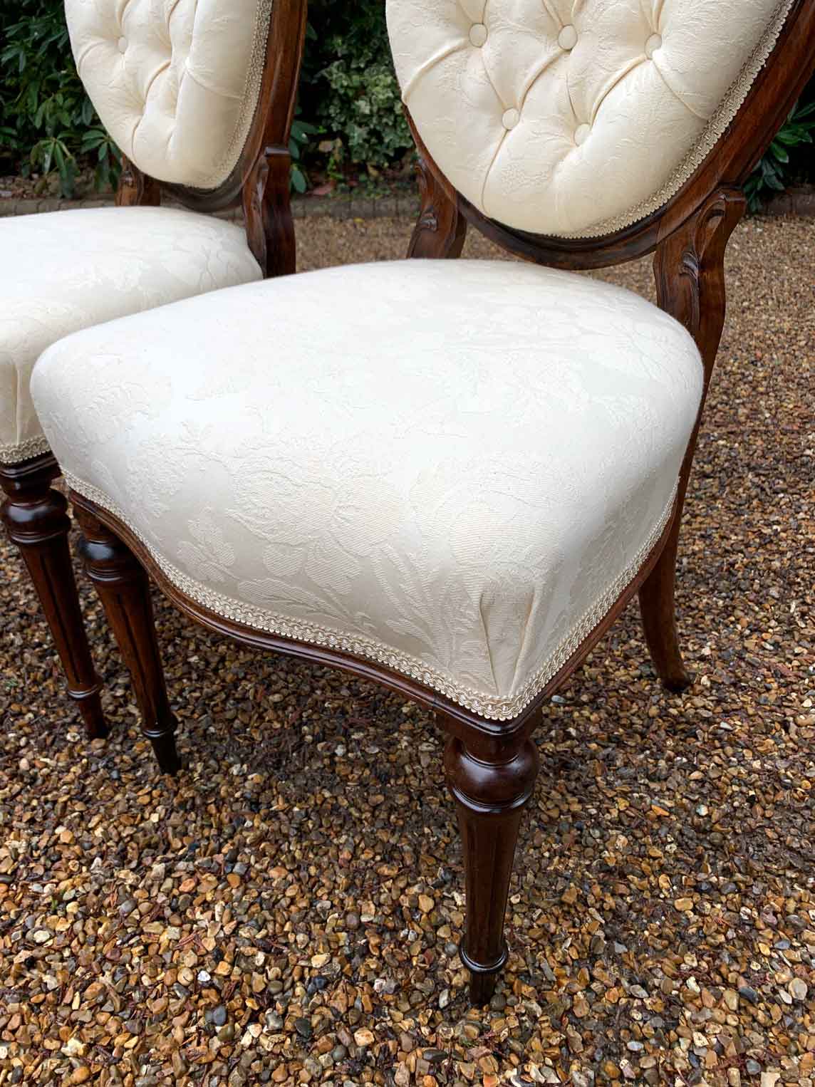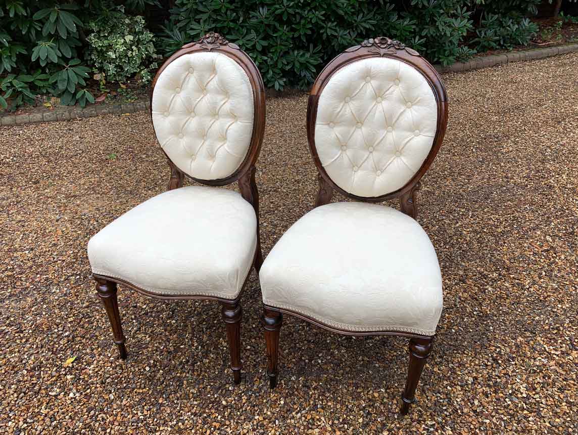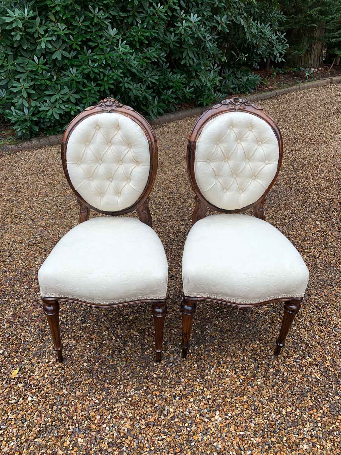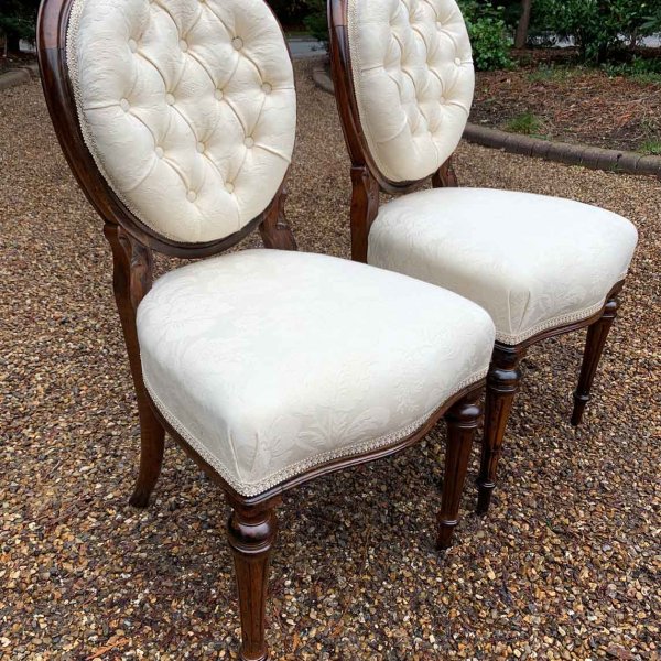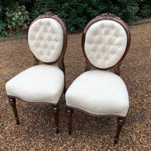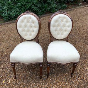 A pair of 19th Century Regency Walnut Chairs with newly upholstered seats with button backs, carving on the top and turned reeded legs.