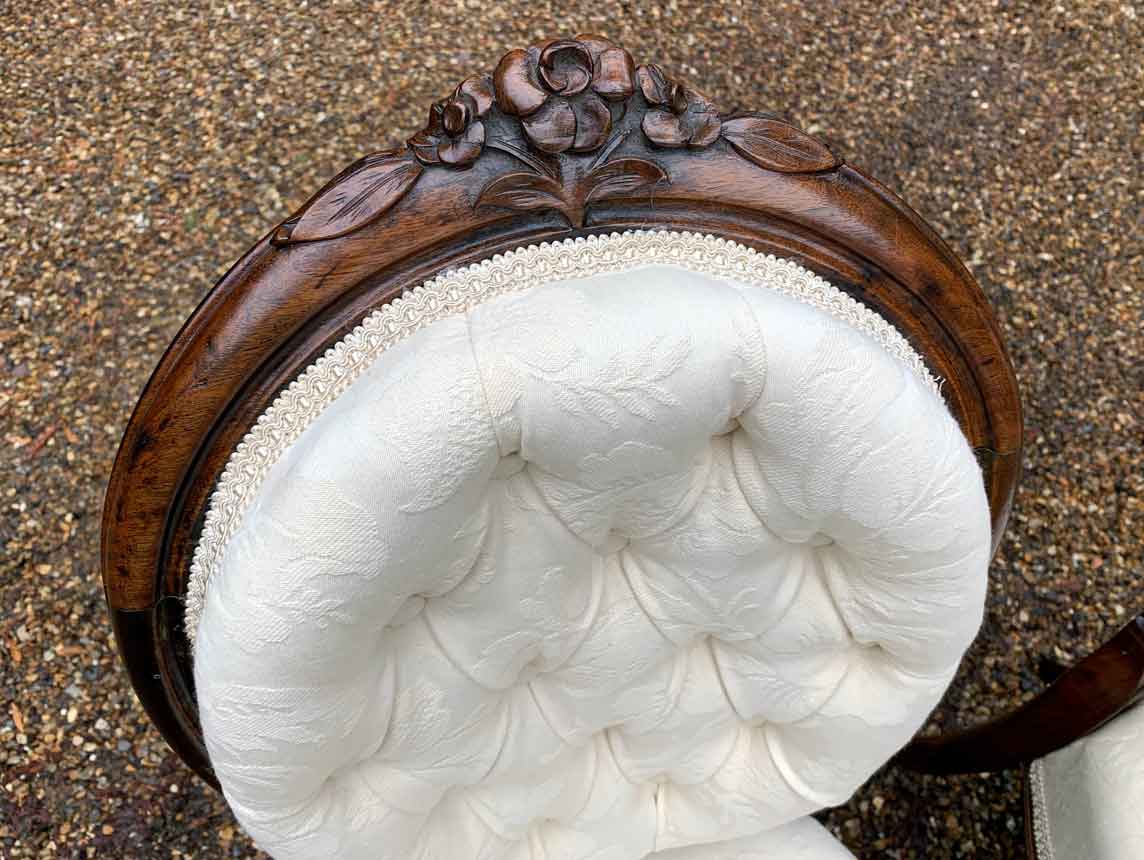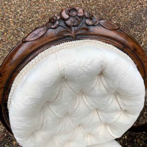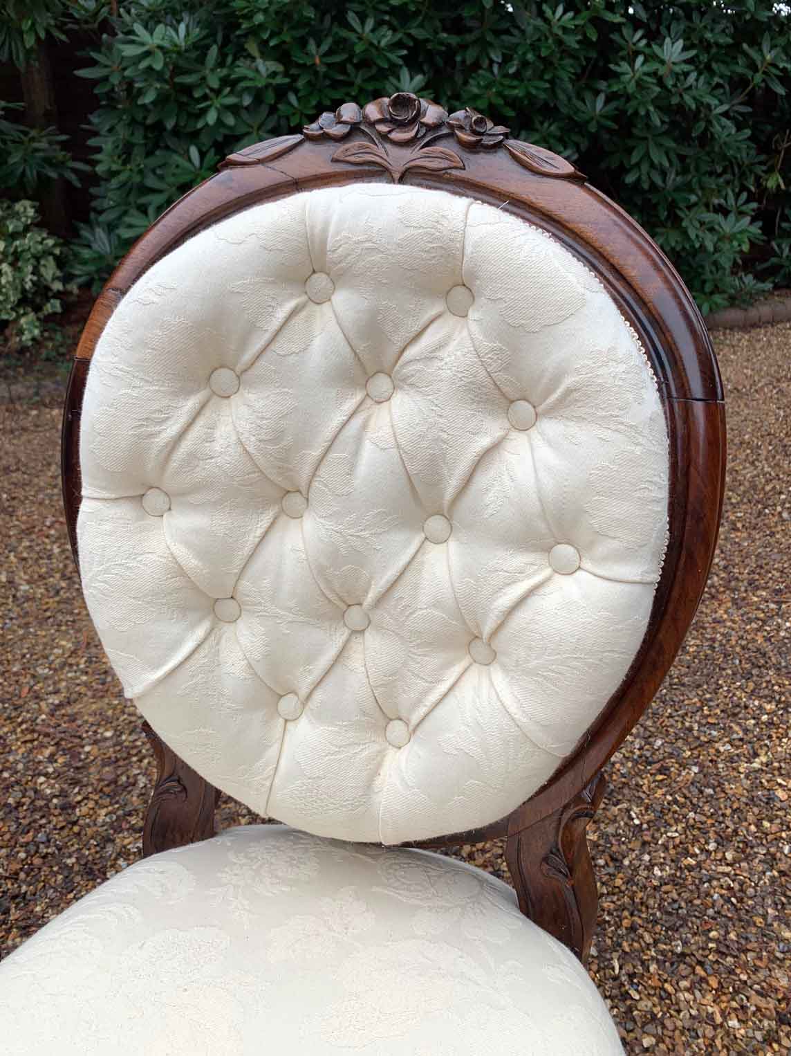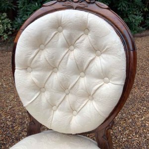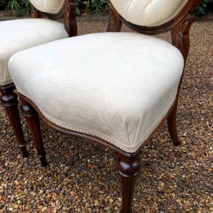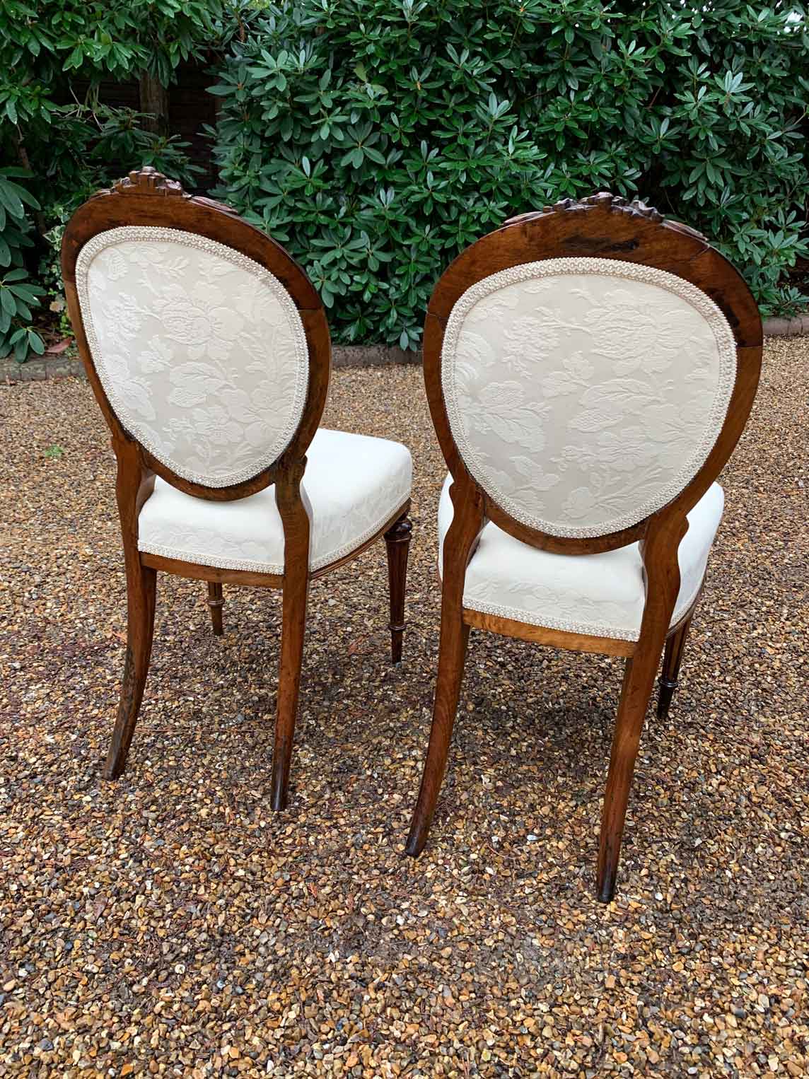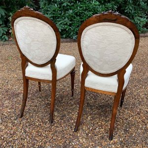 A pair of 19th Century Regency Walnut Chairs with newly upholstered seats with button backs, carving on the top and turned reeded legs.