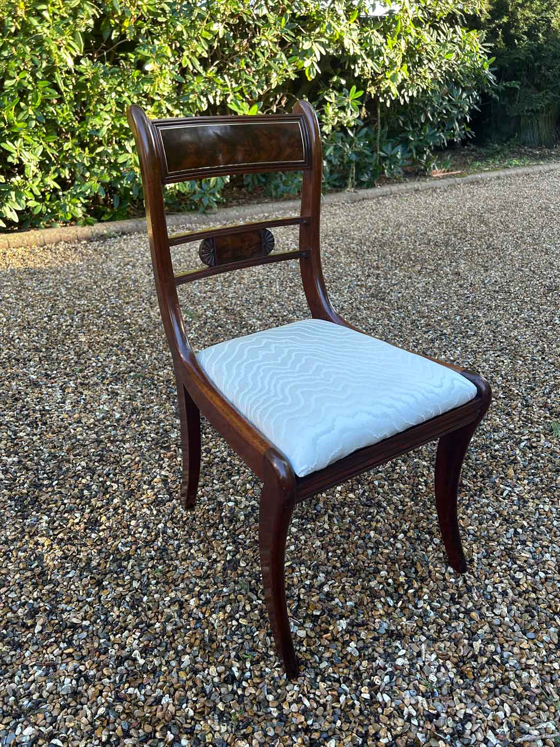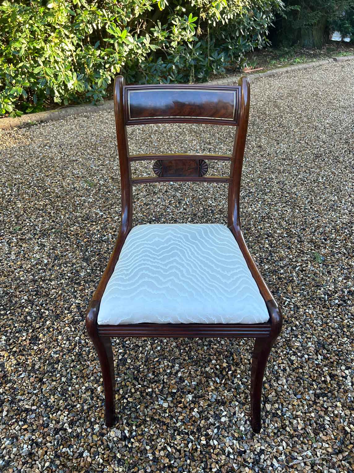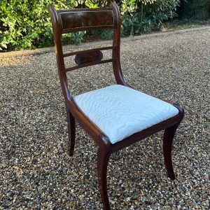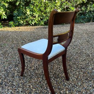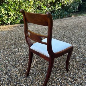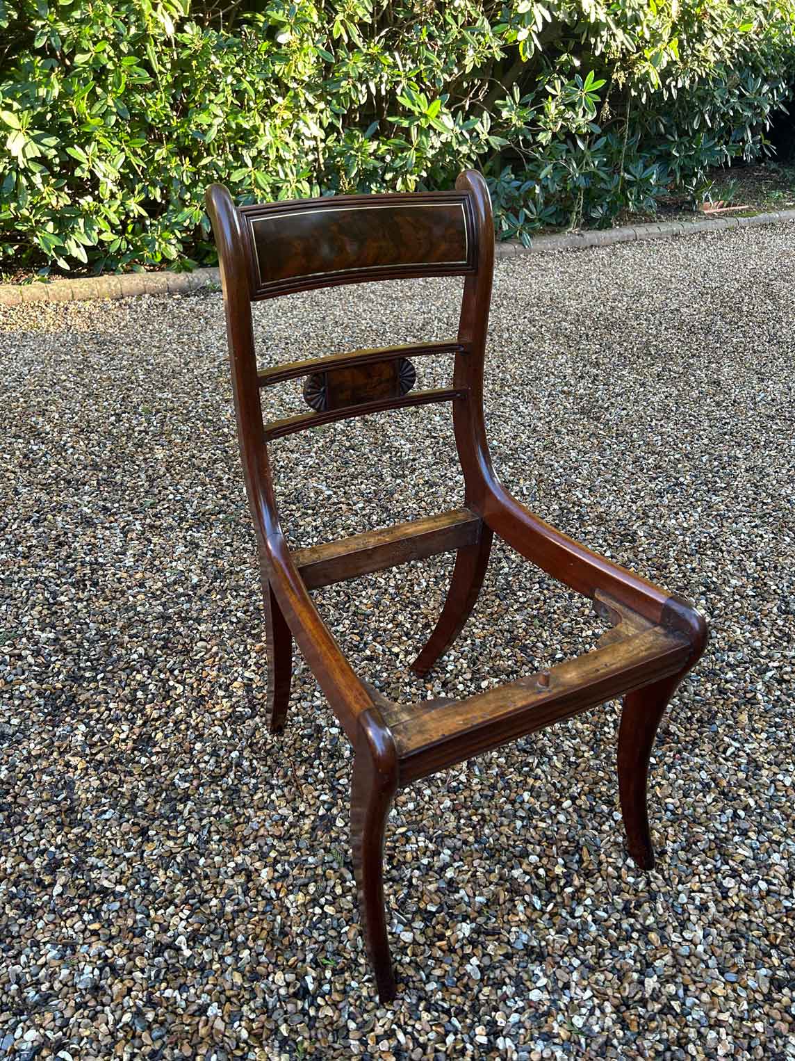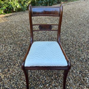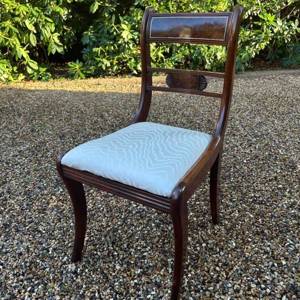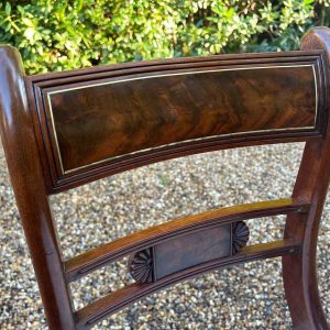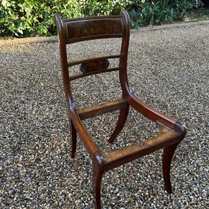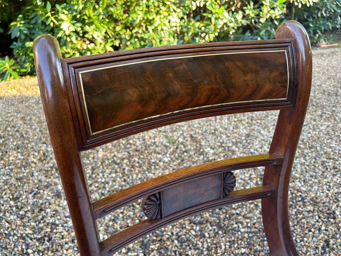 19th Century Regency Mahogany Single Chair with drop in a seat, brass banded figured back and carving with splayed legs