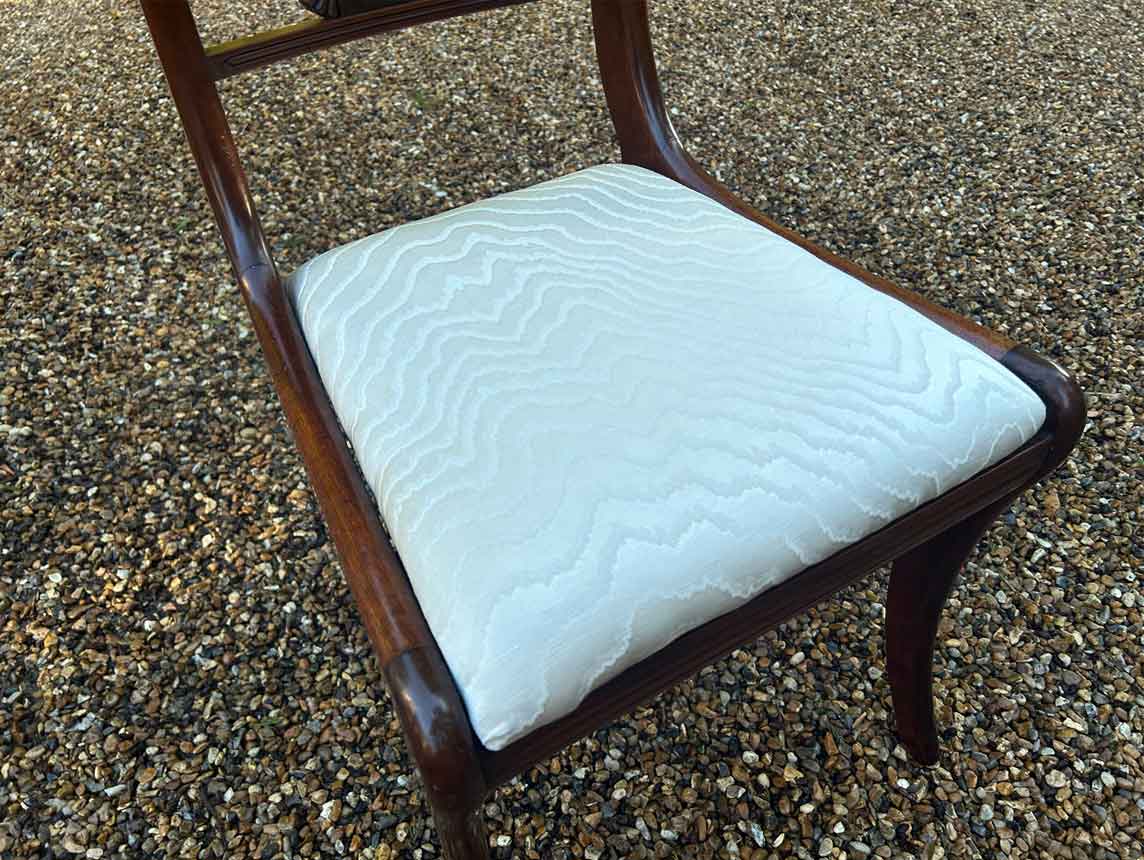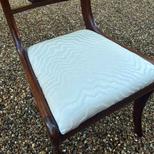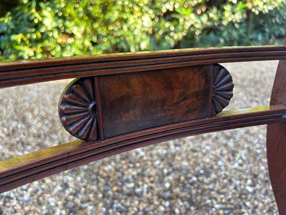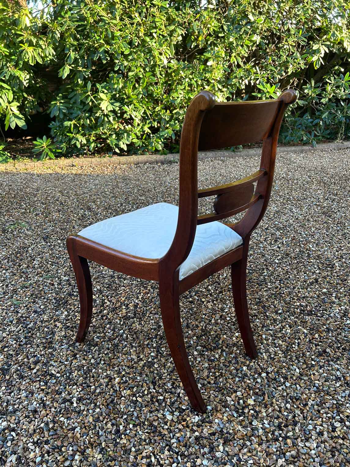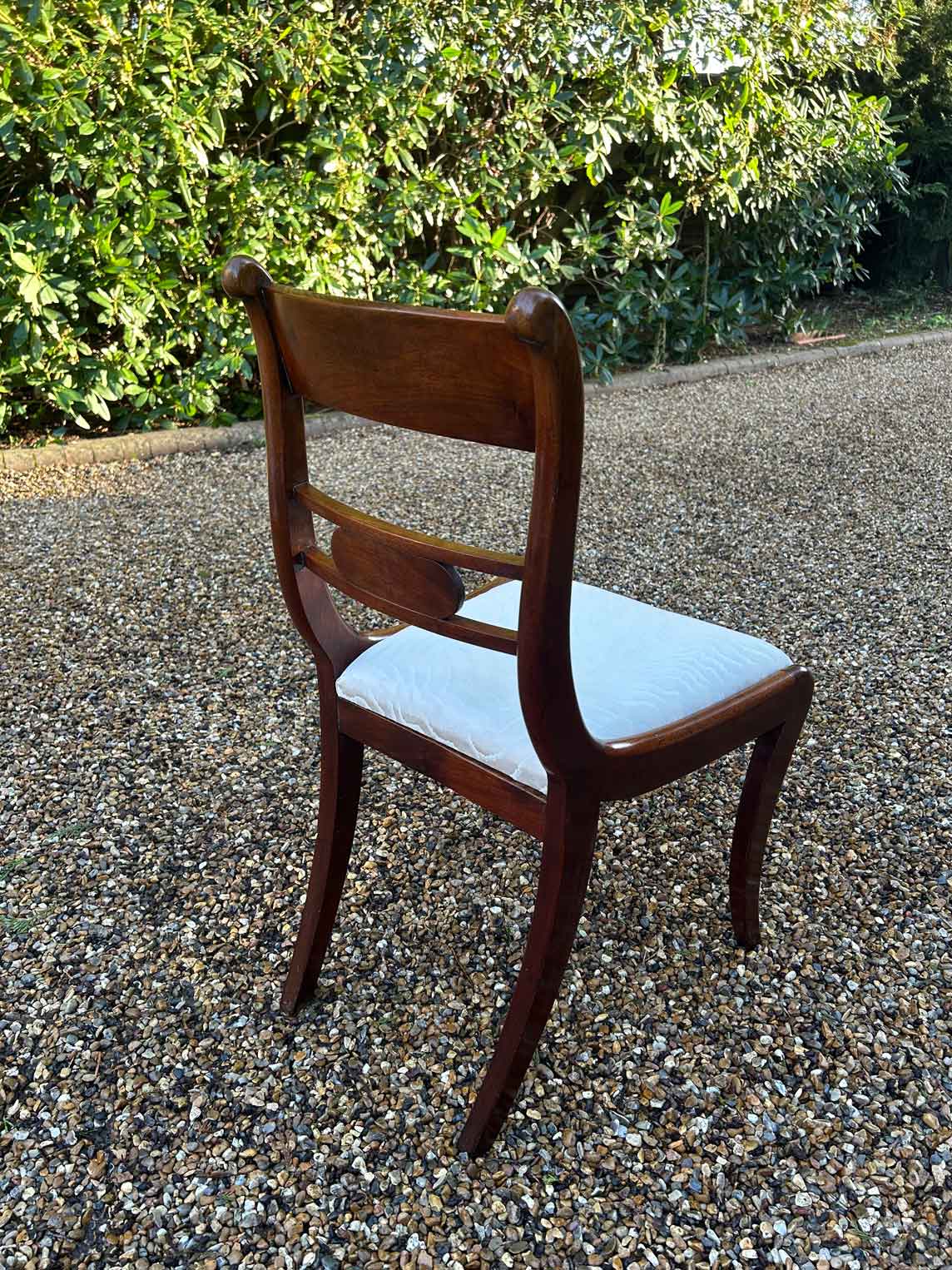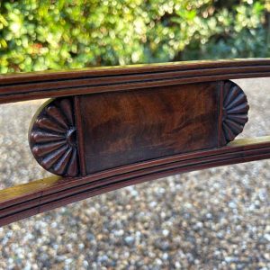 19th Century Regency Mahogany Single Chair with drop in a seat, brass banded figured back and carving with splayed legs