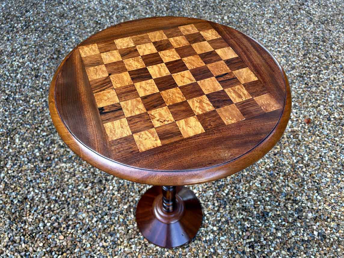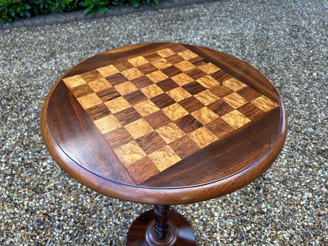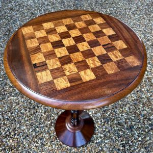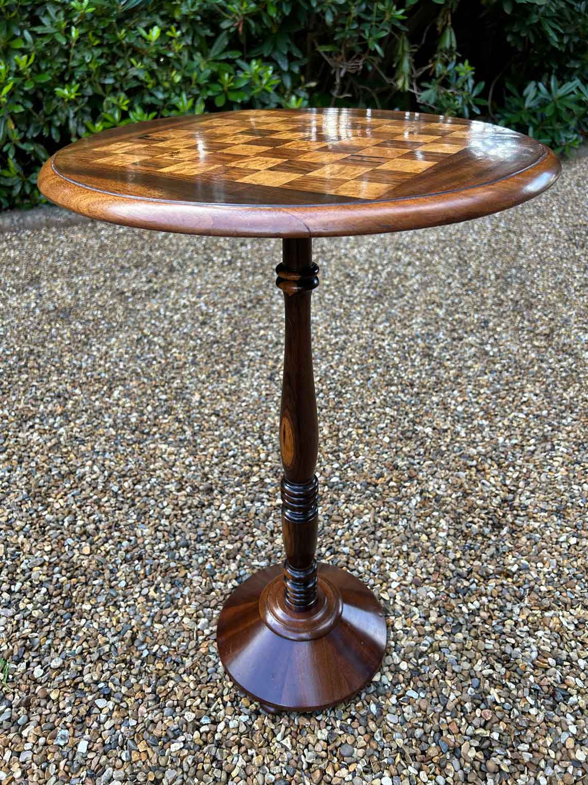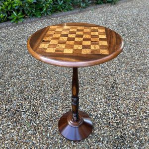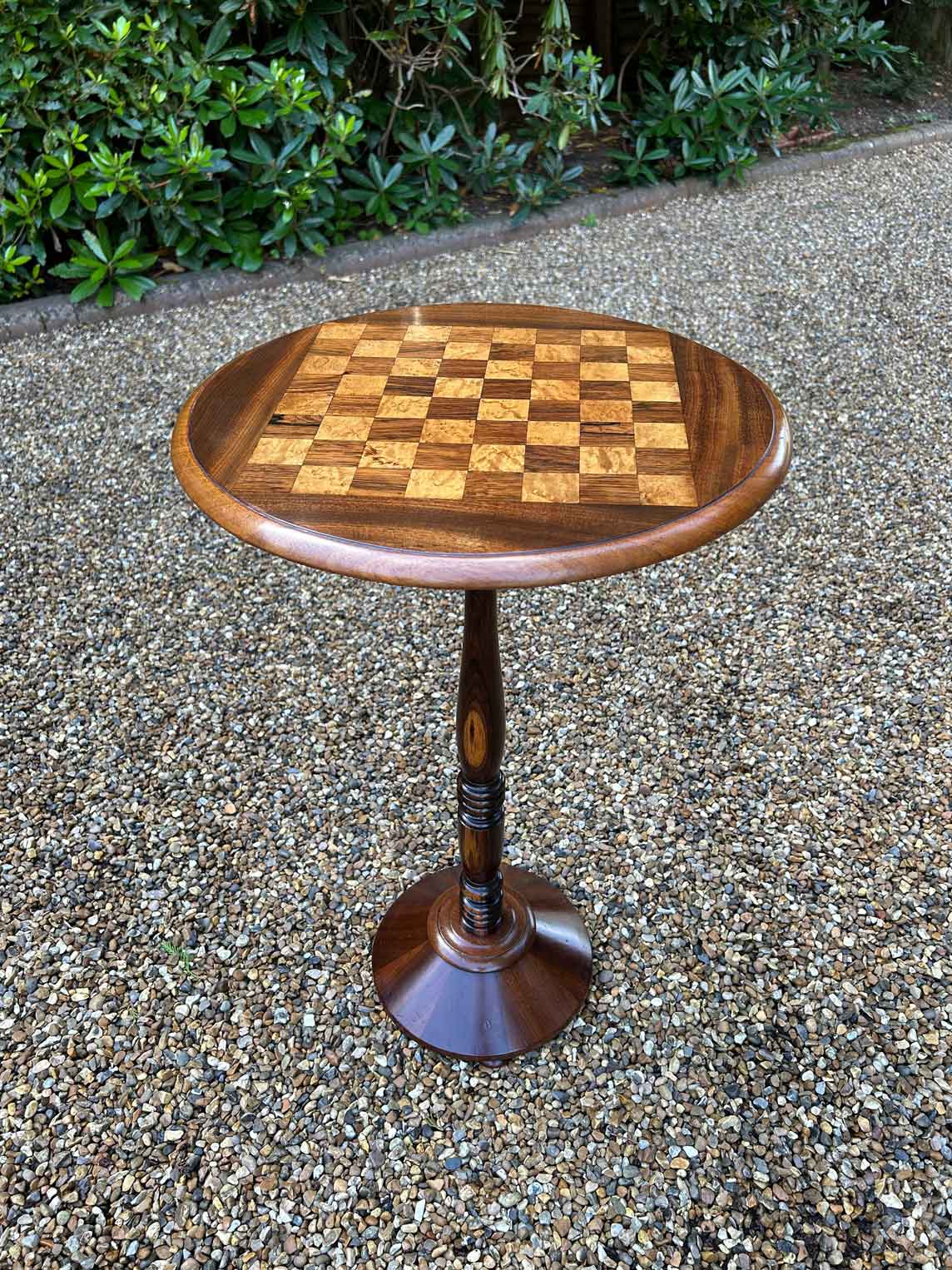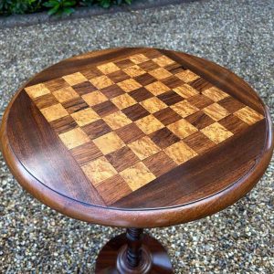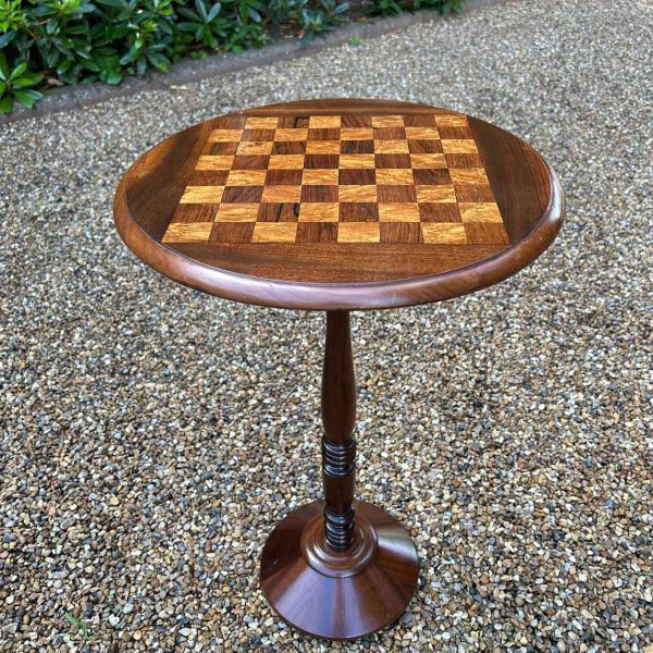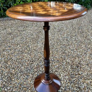 19th Century Mahogany & Rosewood Circular Chess Table with a turned support, base and bun feet.
