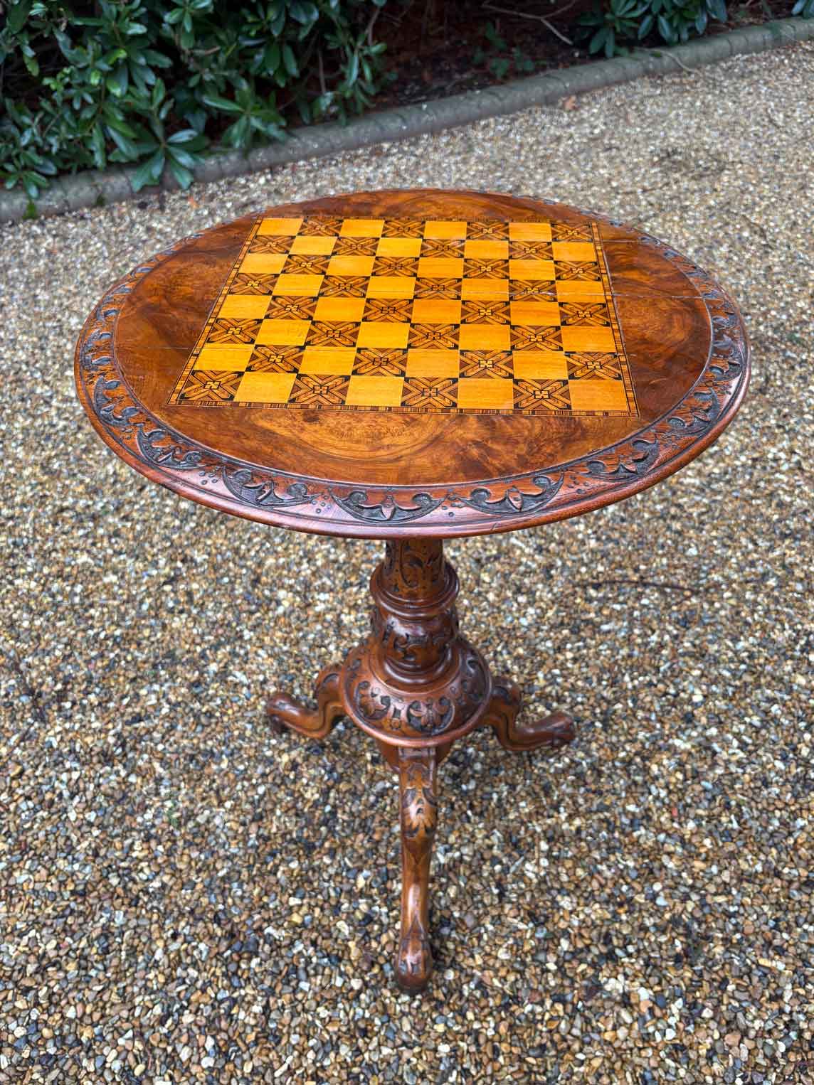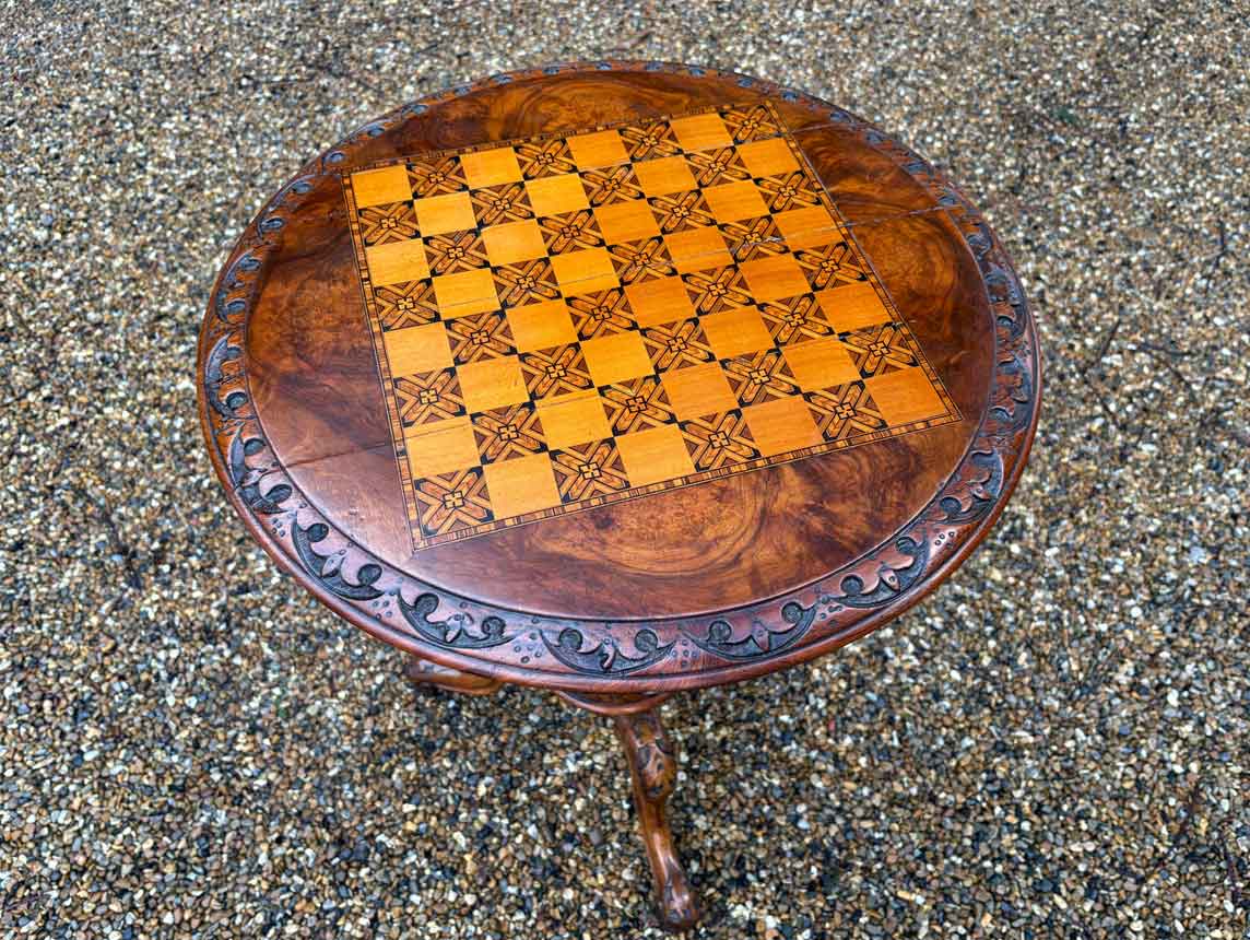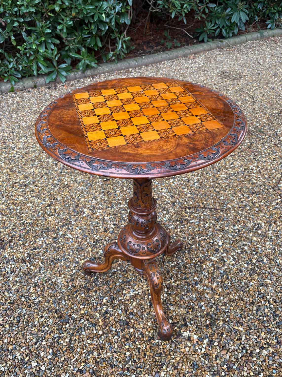 19th Century Figured Inlaid Walnut Chess Table with satinwood, rosewood and boxwood inlay to top. Supported by a cavled turned column on tripod base.