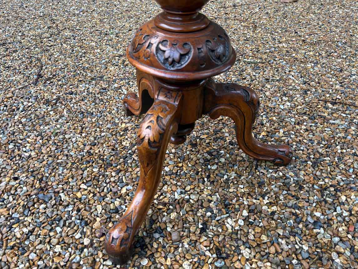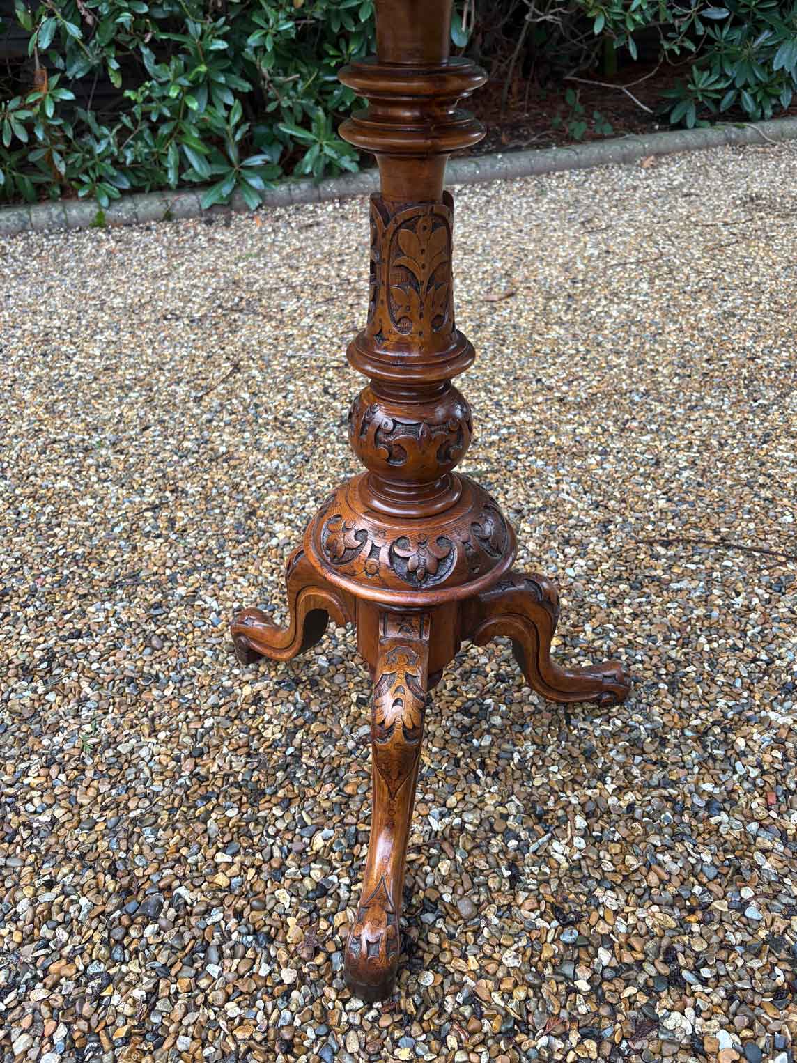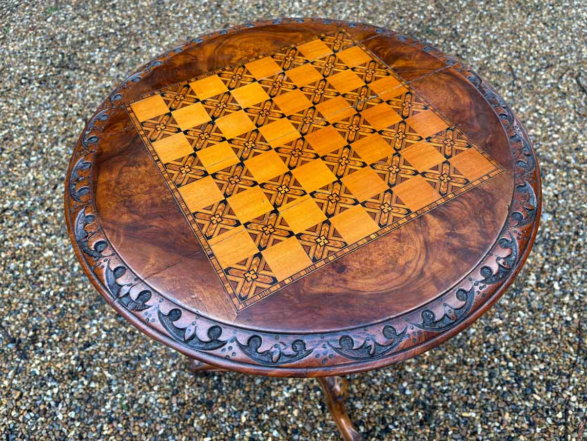 19th Century Figured Inlaid Walnut Chess Table with satinwood, rosewood and boxwood inlay to top. Supported by a cavled turned column on tripod base.