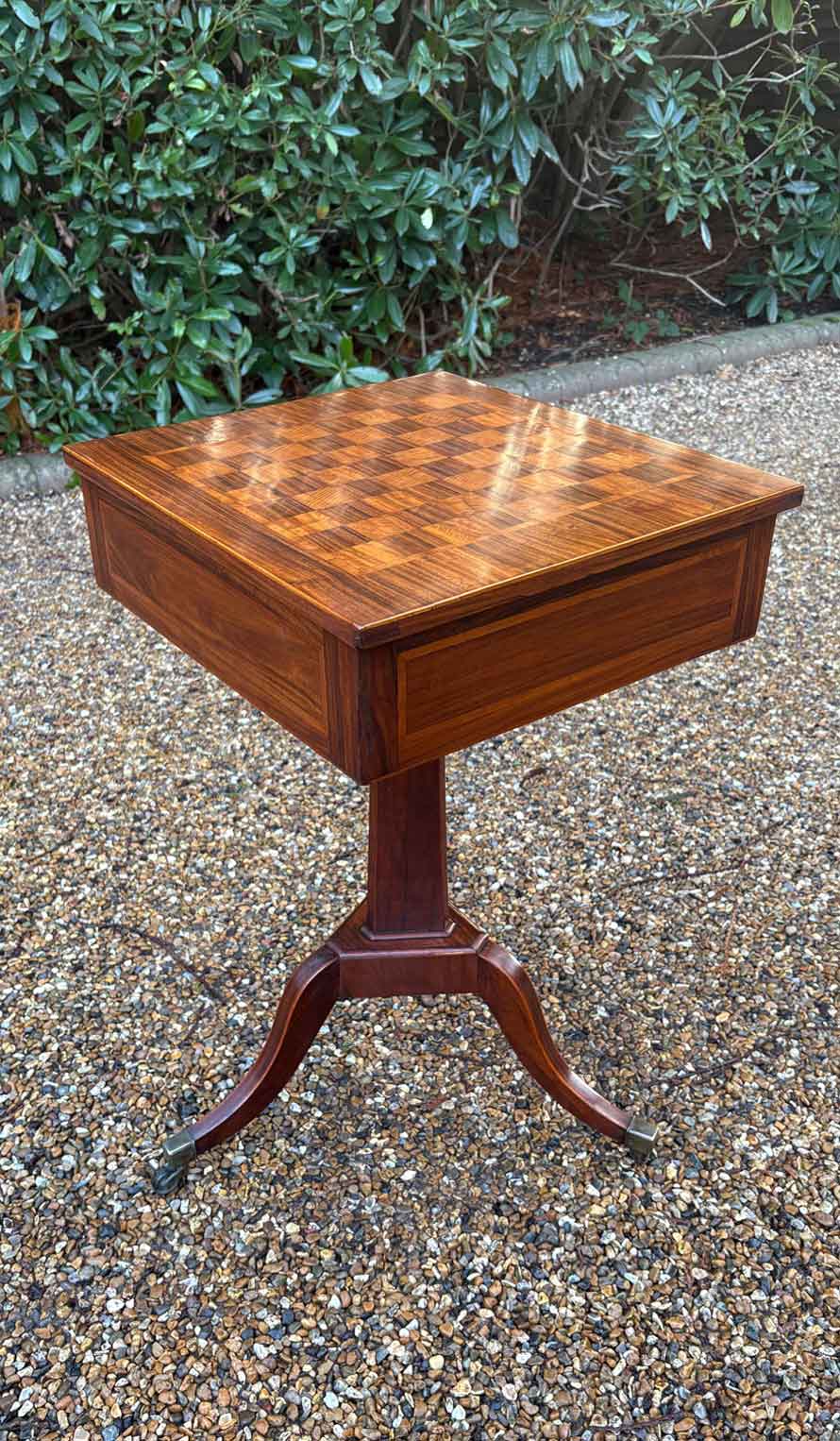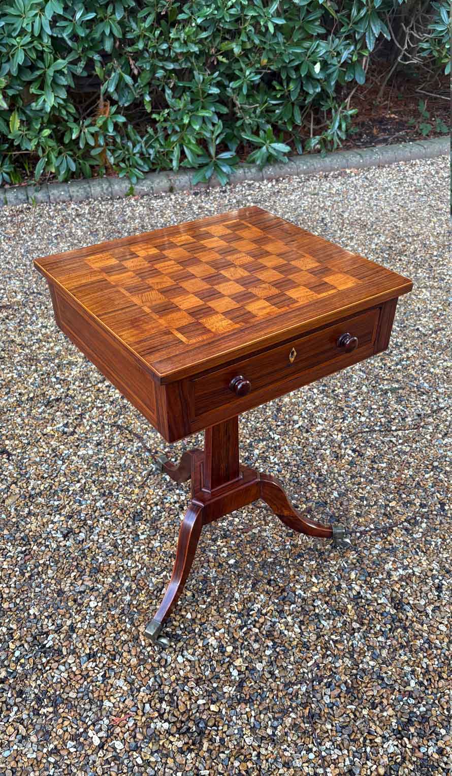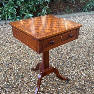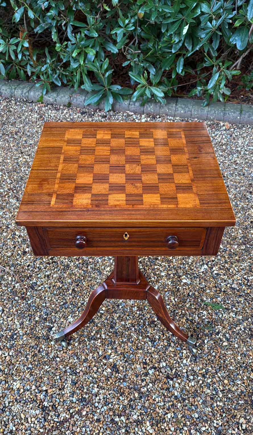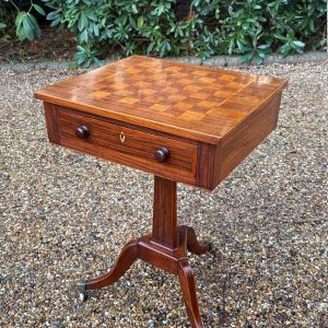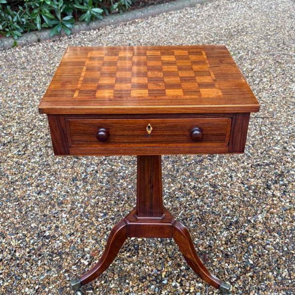 19th Century Regency Rosewood Chess Table with drawer. On a triangle support with three splayed legs and brass cap castors.