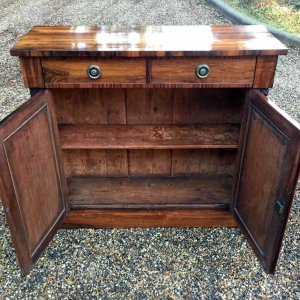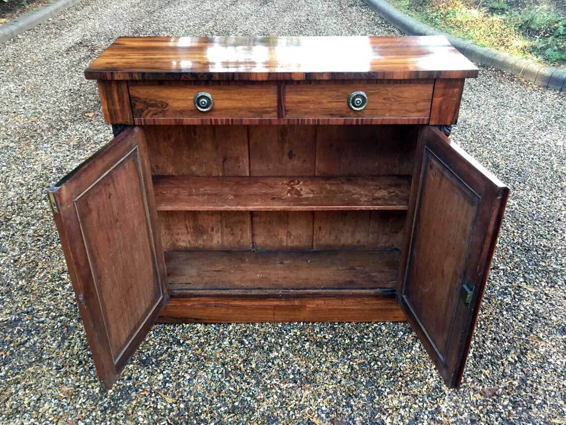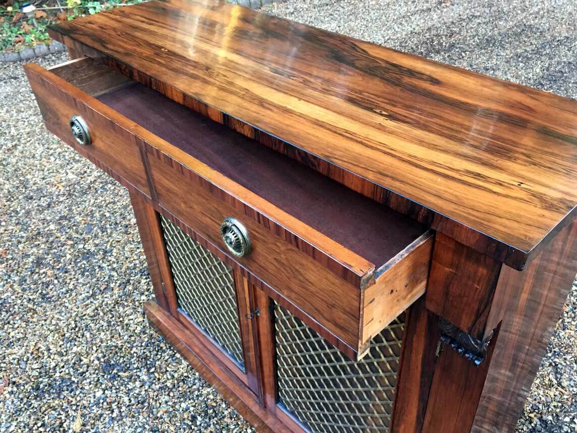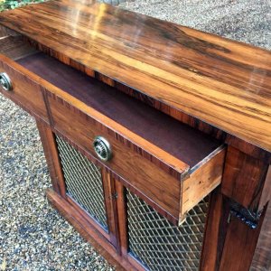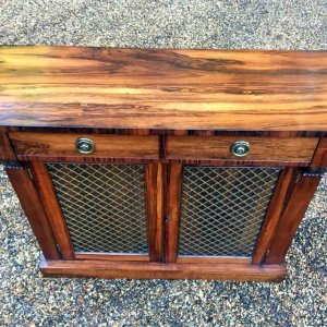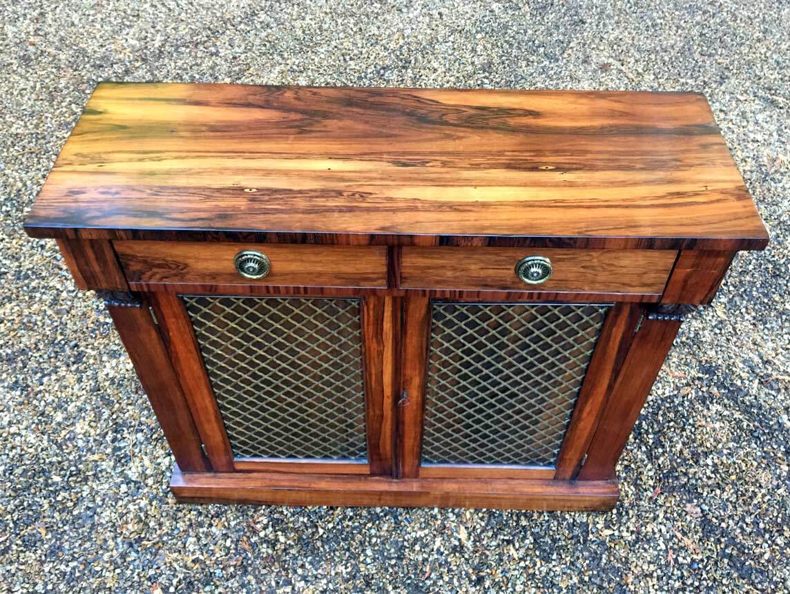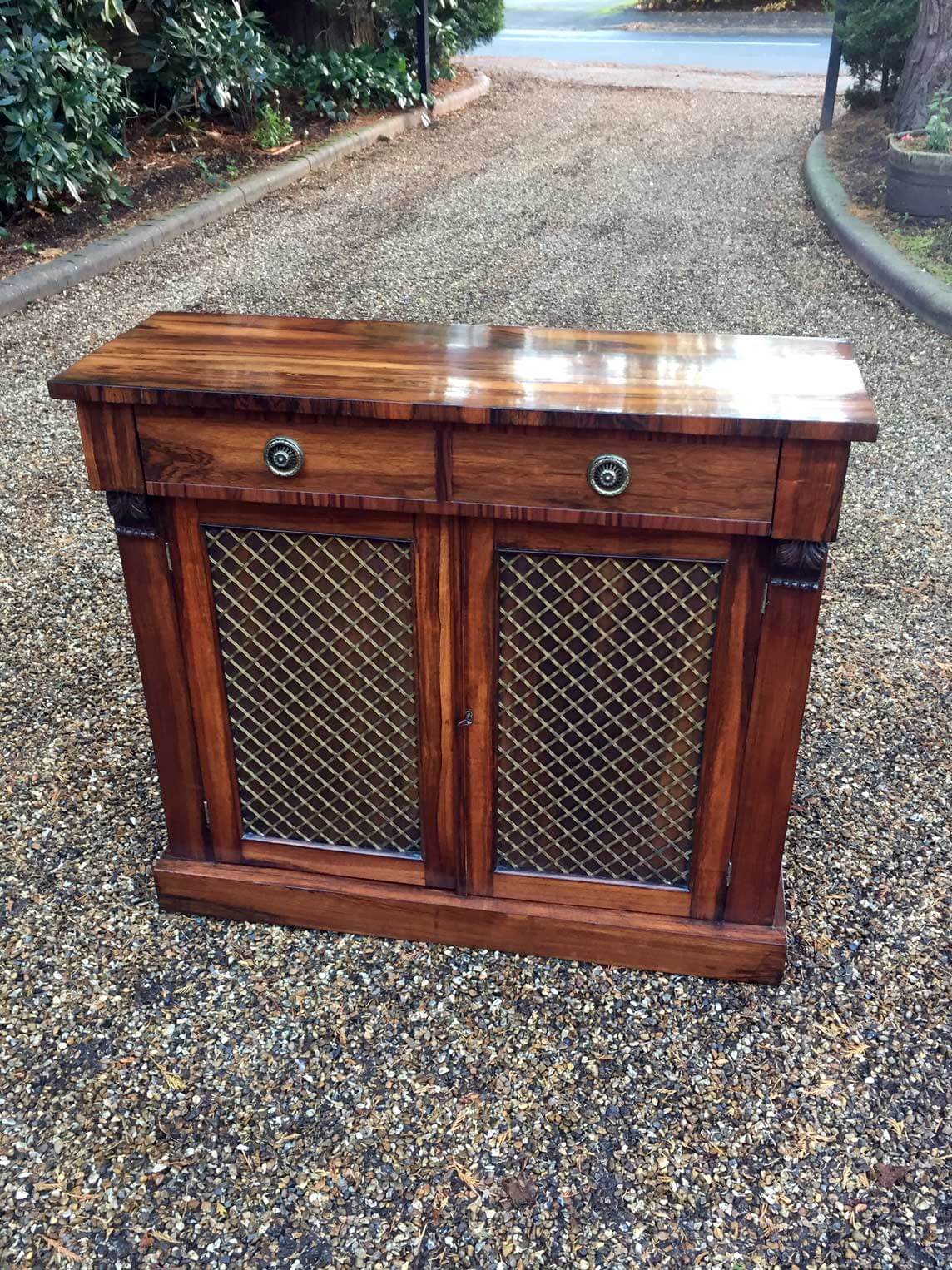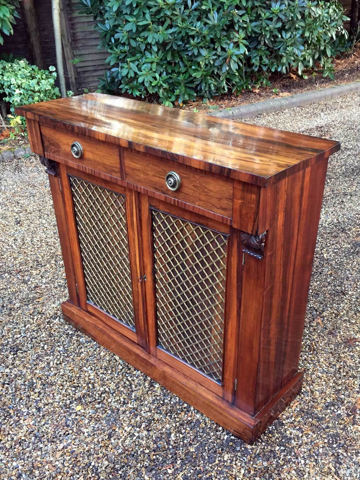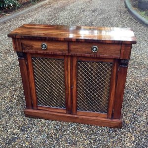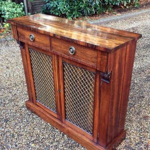 19th Century Rosewood Regency Chiffonier with single drawer and original solid brass ring handles above a brass grille pleated doors and shelf on inside, supported on plinth base.