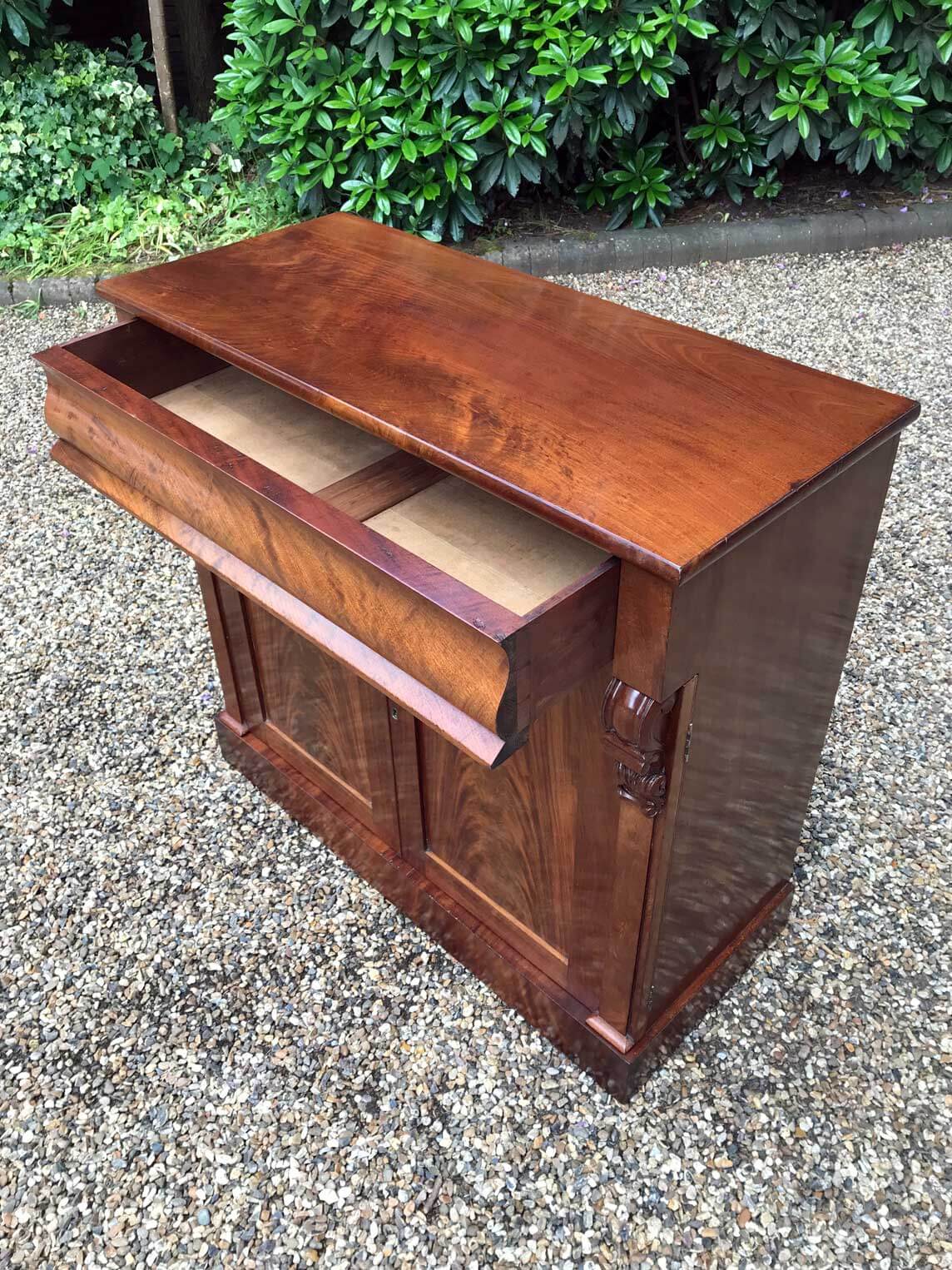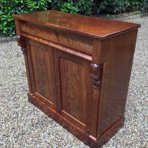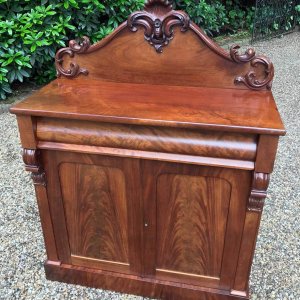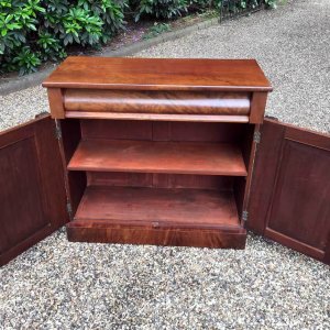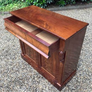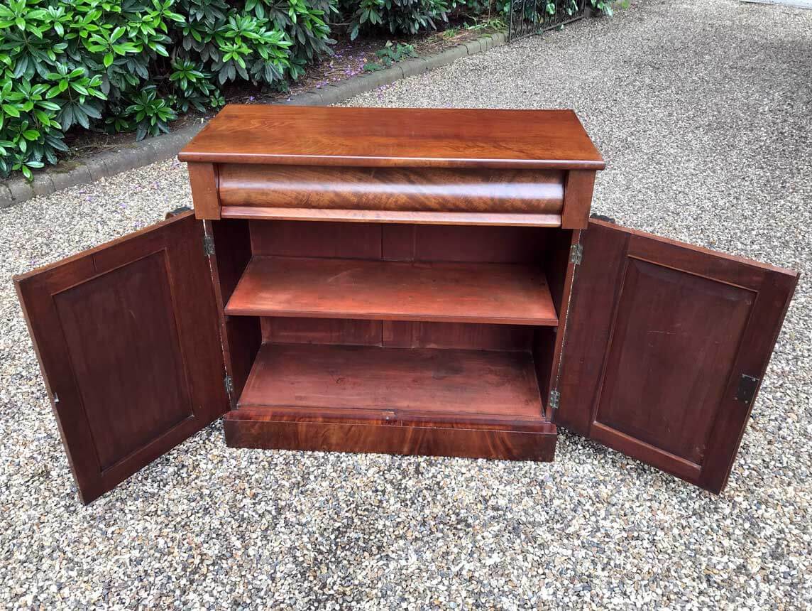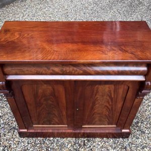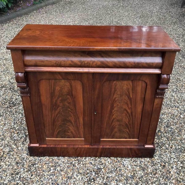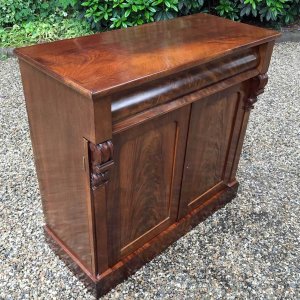 19th Century Mahogany Chiffonier with single cushion frieze drawer and cupboard, enclosed by two arched panel doors with a shelf on inside, supported on a plinth base.