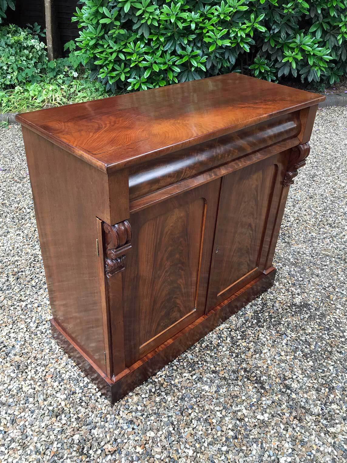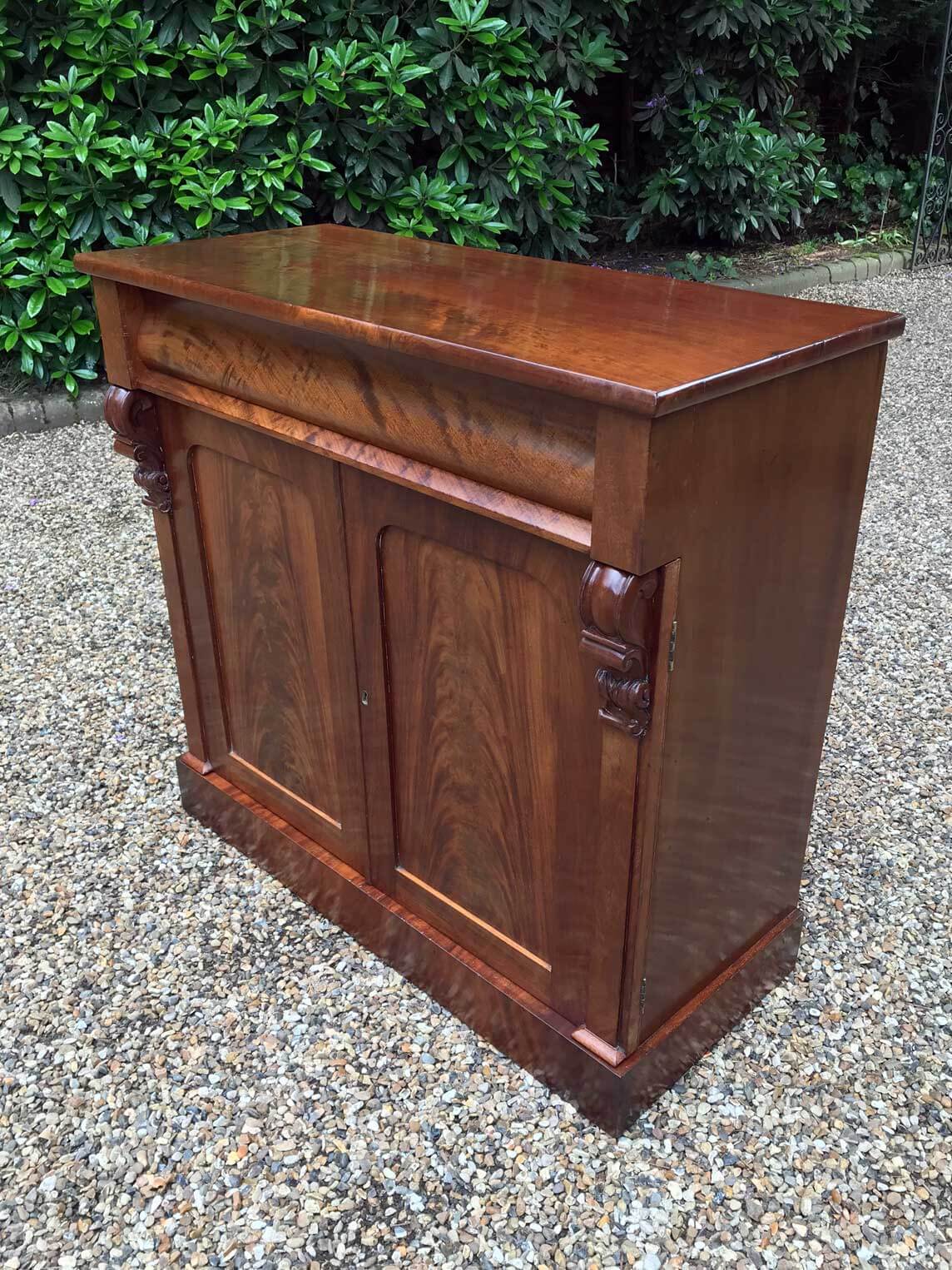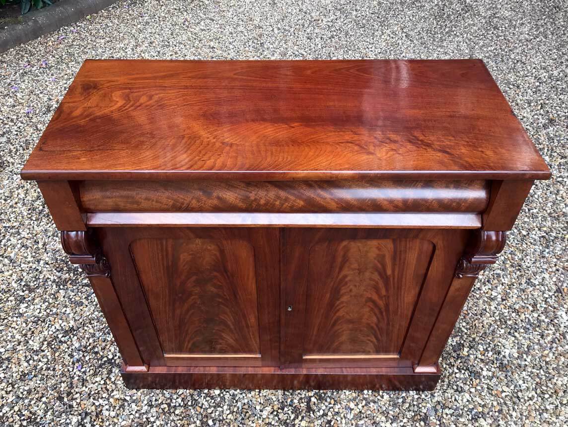 19th Century Mahogany Chiffonier with single cushion frieze drawer and cupboard, enclosed by two arched panel doors with a shelf on inside, supported on a plinth base.