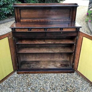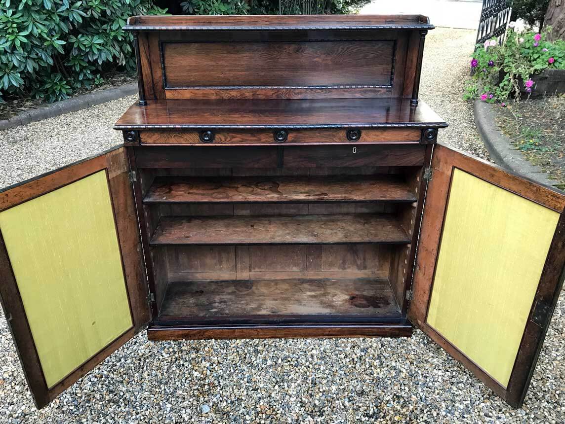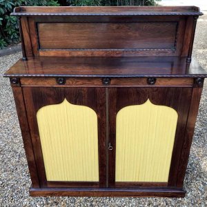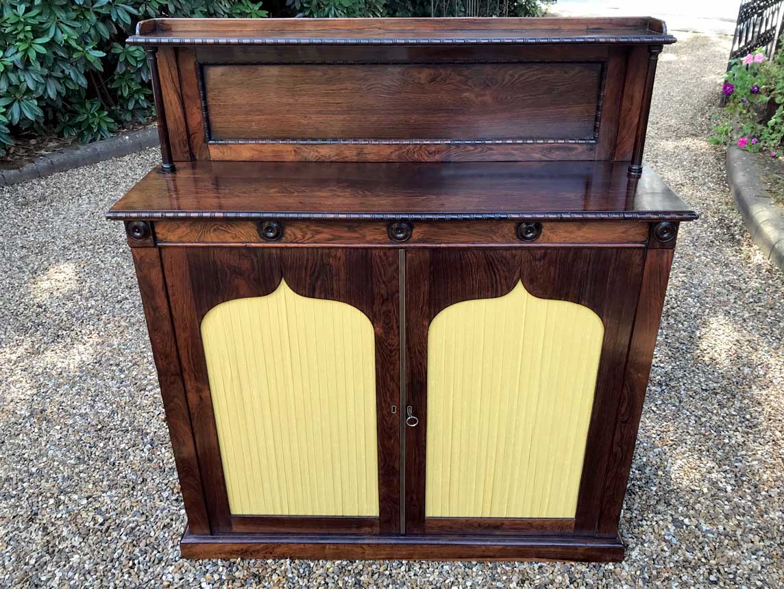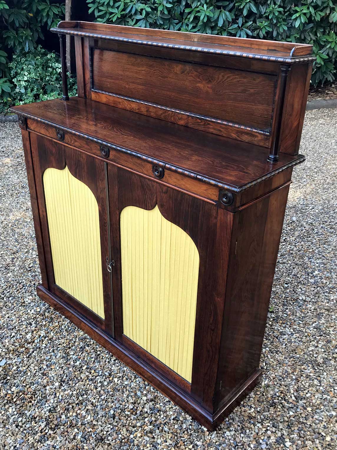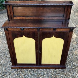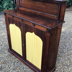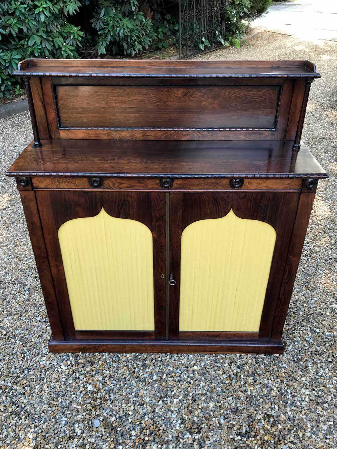 Regency Rosewood Chiffonier with a Shelf Back above a pair of panel doors inset with fabric panels and two drawers & shelves on inside the cupboard on plinth base.