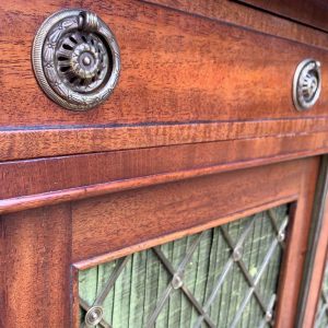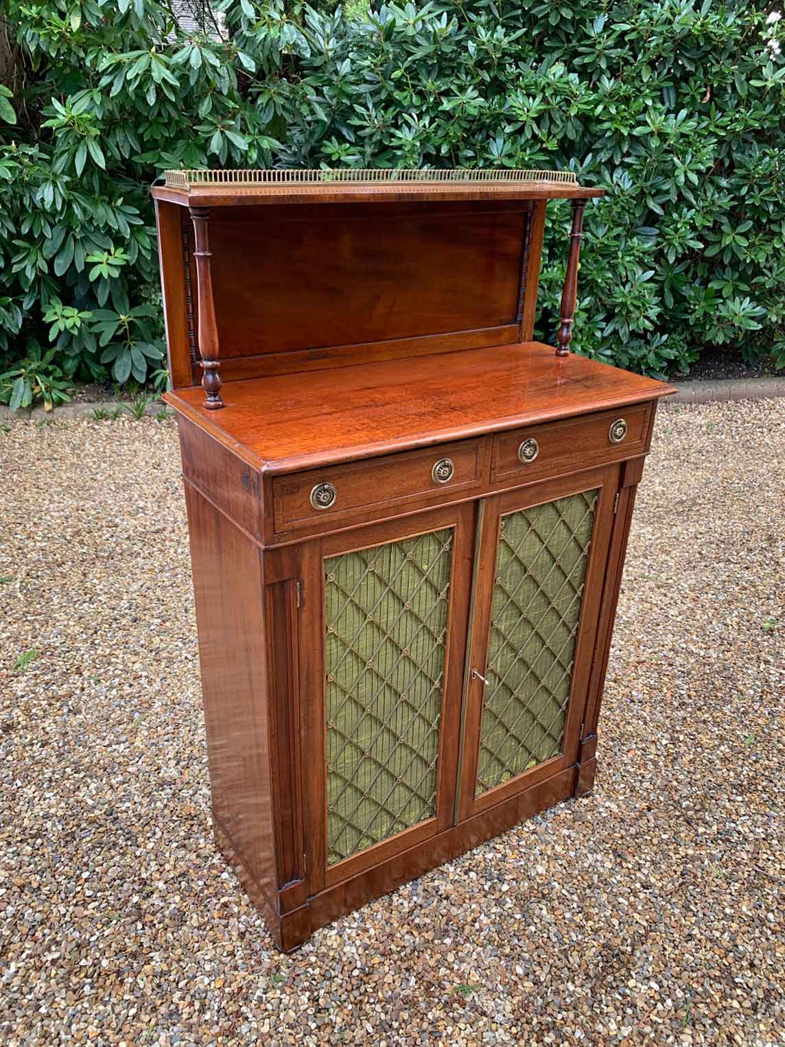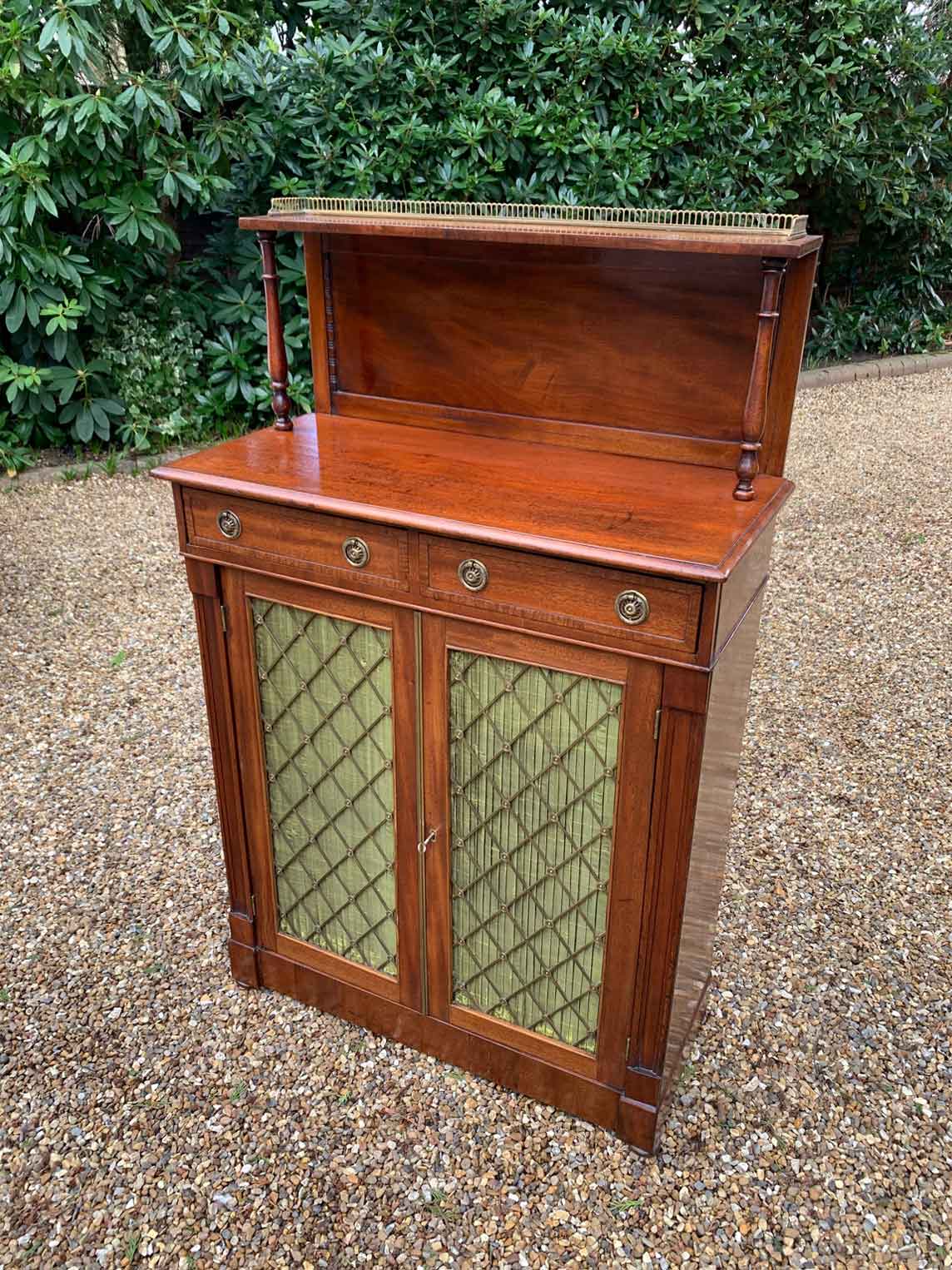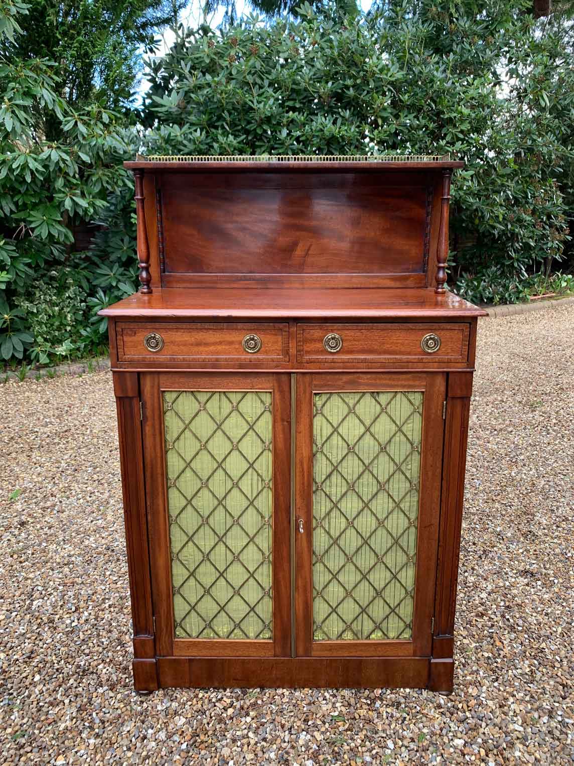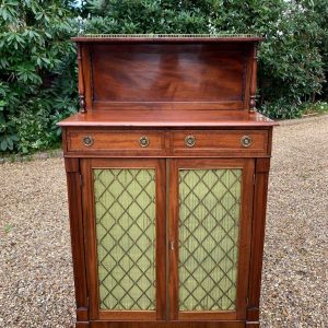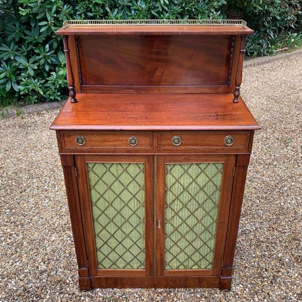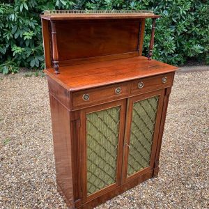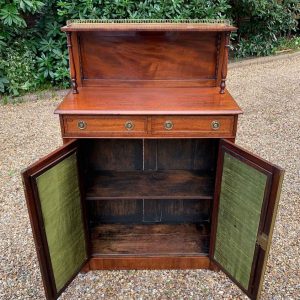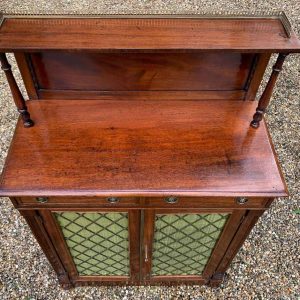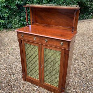 19th Century Mahogany Victorian Chiffonier, with two drawers with brass ring handles. Supported by baluster turned columns with a brass gallery on top, above moulded freize and brass grille pleated doors, supported on plinth base.